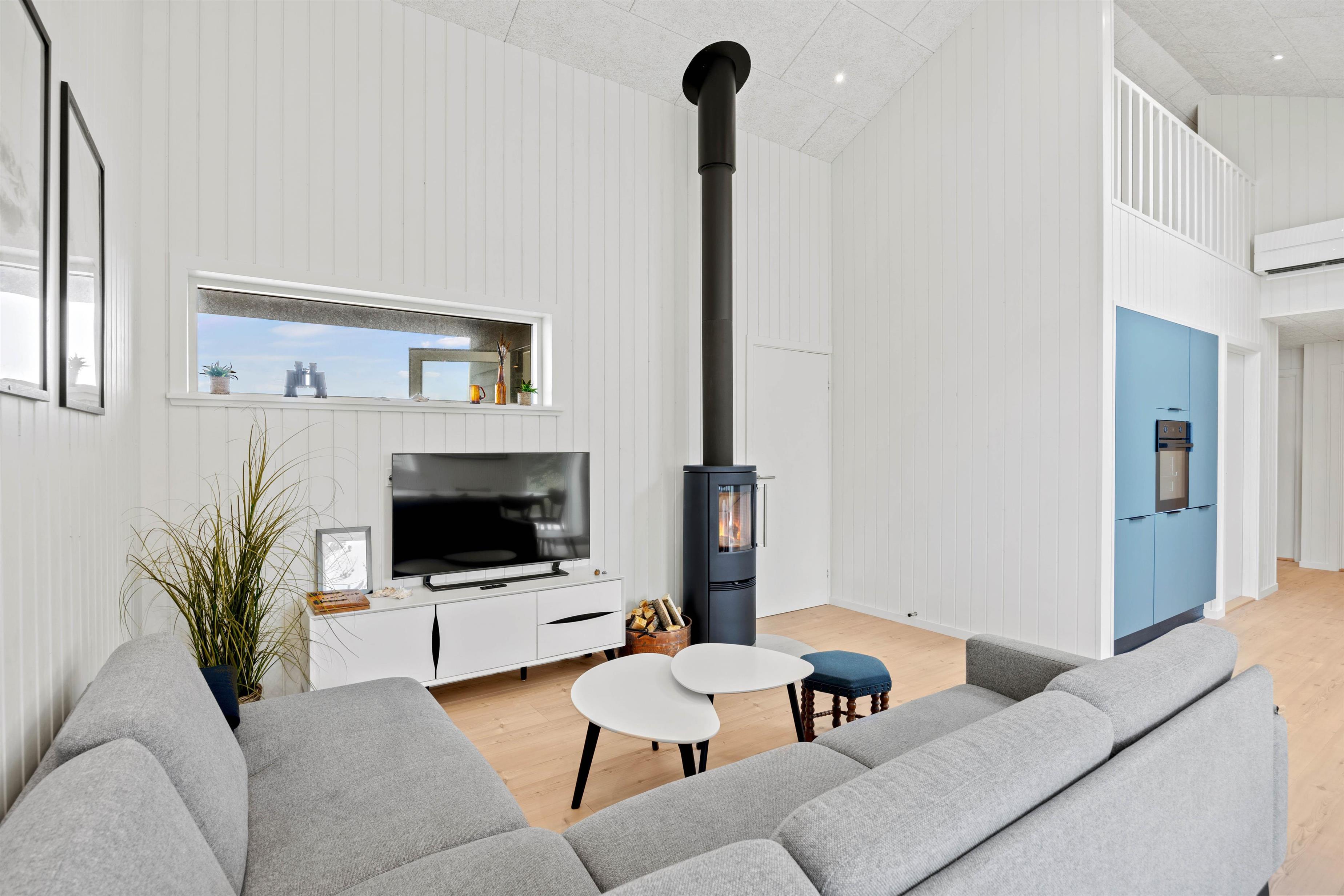 Indretningen er præget af den klassiske sommerhusstemning med et åbent opholdsrum, hvor brændeovnen skaber varme og hygge på kølige dage, og den energibesparende varmepumpe sørger for et behageligt indeklima året rundt. Til afslappede aftener er der også fjernsyn med danske tv-kanaler.