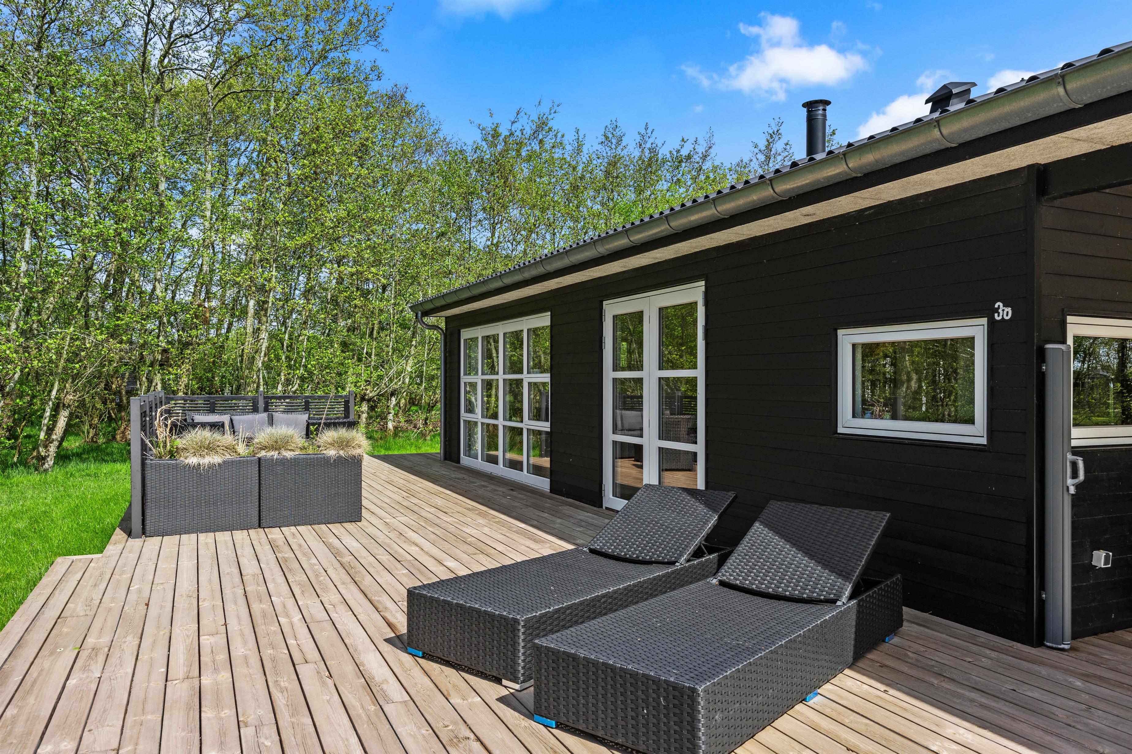 Den skønne træterrasse har både et åbent og et overdækket afsnit. De mange komfortable havemøbler og grill gør det nemt at tilbringe lune aftener udendørs, mens børnene leger på den store plænegrund, som giver masser af plads til at lege og gå på opdagelse.