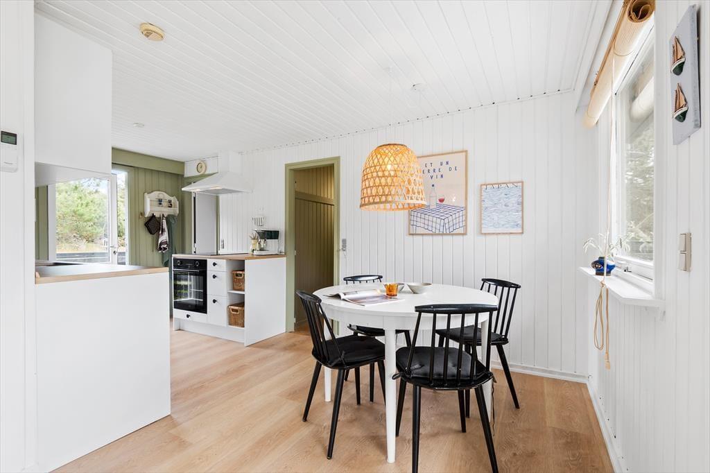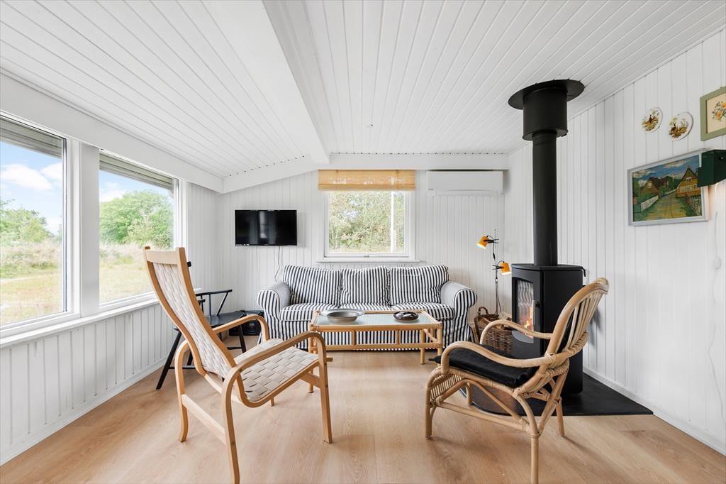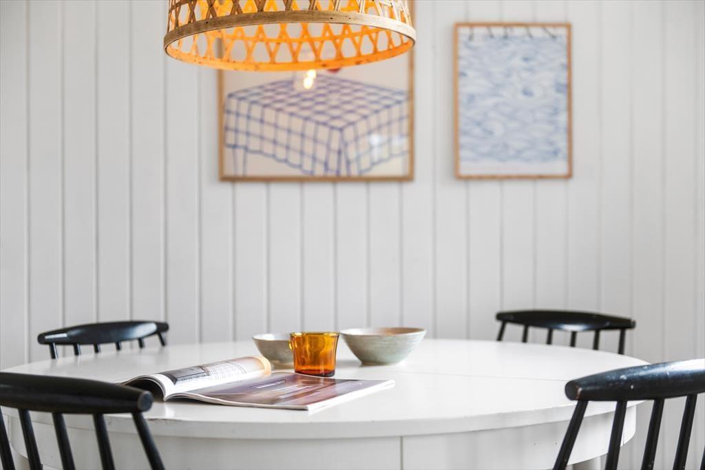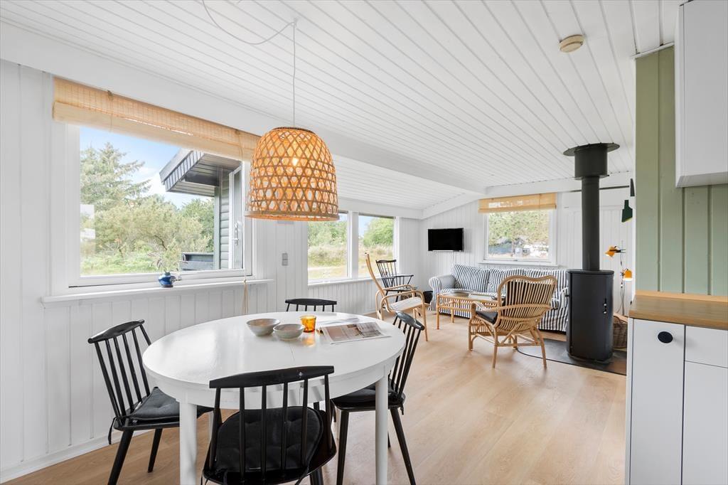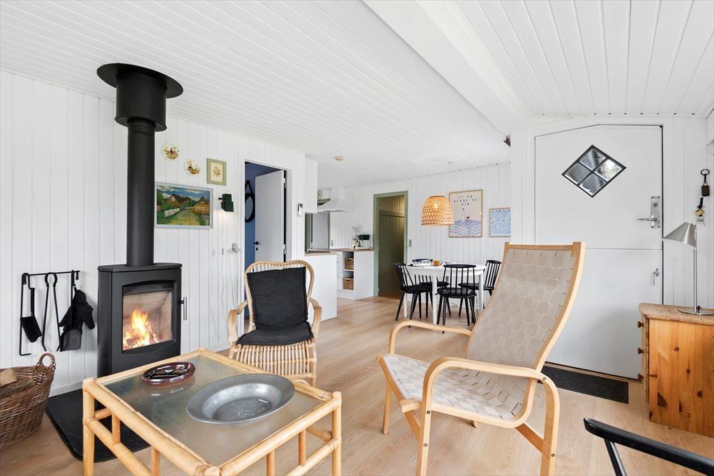 Vejret og årstiden har sikkert indflydelse på, hvor størstedelen af ferien kommer til at foregå. Og på de dage, hvor der er lagt op til indendørs hygge, kan du glæde dig til at slænge dig i en af sofaerne i husets charmerende stue, der blandt andet er udstyret med brændeovn, fladskærms-tv og spisebord nær det åbne køkken. Netop køkkenet bliver udskiftet i 2024, og på samme tid er bliver farvetonerne lysnet inden døre. Med andre ord bliver det altså om muligt en endnu større fornøjelse at holde til i husets rare og charmerende omgivelser.