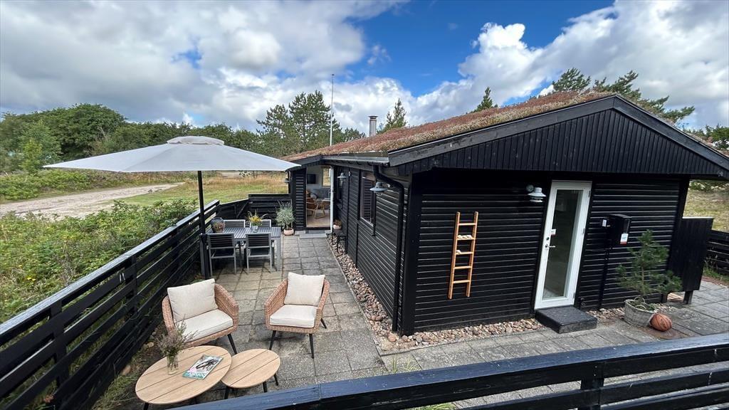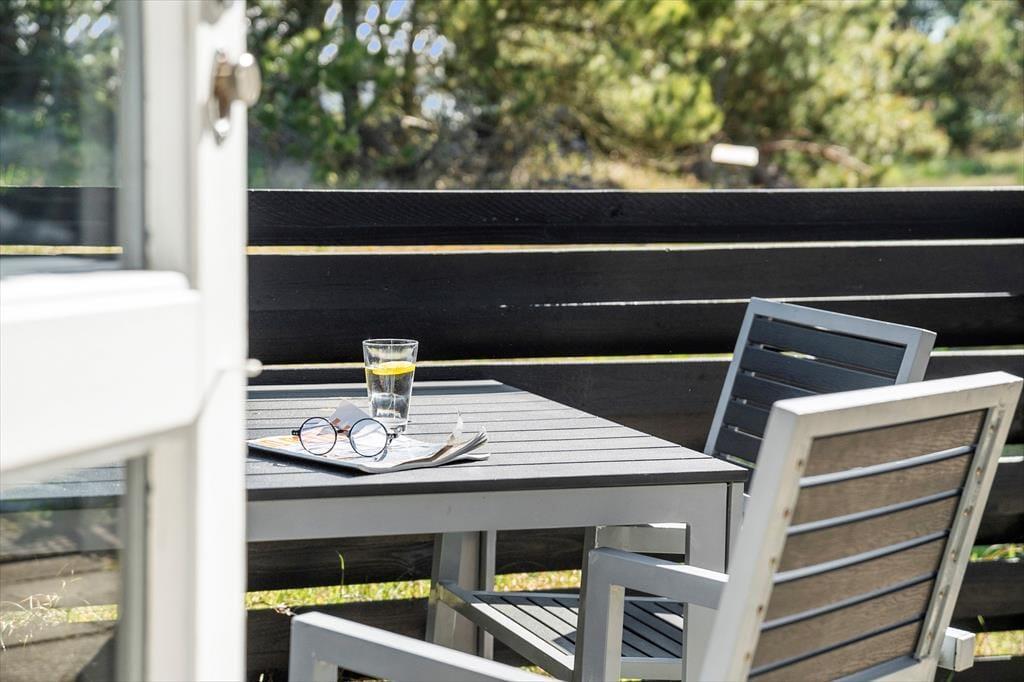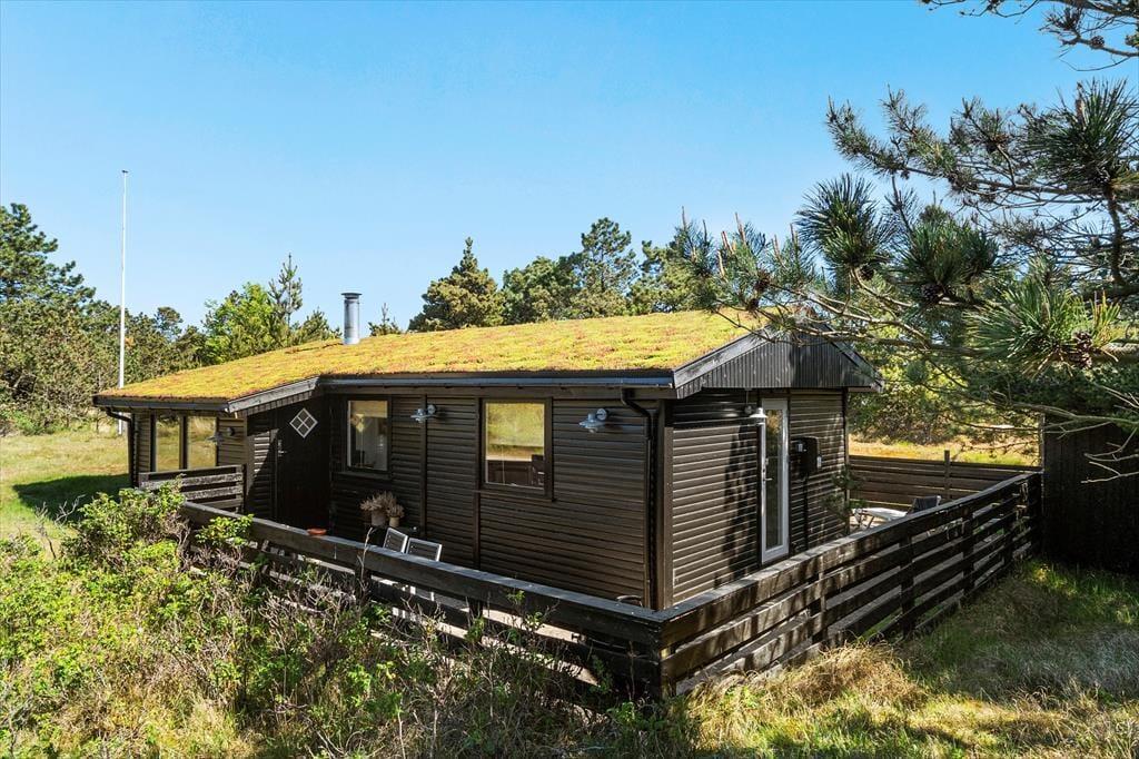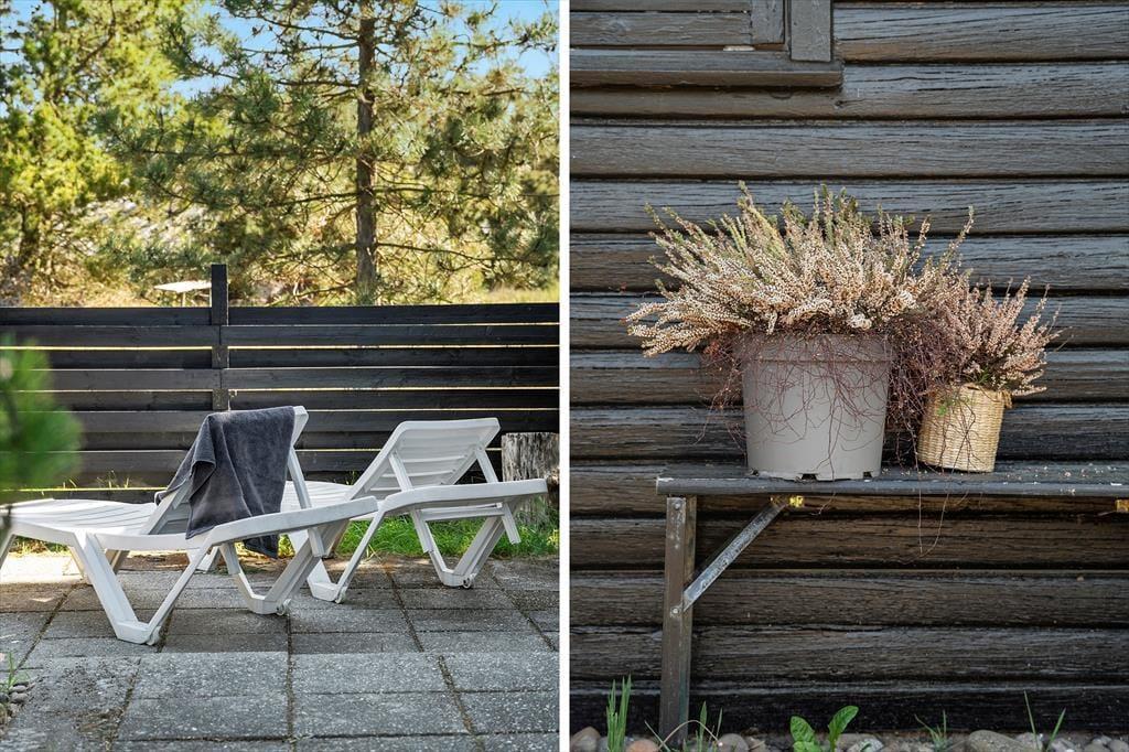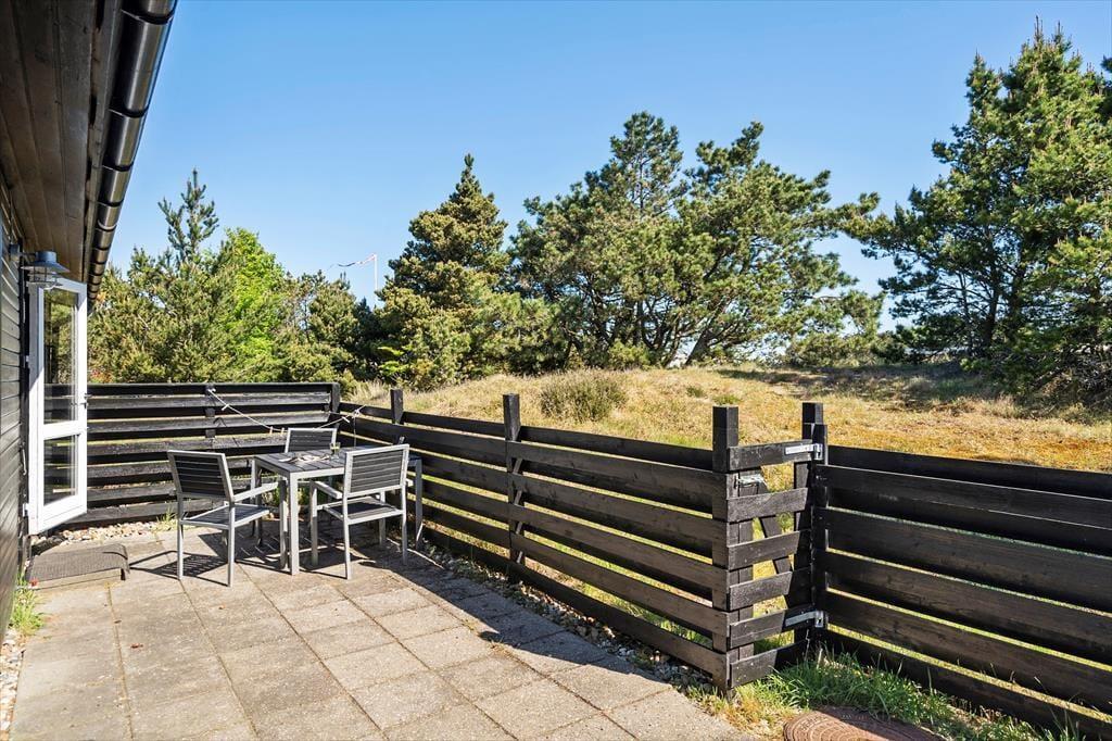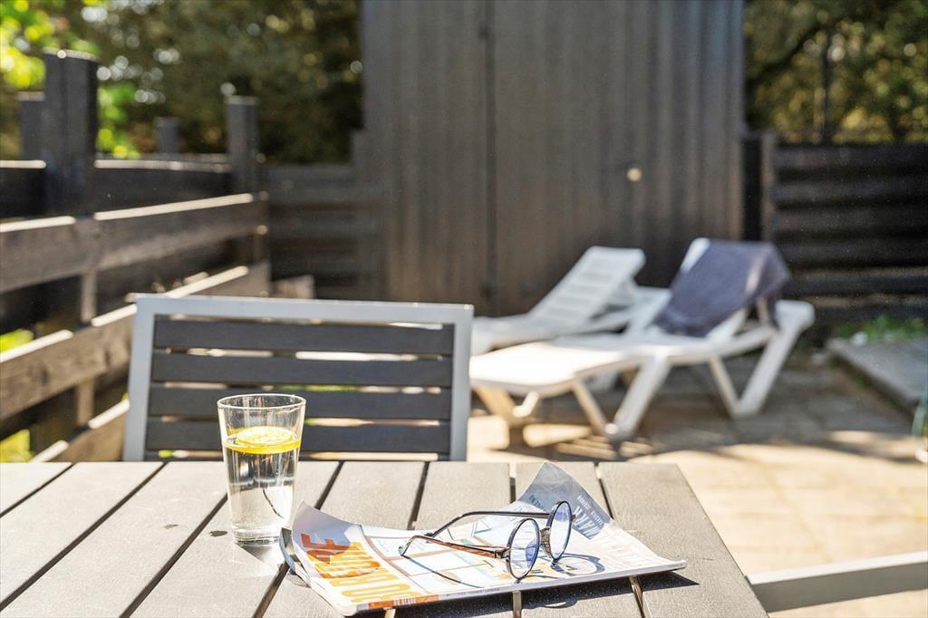 Det klassiske træhus ligger på en stor naturgrund, der har en varieret bevoksning med åbne arealer, tætte hybenbuske og krogede fyrretræer. Her kan du trække vejret dybt ned i lungerne og straks føle dig hjemme, for det er dejlige og velduftende omgivelser at opholde sig i – uanset om du leger med børnene på plænen eller slapper af i en havestol på husets dejlige terrasse. Terrassen er for øvrigt helt aflukket med hegn, så du kan drikke kaffe i ret ugenerede omgivelser, og hvis børnene er små, er det rart at vide, at de har en tryg ramme at hygge sig i.