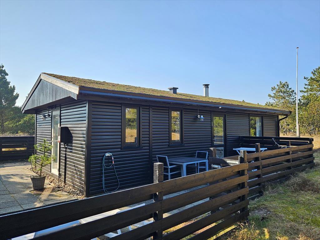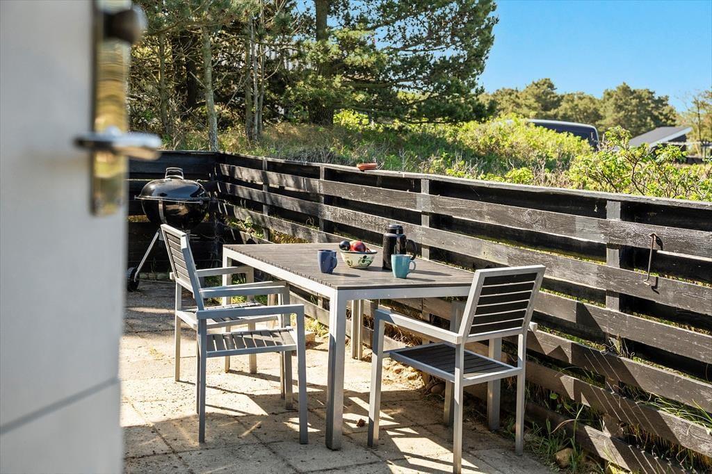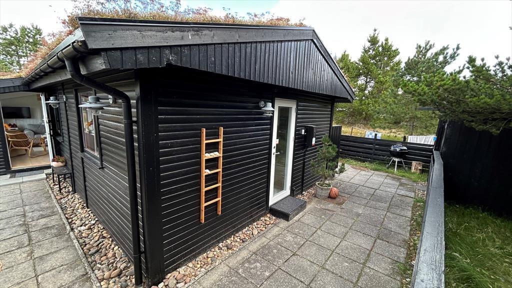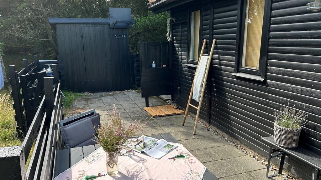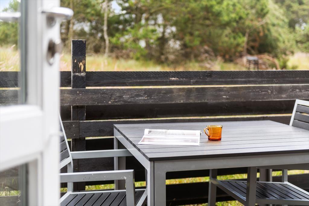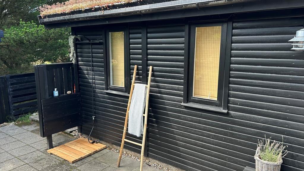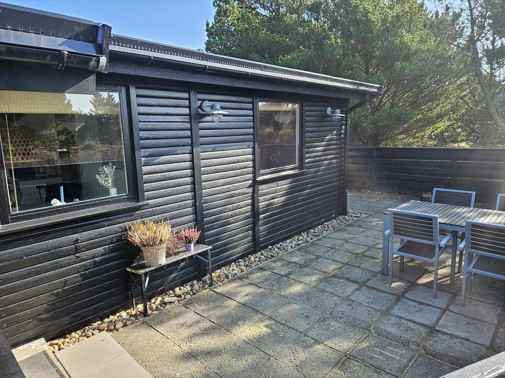 Det klassiske træhus ligger på en stor naturgrund, der har en varieret bevoksning med åbne arealer, tætte hybenbuske og krogede fyrretræer. Her kan du trække vejret dybt ned i lungerne og straks føle dig hjemme, for det er dejlige og velduftende omgivelser at opholde sig i – uanset om du leger med børnene på plænen eller slapper af i en havestol på husets dejlige terrasse. Terrassen er for øvrigt helt aflukket med hegn, så du kan drikke kaffe i ret ugenerede omgivelser, og hvis børnene er små, er det rart at vide, at de har en tryg ramme at hygge sig i.