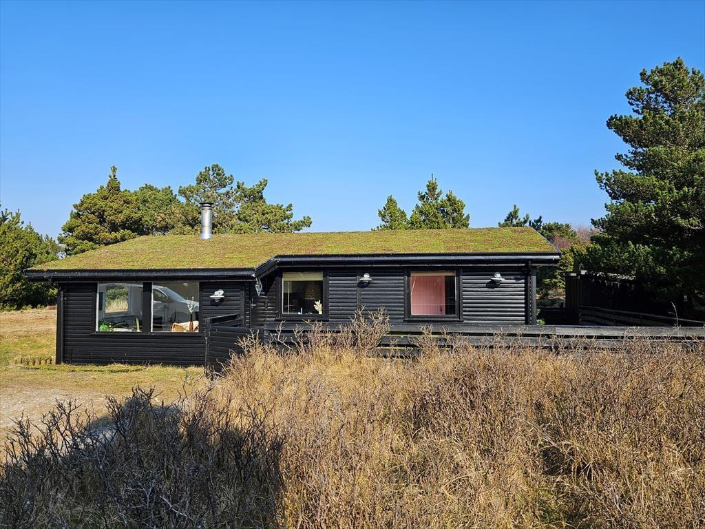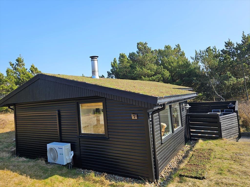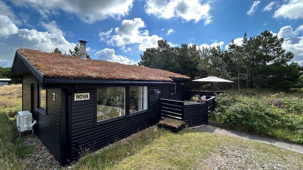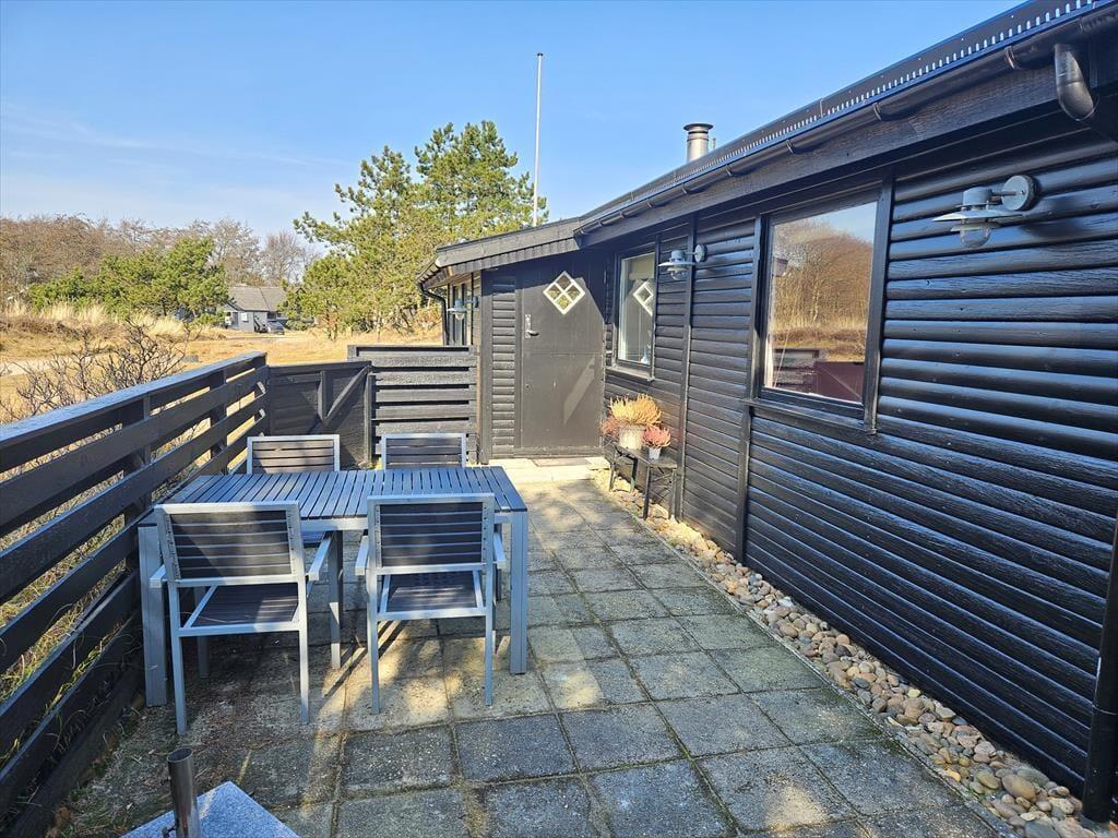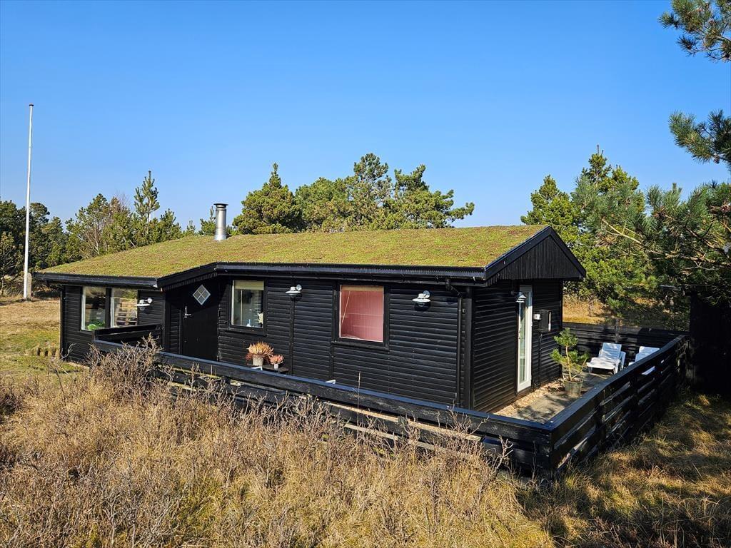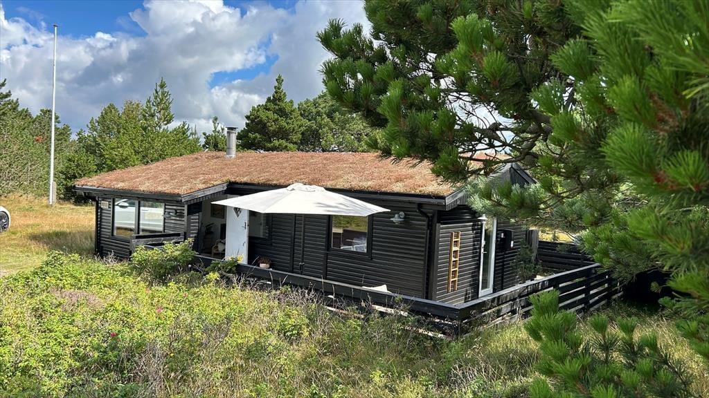 Det klassiske træhus ligger på en stor naturgrund, der har en varieret bevoksning med åbne arealer, tætte hybenbuske og krogede fyrretræer. Her kan du trække vejret dybt ned i lungerne og straks føle dig hjemme, for det er dejlige og velduftende omgivelser at opholde sig i – uanset om du leger med børnene på plænen eller slapper af i en havestol på husets dejlige terrasse. Terrassen er for øvrigt helt aflukket med hegn, så du kan drikke kaffe i ret ugenerede omgivelser, og hvis børnene er små, er det rart at vide, at de har en tryg ramme at hygge sig i.