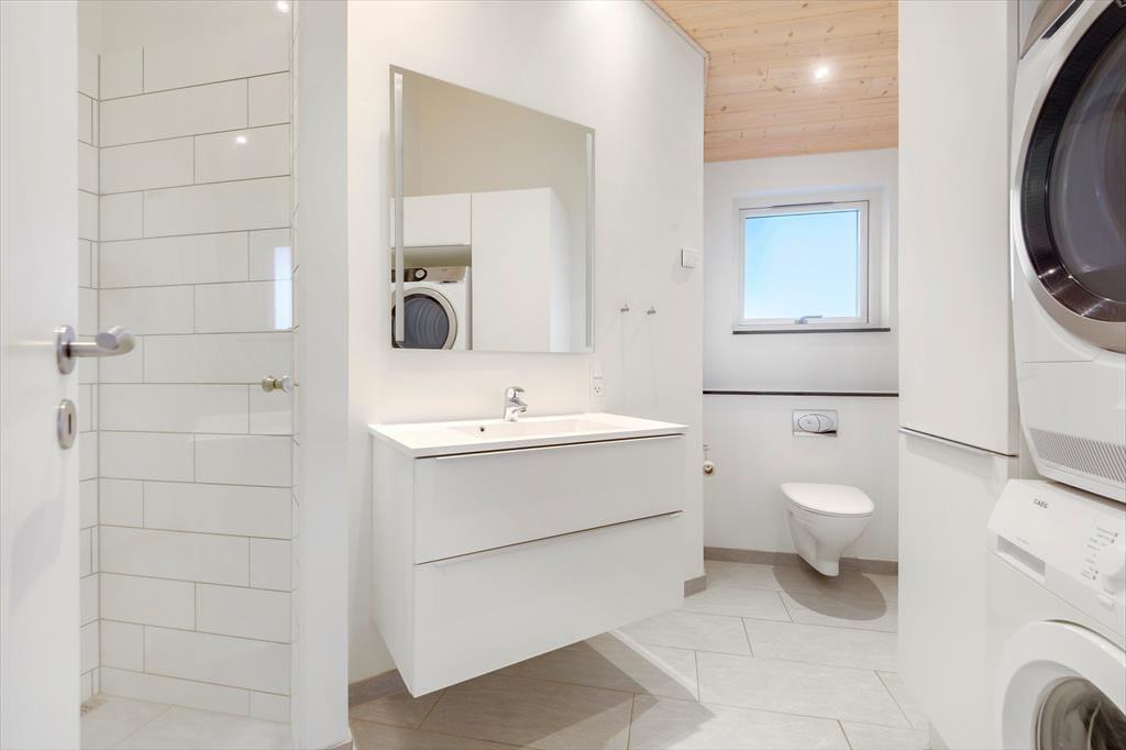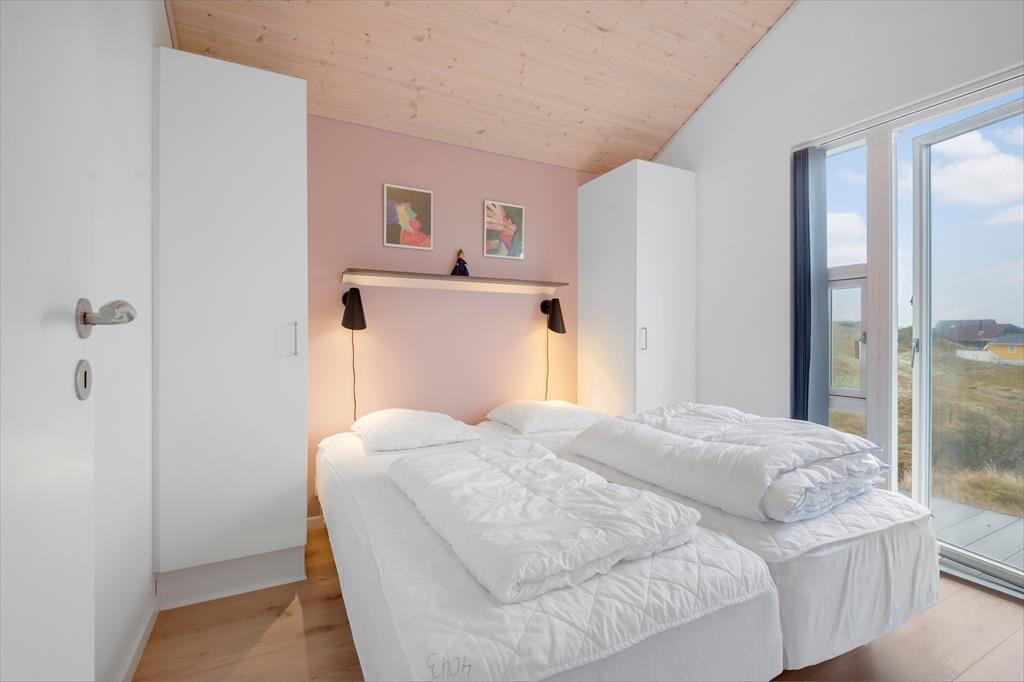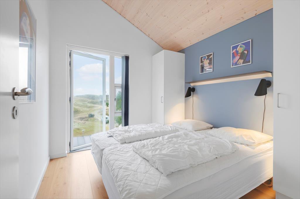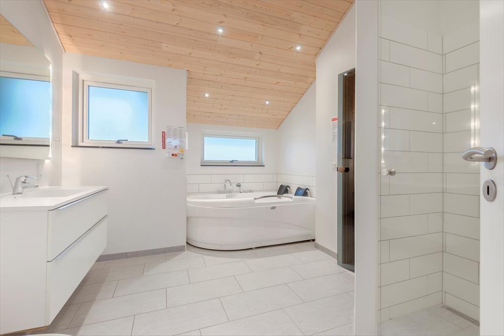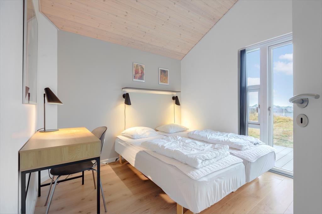 Da sommerhuset blev opført i 2012, blev der naturligvis taget hensyn til omgivelserne. Derfor er stuen udstyret med kæmpestore vinduespartier mod syd og vest, så sollyset og de flotte omgivelser bliver inviteret helt indenfor. Sofaafdelingen er endda placeret, så du kan sidde komfortabelt, mens du tager det hele ind. Tænk, at sidde her med en varm kop kaffe, mens brændeovnen knitrer, og god musik spiller fra anlægget! Selv når du er i gang med madlavningen i det åbne køkken, kan du kigge ud – til gengæld ligger husets spabad og sauna helt privat på det ene af husets to lækre badeværelser. Soveværelser er der fire af, og de er praktisk fordelt i begge ender af bygningen, så planløsningen passer ideelt til to børnefamilier såvel som en parferie med vennerne.