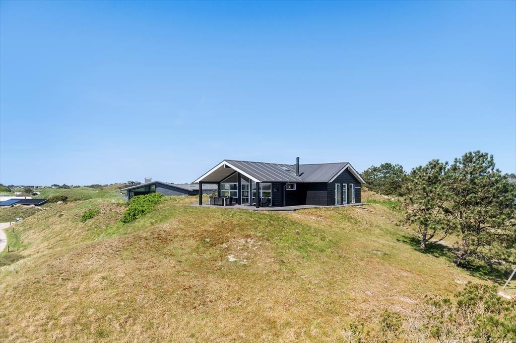 Udsigten er lige så formidabel ude på terrassemiljøet, hvor du kan sætte dig under halvtaget eller helt under åben himmel. Landskabet viser sig, uanset vejret og årstiden, altid fra sin smukkeste side, og der er helt tiden noget nyt at kigge på. Solforholdene er for øvrigt gode her på klittoppen, og på grunden kan du også gå ned for at finde en læfyldt gryde – for eksempel nær legeredskaberne, hvor børnene kan hygge sig med at gynge og lege i sandkassen. Endelig er det værd at bemærke, at på grund af den høje beliggenhed skal du tage en trappe for at komme fra parkeringsarealet og op til huset og terrassen.