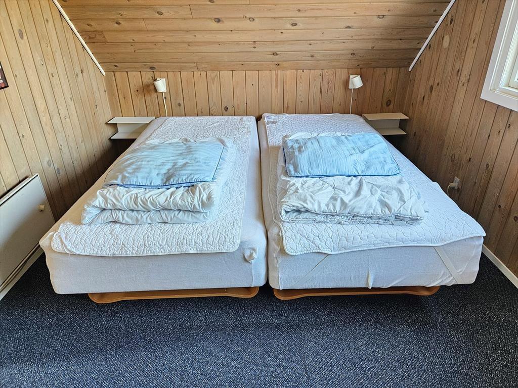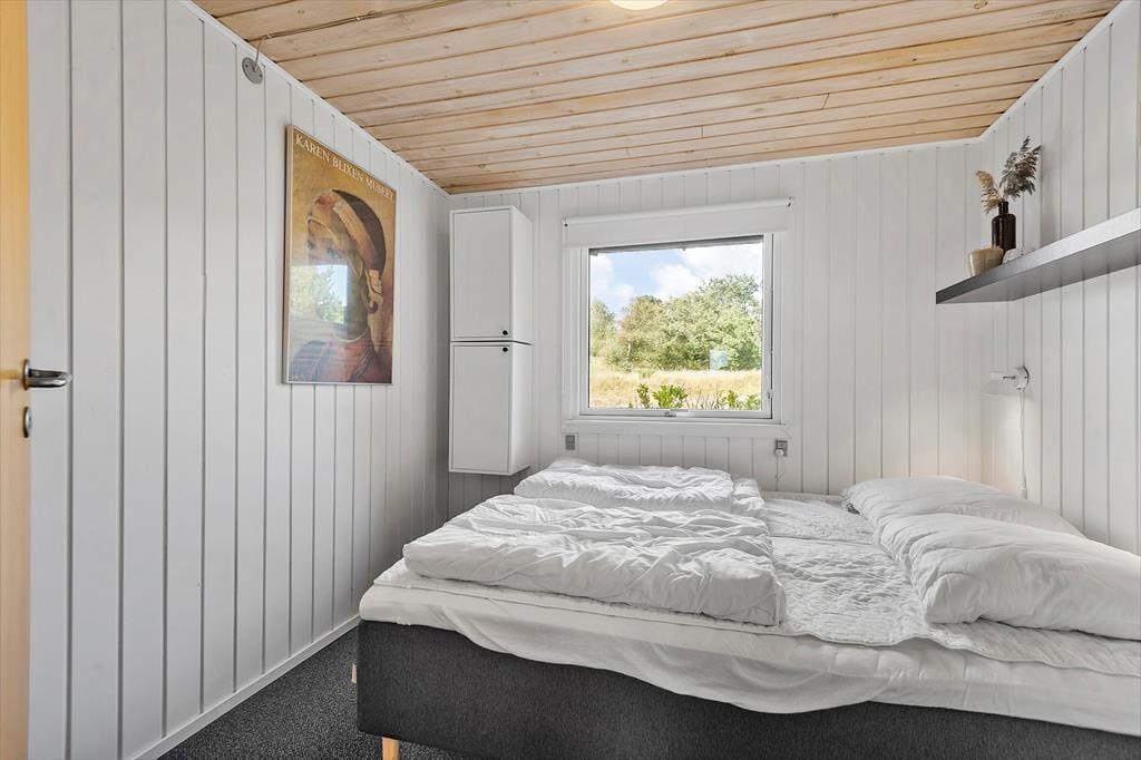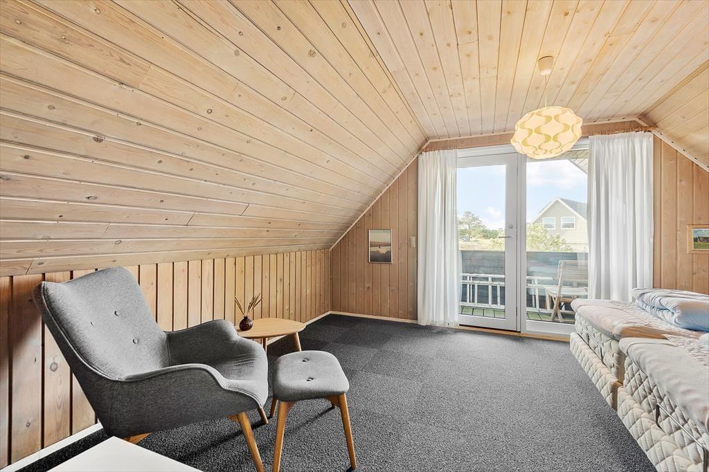 Sommerhuset er fuld af god, gammeldags feriestemning og komfortabelt møblement, og hvis du trænger til at hygge dig inden døre med brætspil, varm kakao og ild i brændeovnen, har du kig på det helt rette sted. Stue og køkken ligger i åben forbindelse, og gennem vinduerne kan du kigge ud på naturgrunden og den blå himmel, mens du forbereder brunch og brygger kaffe eller bare nyder samværet med din familie. Et badeværelse og et soveværelse hører også til planløsningen i stueetagen, mens førstesalen byder på et stort master bedroom og to mindre soverum.