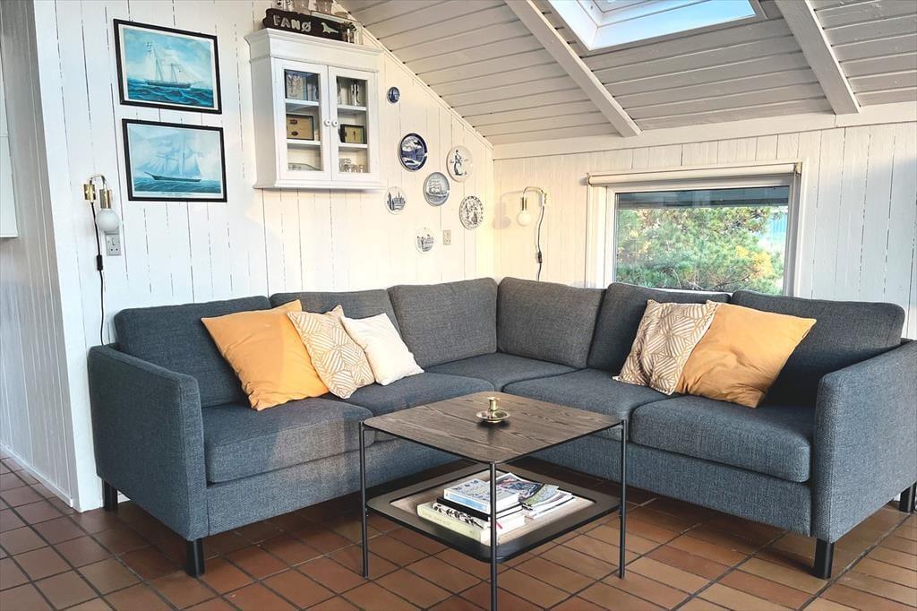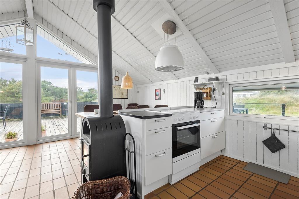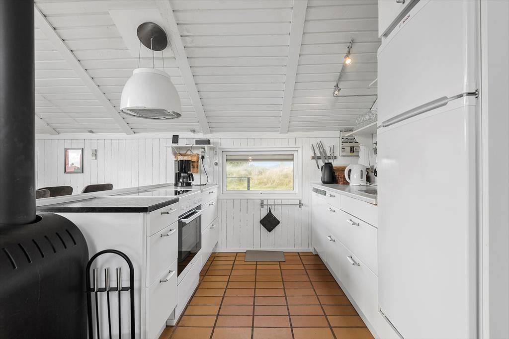 Loft til kip med ovenlysvinduer, hvidmalede trævægge, kønne flisegulve og en brændeovn. Alt dette er komponenter, der sammen med det komfortable møblement og de nøje udvalgte nipsgenstande er med til at gøre stuen til et herligt sted at være. Køkkenet er integreret med stuen, og samlet set er det et naturligt samlingspunkt for familien: Her kan I lave mad sammen og efterfølgende nyde måltidet ved spisebordet, mens samtalerne flyder frit. Dagen kan sluttes af i sofaafdelingen, eventuelt med en spændende film på fladskærmen, og når det er tid til at sige godnat, kan I gå til ro på husets tre pæne soveværelser.