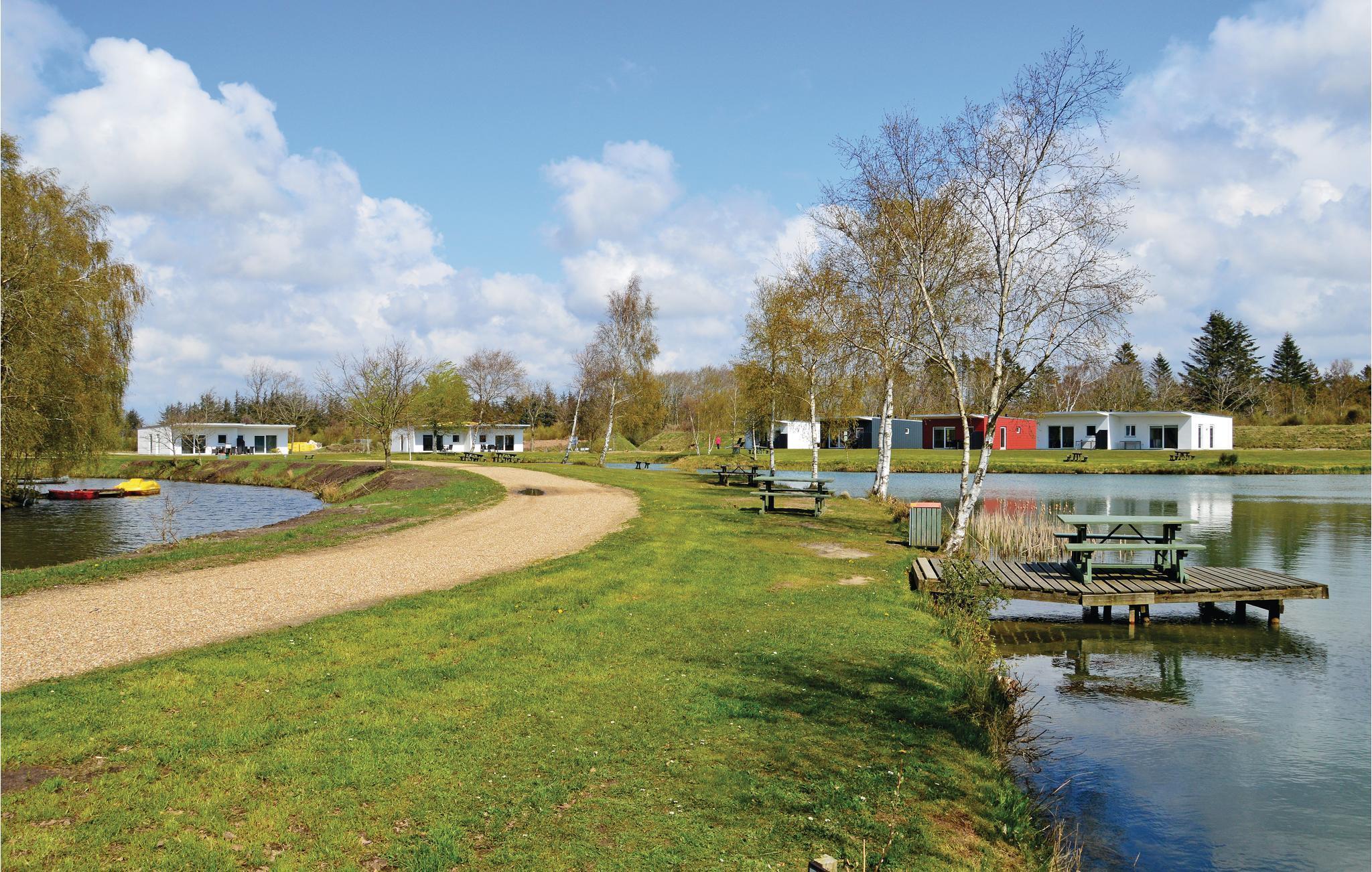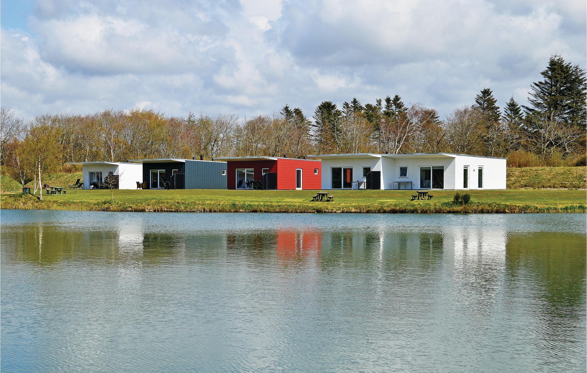 Hyggeligt sommerhus i Naturpark Vest med panoramaudsigt over fiskesø og adgang til mange aktivitetsfaciliteter.