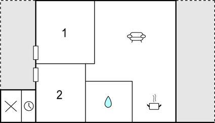 Huset er indrettet med 2 soveværelser samt badeværelse med bruser. Køkkenet og stuen ligger i åben forbindelse, og herfra er der udgang til terrassen.