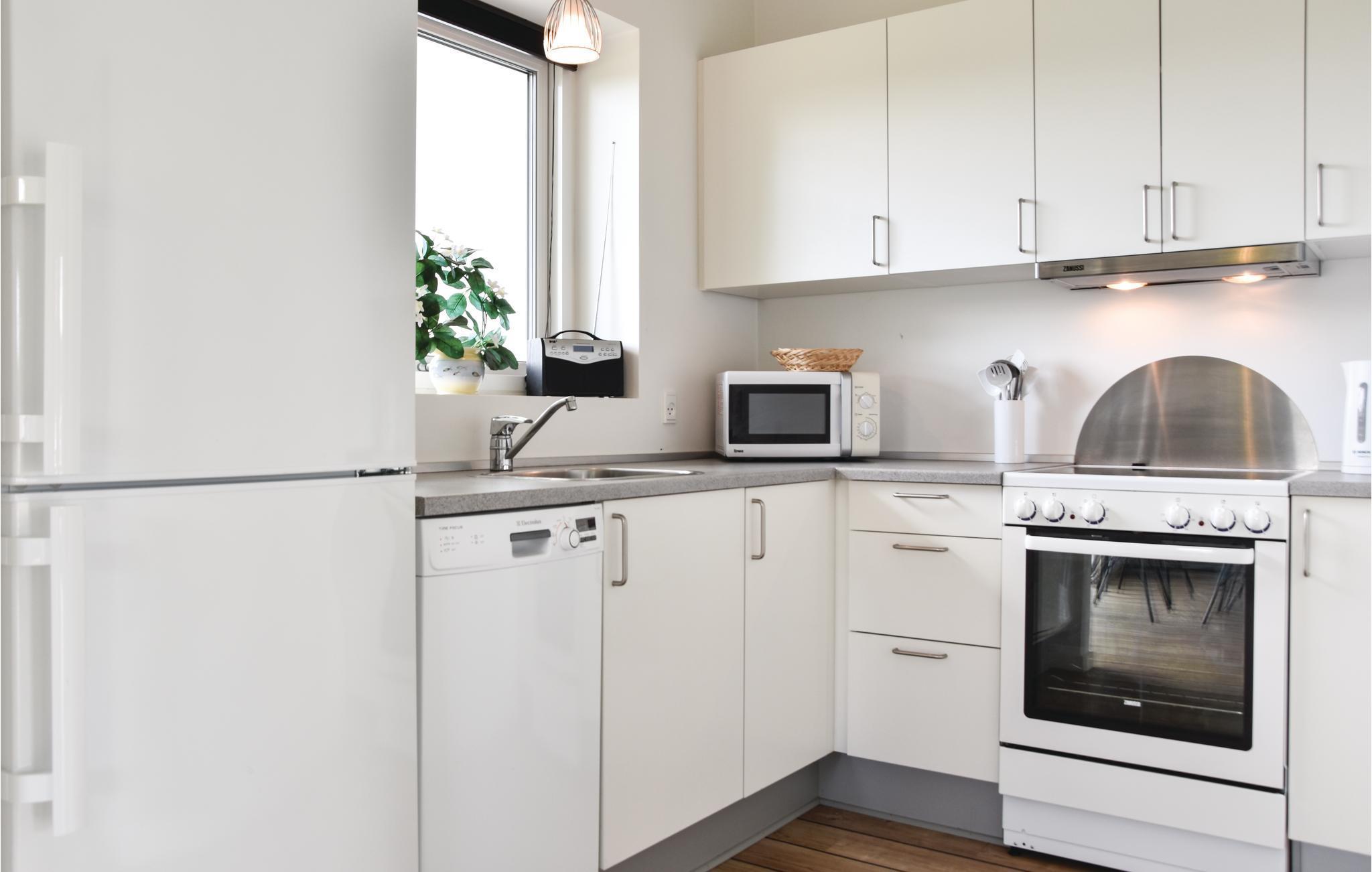 Huset er indrettet med 2 soveværelser samt badeværelse med bruser. Køkkenet og stuen ligger i åben forbindelse, og herfra er der udgang til terrassen.