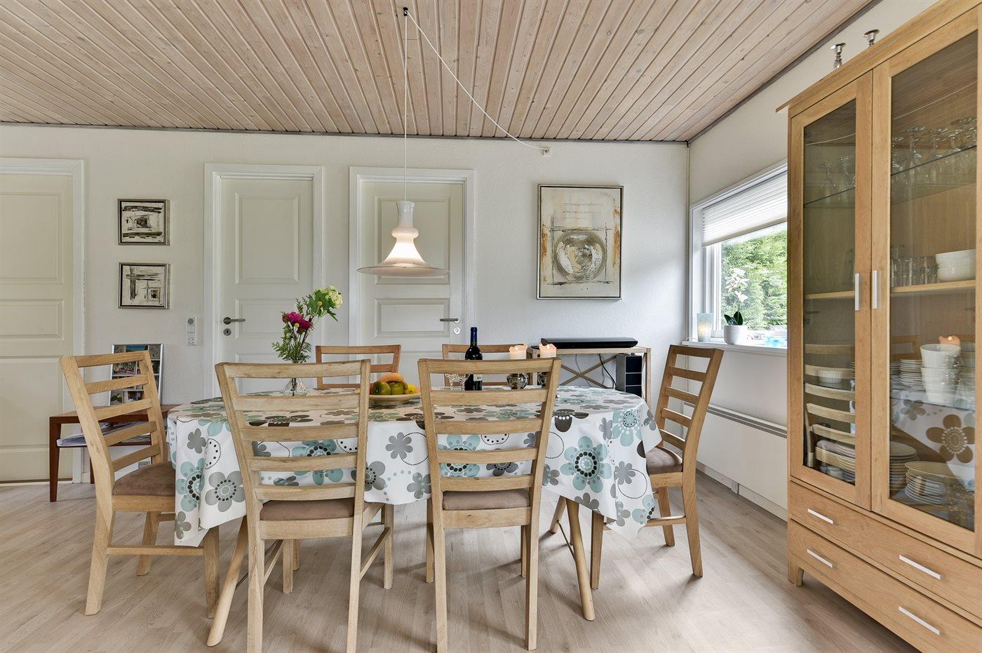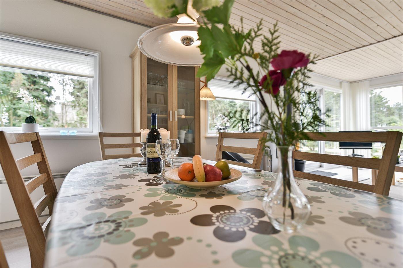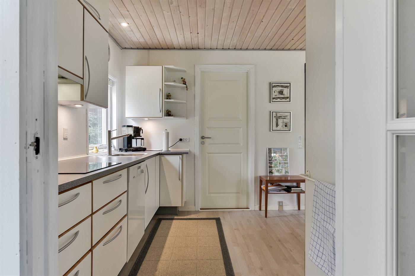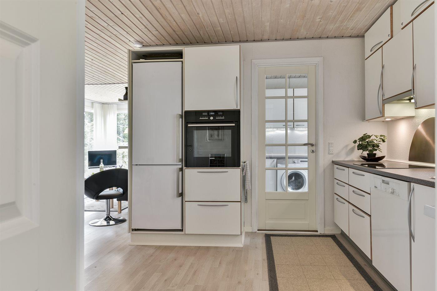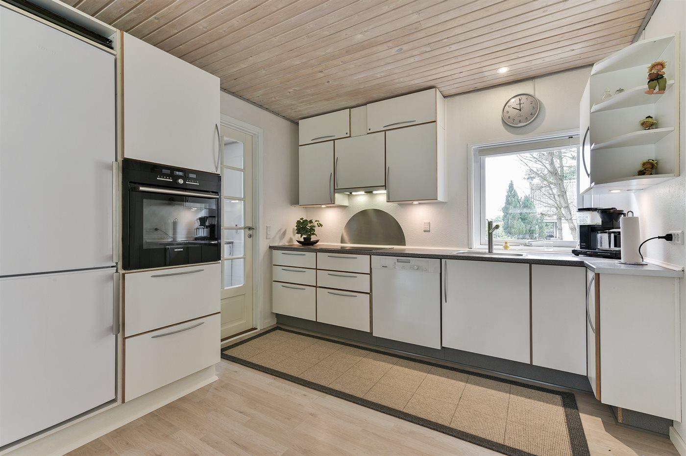 Køkkenet er udstyret med 1 køleskab. Der er 4 keramiske kogeplader, bageovn, mikrobølgeovn samt opvaskemaskine.