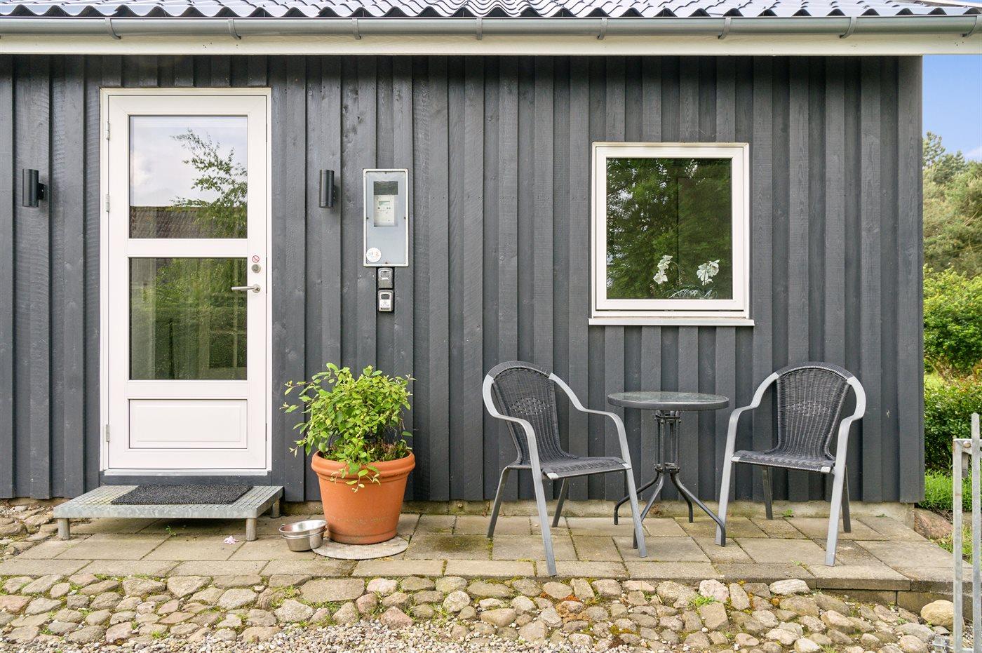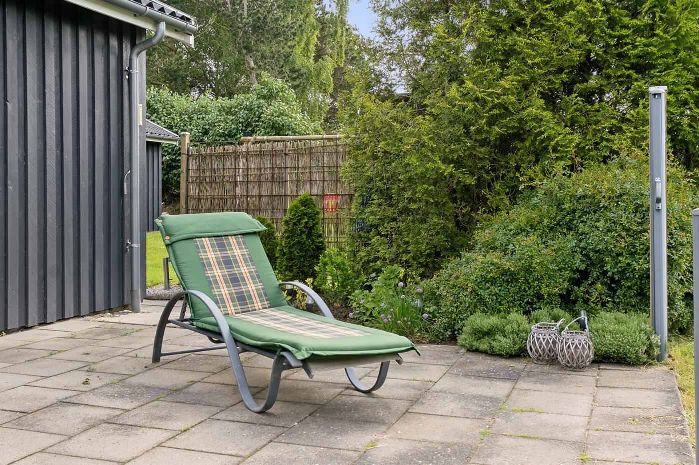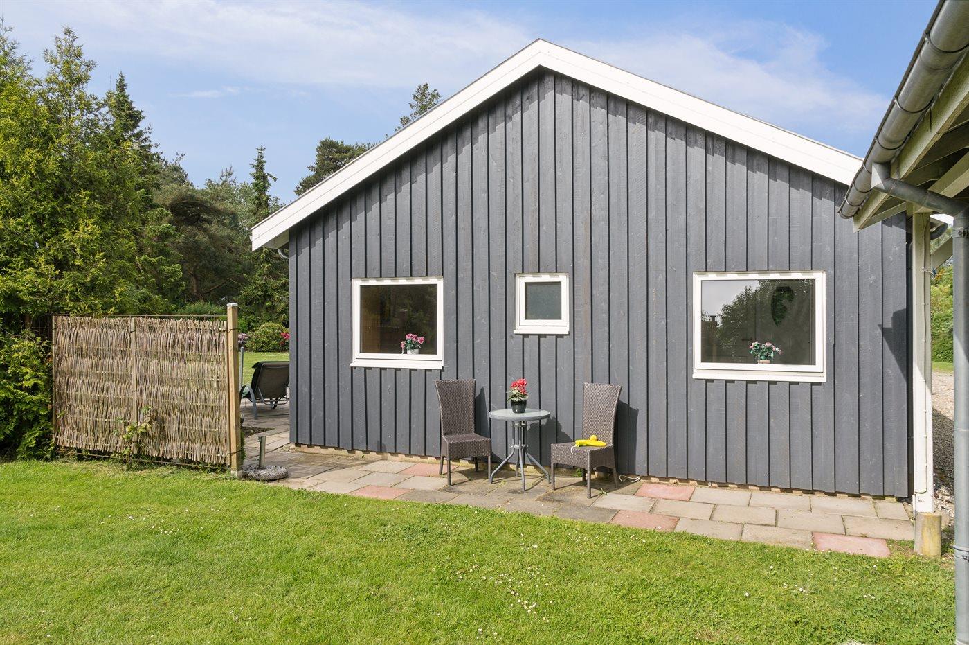 Ferieboligen er beliggende på en 1300 m² stor havegrund. Grunden er indhegnet. Der er 1200 m til havet. Nærmeste forretning er beliggende i en afstand af 3000 m. Til ferieboligen hører 45 m² terrasseareal. Der er redskabsrum. Gynge. Sandkasse. Grill til rådighed. Der er carport til rådighed. Parkering ved ferieboligen.