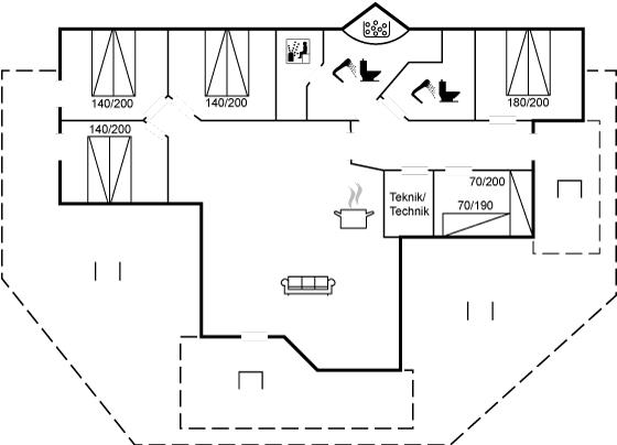 Der er i alt 5 soveværelser. Sovepladserne fordeler sig på: 8 sovepladser i dobbeltsenge. 2 sovepladser i enkeltsenge. Derudover er der 1 stk. barneseng.