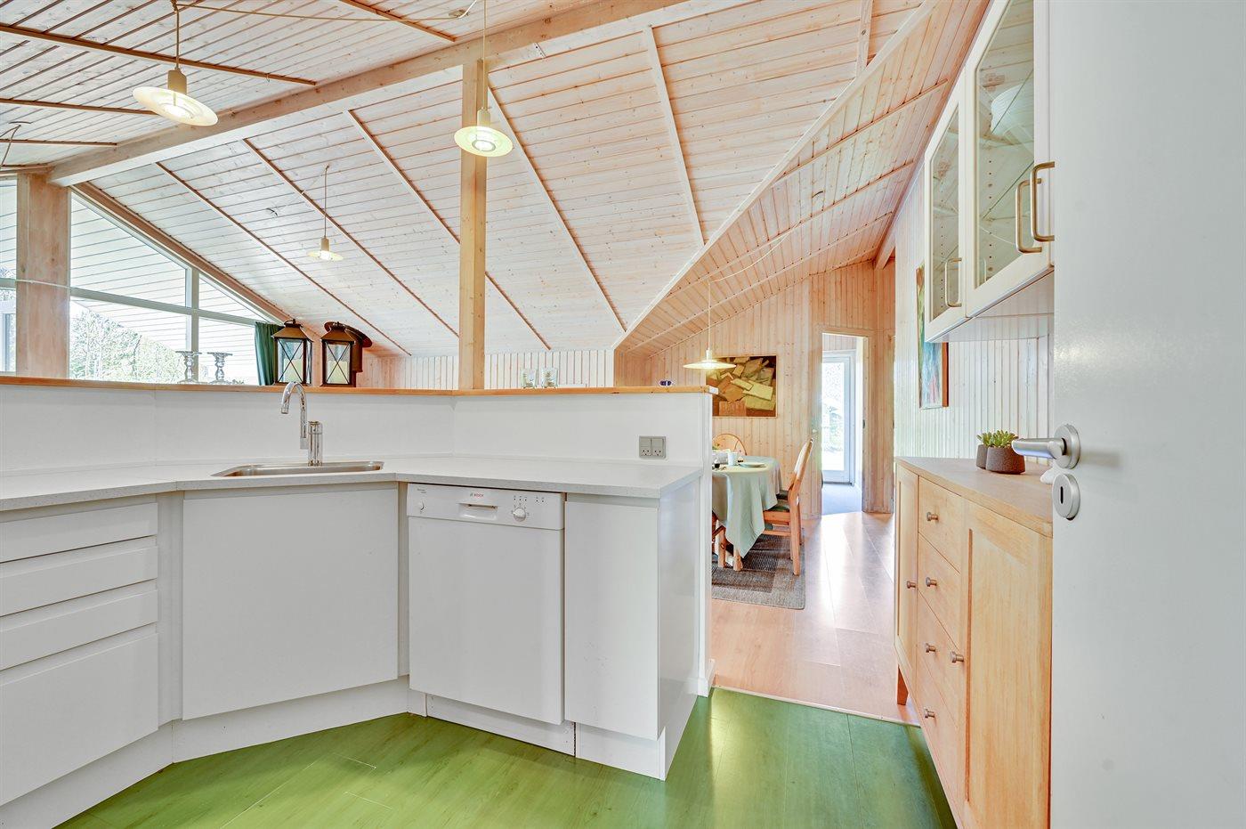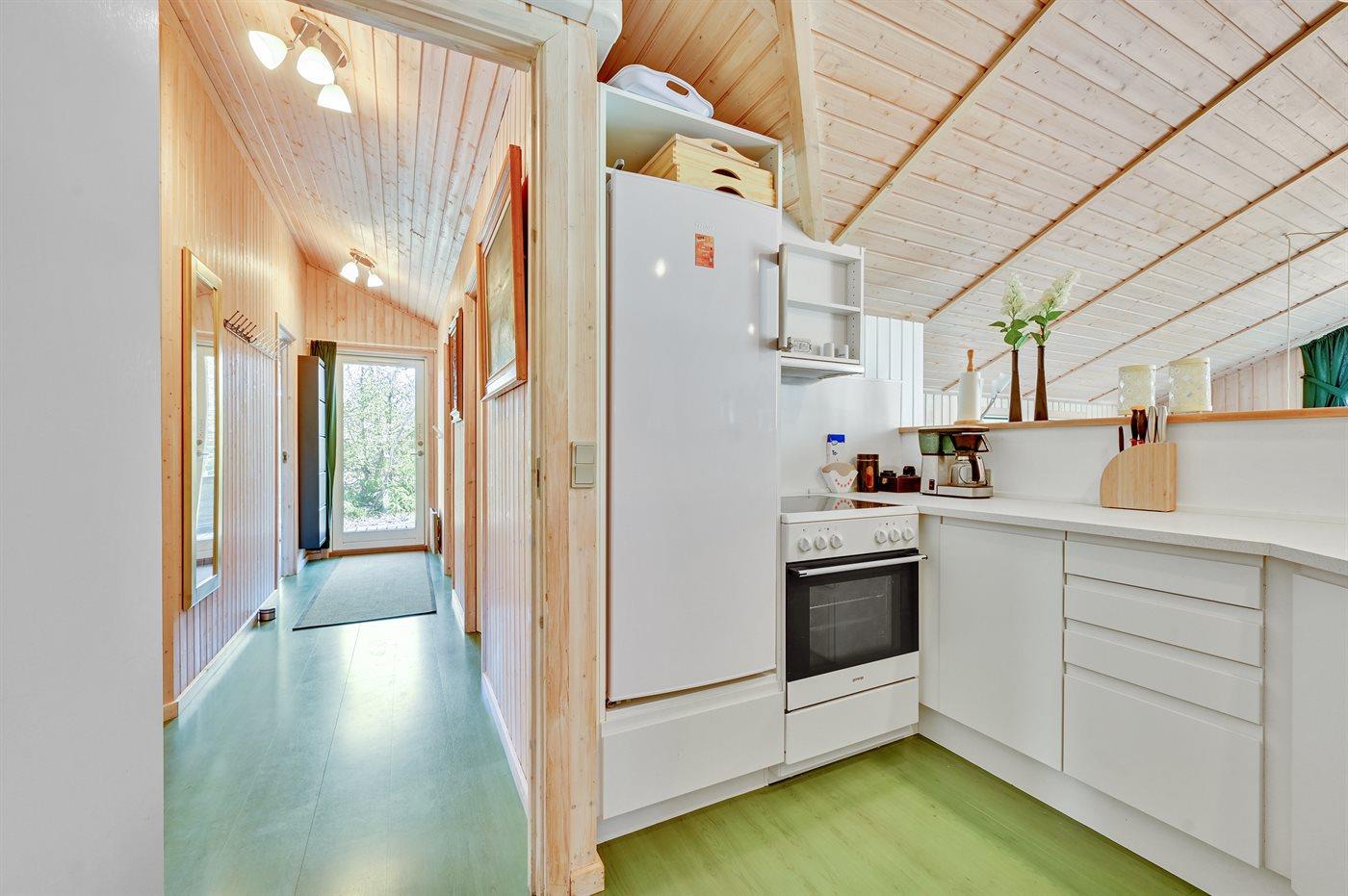 Køkkenet er udstyret med 1 køleskab. Der er 4 keramiske kogeplader, varmluftovn samt opvaskemaskine.