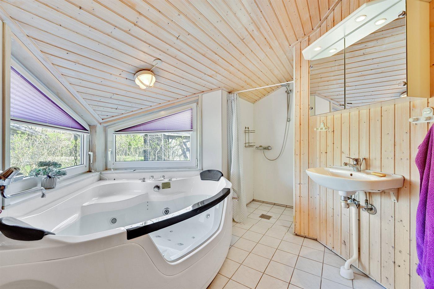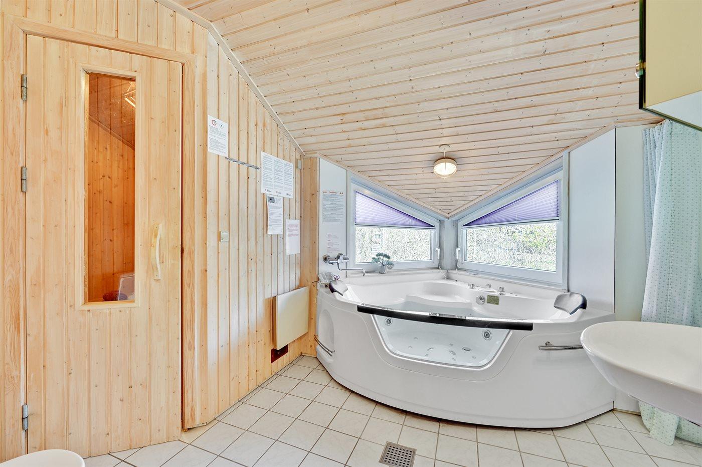 Der er 2 badeværelser med bruseniche og 2 toiletter. Der er gulvvarme på 2 badeværelser. I saunaen er der mulighed for afslapning.