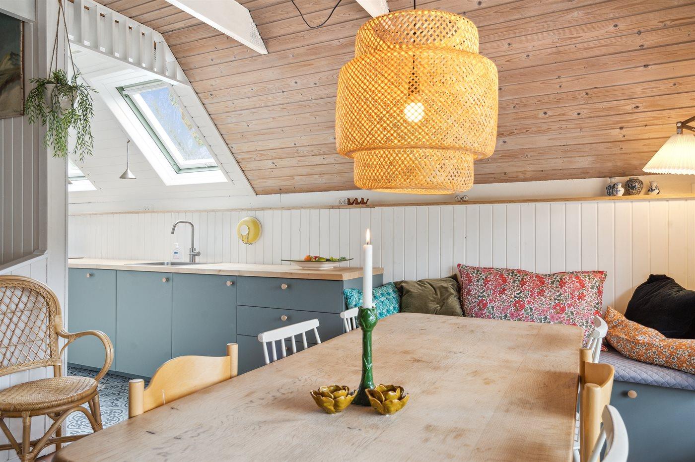 Køkkenet er udstyret med 1 køleskab. Der er 4 induktionskogeplader, varmluftovn, mikrobølgeovn samt opvaskemaskine.