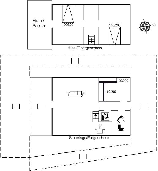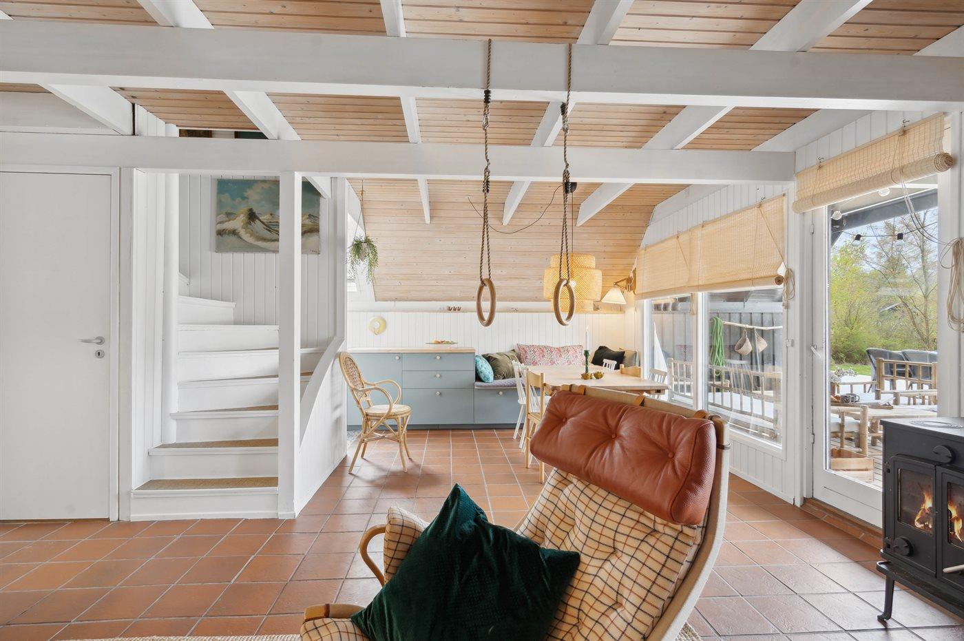 I stueplan er huset indrettet med bl.a. stort børneværelse med 2 store køjesenge (4 køjepladser), og på 1 salen findes der 2 store værelser, hvor der fra det ene værelse er udgang til en dejlig overdækket altan med loungemøbler.