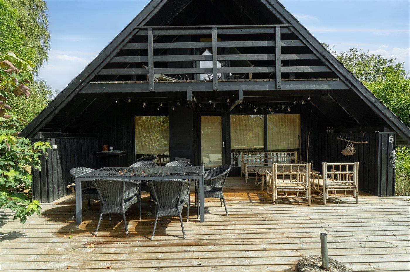 Moderne sommerhus i Ristinge med vildmarkskar, sauna og stor terrasse tæt på stranden.