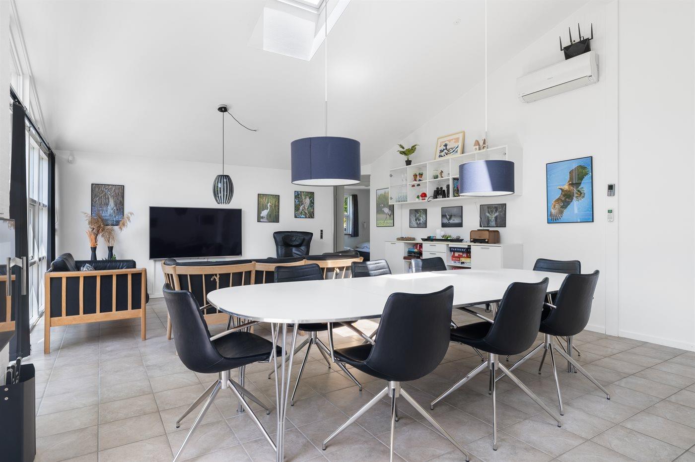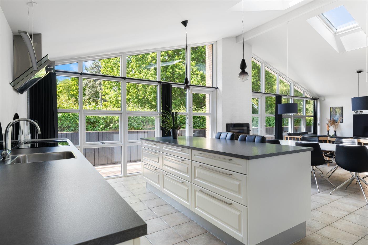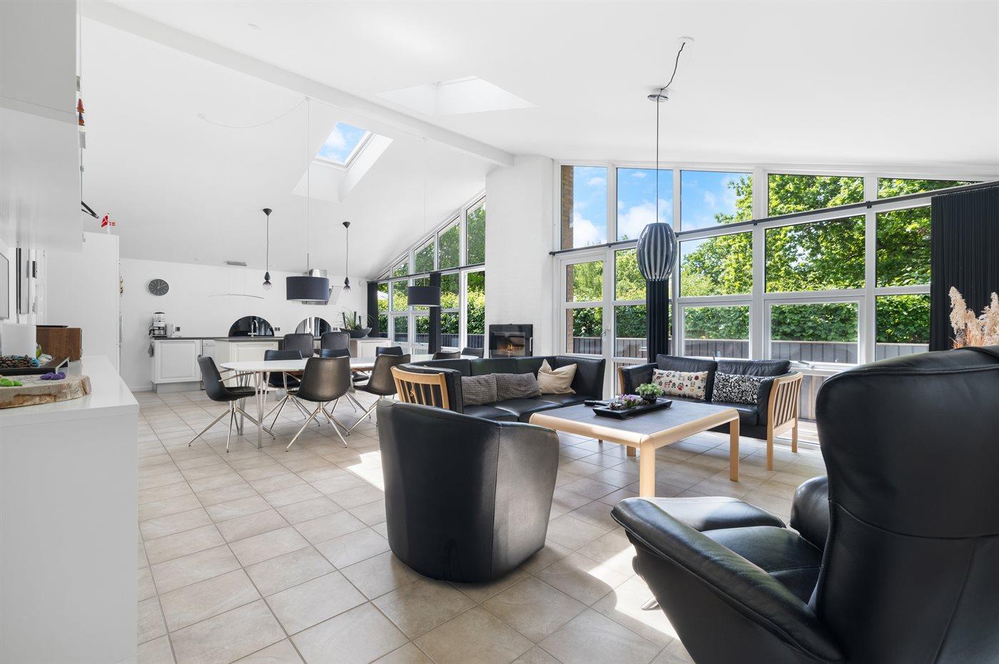 Huset er godt indrettet og har et stort åbent og lyst køkken-alrum, hvor der er åbnet op til kip, så der er et flot lysindfald fra de store sydvest-vendte vinduespartier. Omkring huset findes der flere terrasser, således der altid er mulighed for at finde et sted med sol. I den store have er der god plads til udendørs aktiviteter.