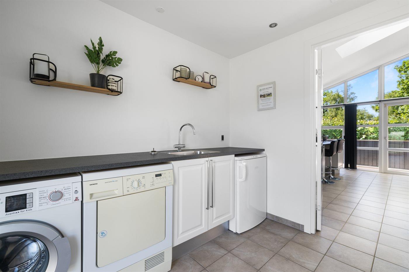 Køkkenet er udstyret med 1 køleskab. Der er 4 induktionskogeplader, varmluftovn, mikrobølgeovn samt opvaskemaskine.
