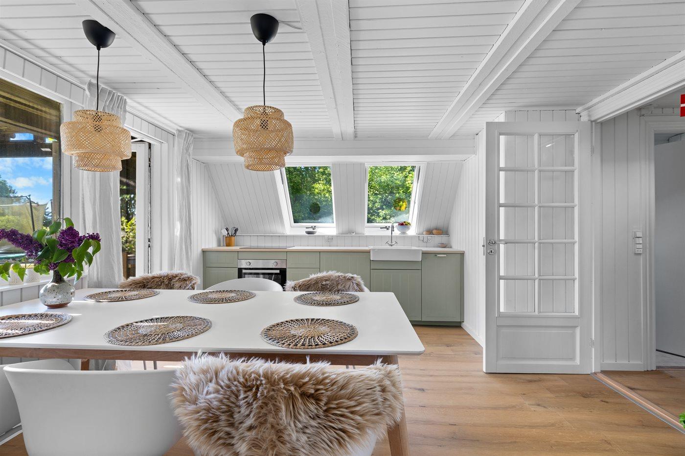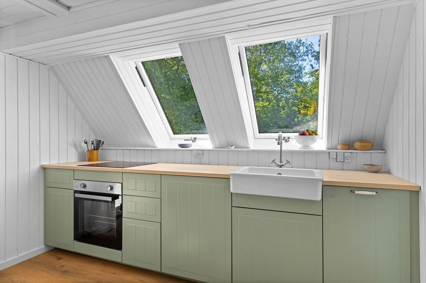 Køkkenet er udstyret med 2 køleskabe. Der er 4 induktionskogeplader, varmluftovn, mikrobølgeovn samt opvaskemaskine.