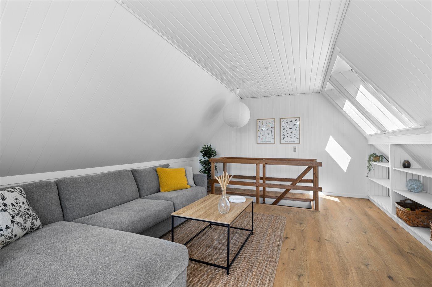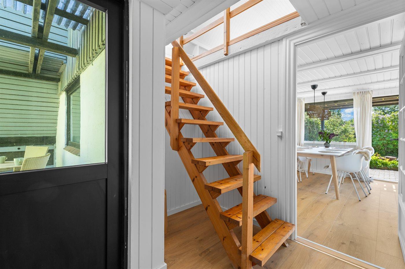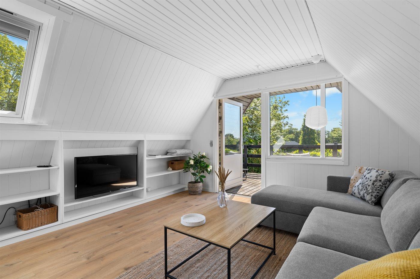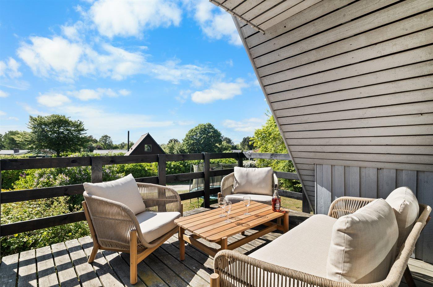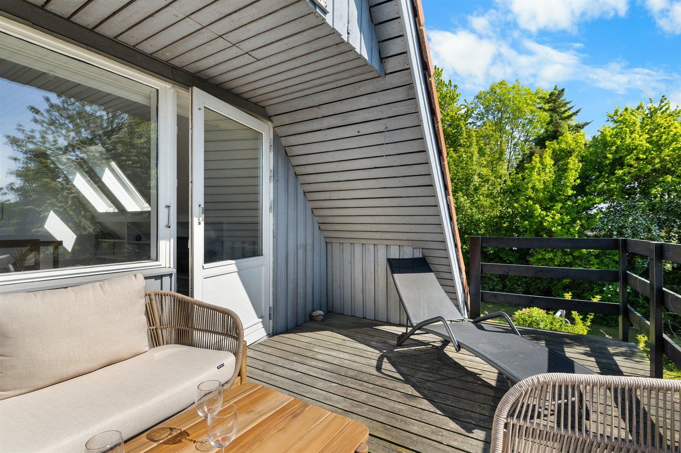 Huset er hyggeligt indrettet og har både terrasse foran og bag huset. På 1. salen er der stue med udgang til altan med lækre loungemøbler, hvorfra der er udsigt ud over området.