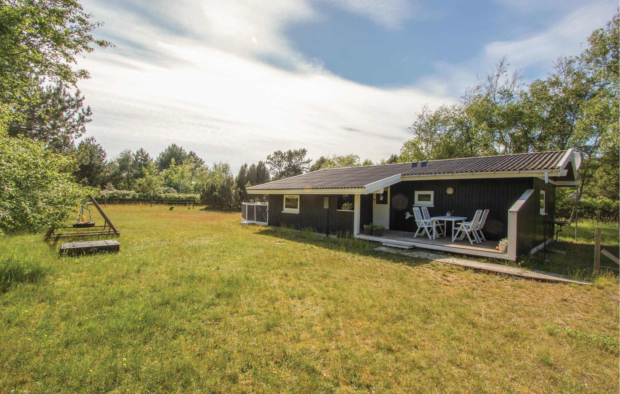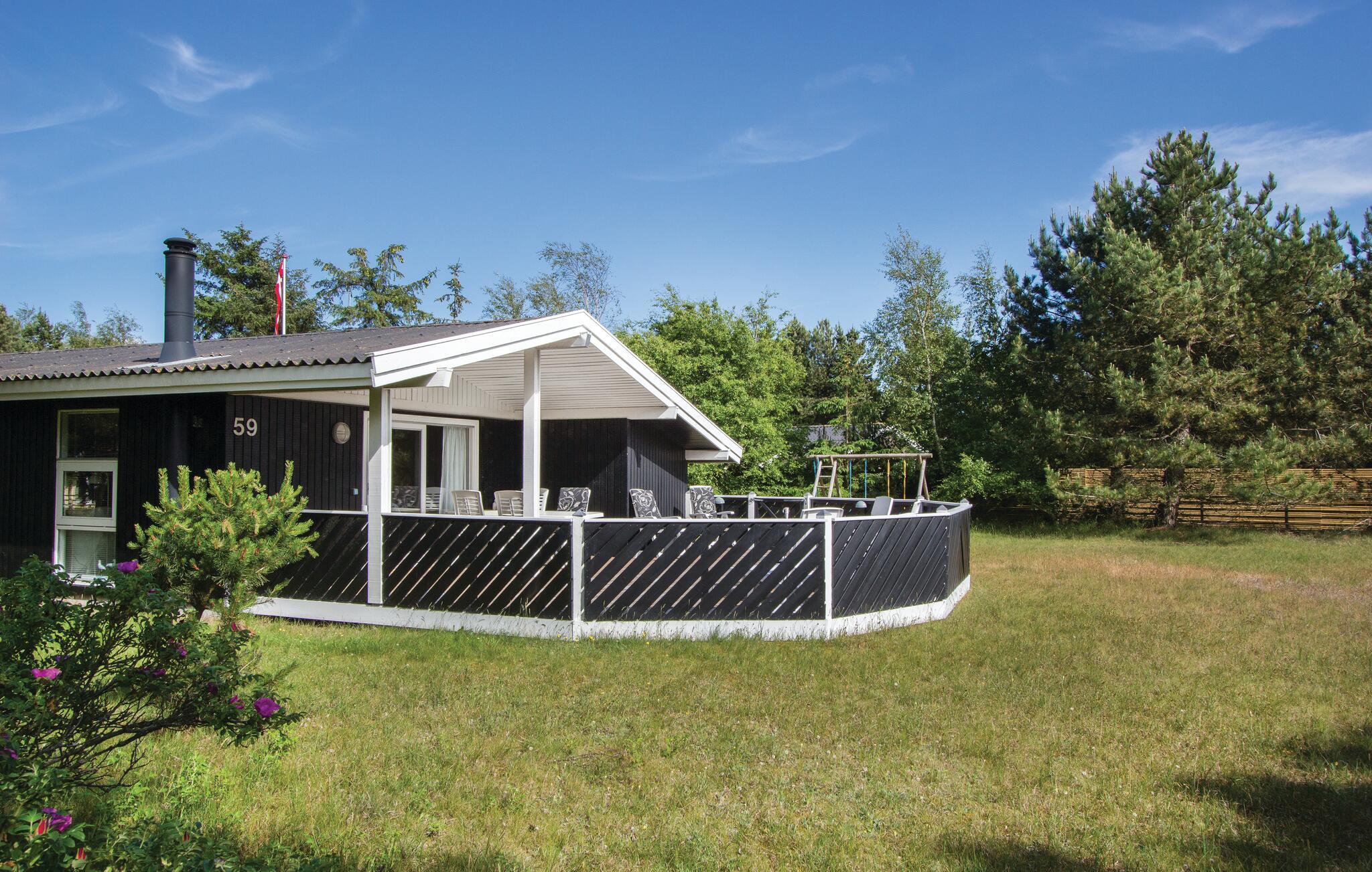 Hyggeligt træferiehus nær familievenlig badestrand i Ristinge med stor terrasse og gode udendørs aktiviteter.