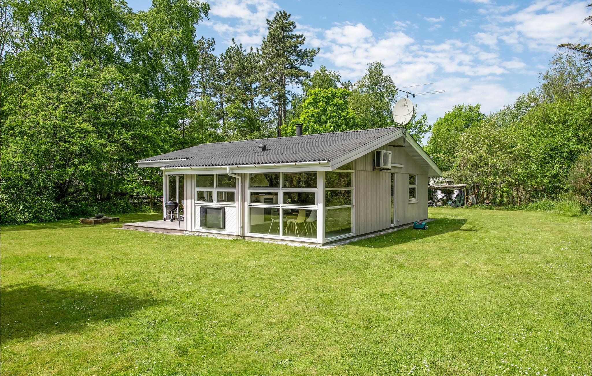 Lyst og indbydende sommerhus nær sandstrand med terrasse, grill og sauna, perfekt til en afslappende ferie i naturskønne omgivelser.
