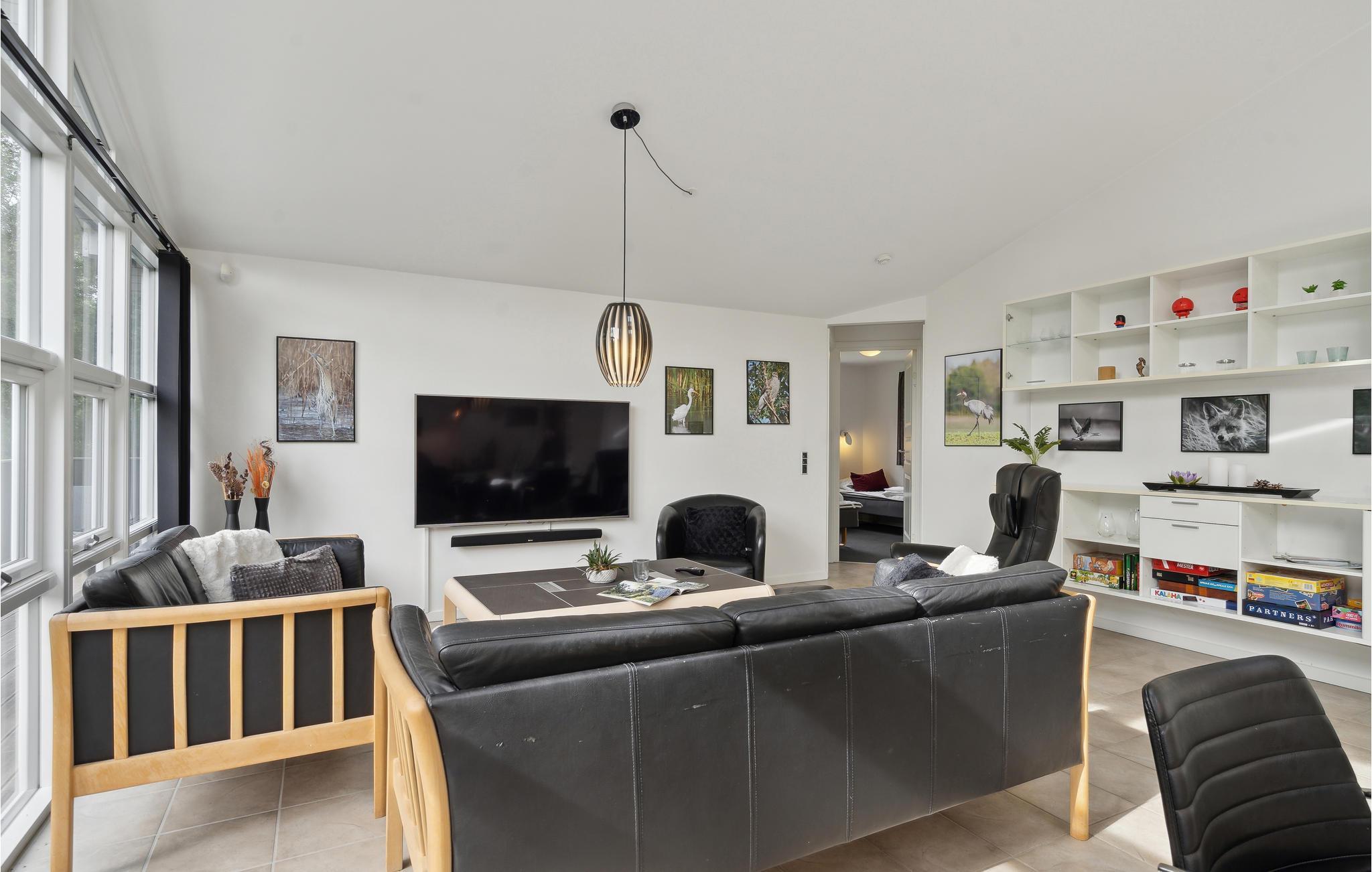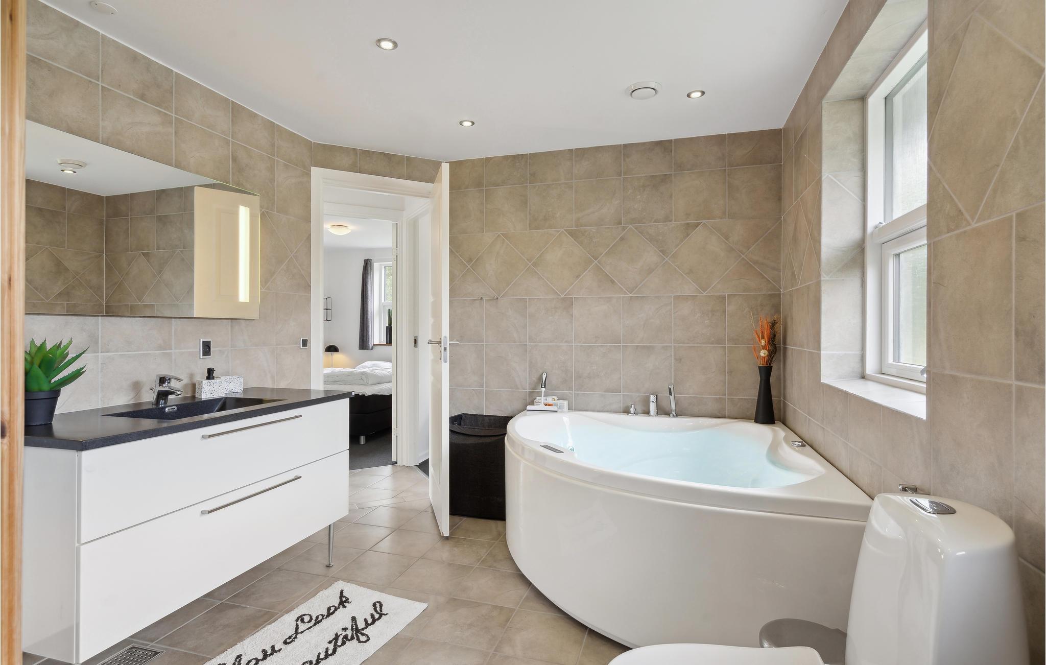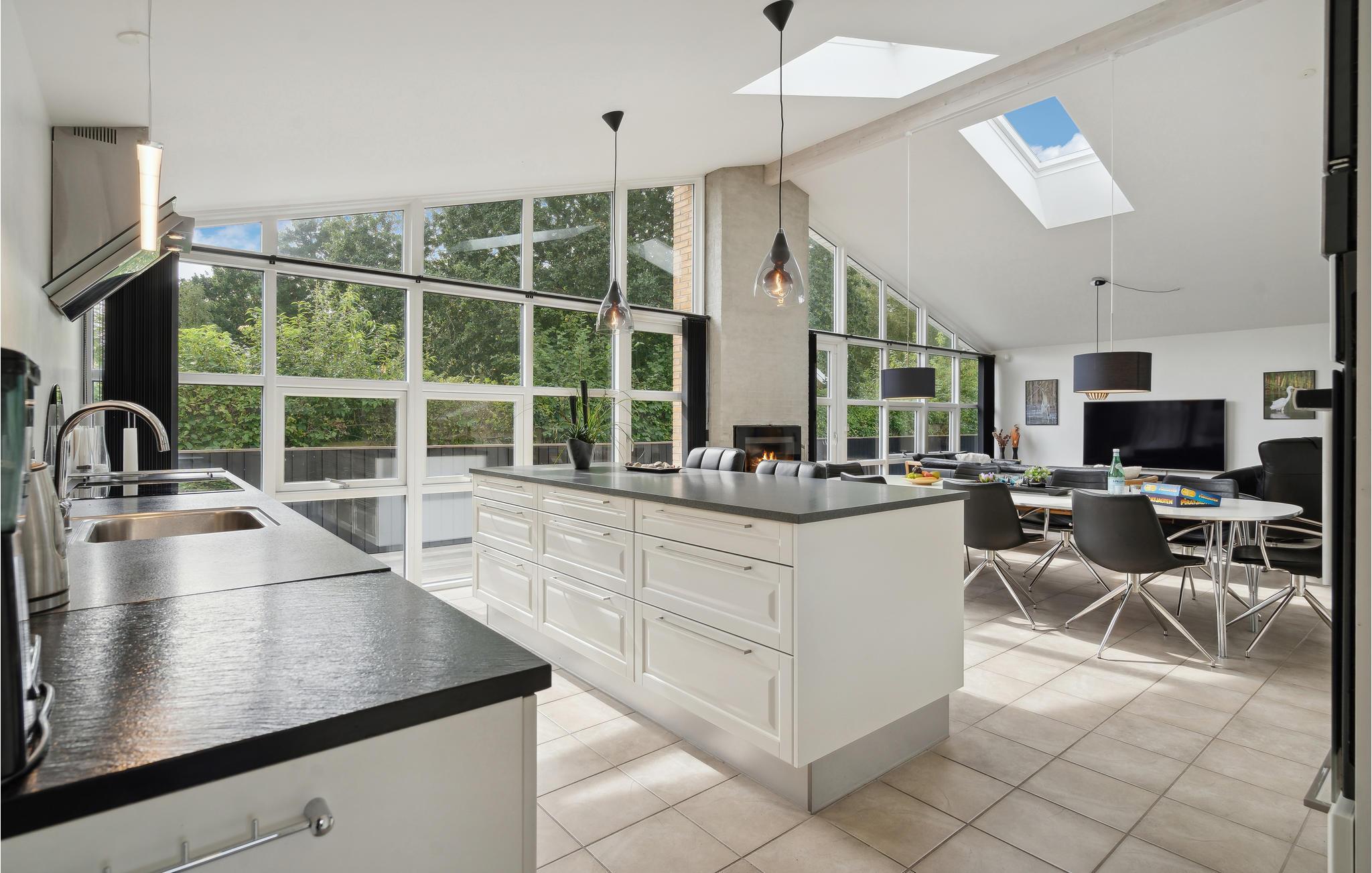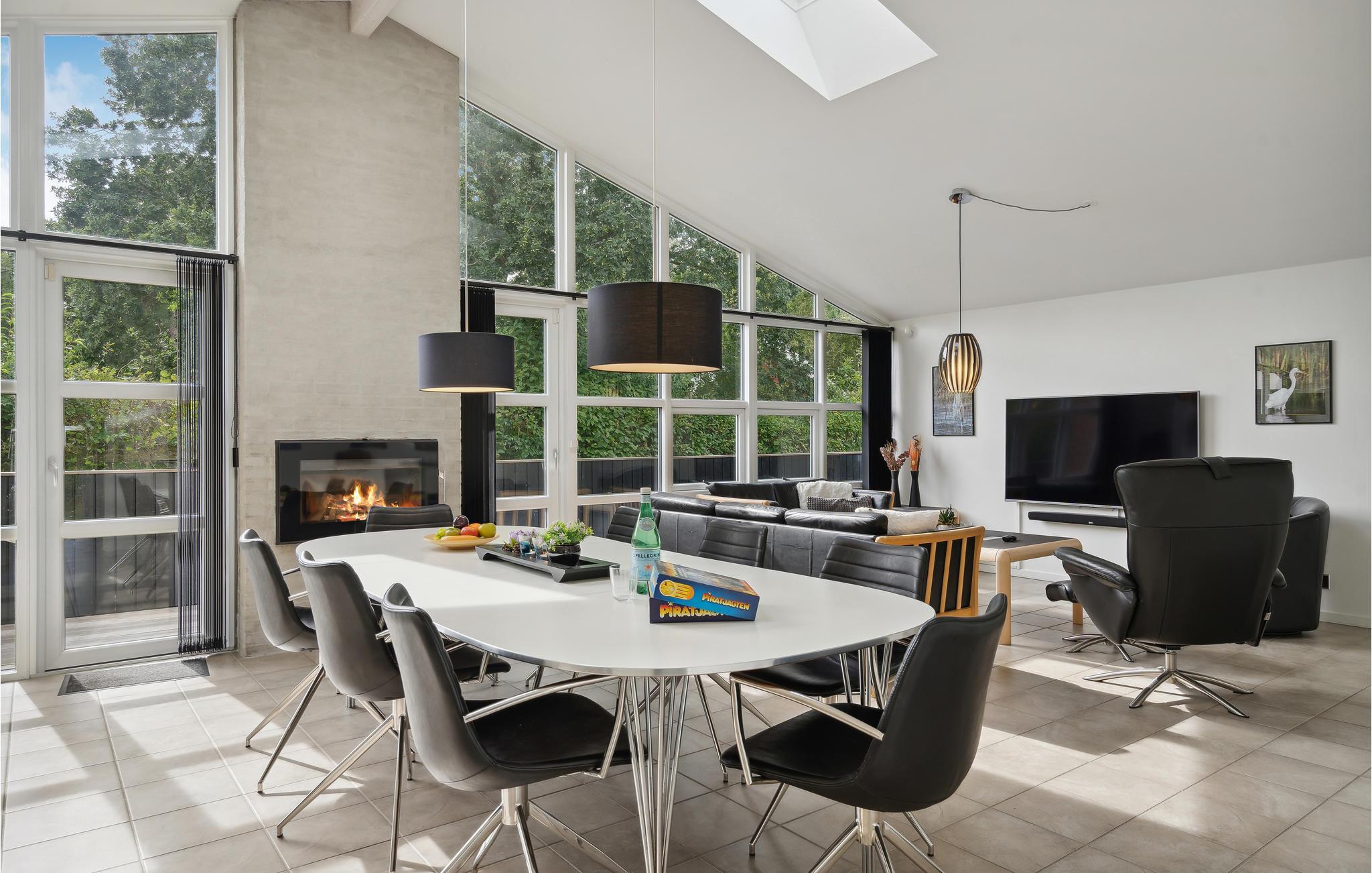 Forkæl jer selv med en afslappende ferie på Langeland og tilbring en vellykket familieferie i dette lyse feriehus med en smart åben planløsning. Det rummelige opholdsrum overbeviser med sine store panorama- og ovenlysvinduer og kombinerer køkken, spisestue og opholdsstue i ét, så I altid kan deltage i andres samtaler. Hvorfor ikke dyste i brætspil ved spisebordet om aftenen og lægge planer for de næste par dage, mens ilden gnistrer i brændeovnen? Huset er veludstyret, så det er en fornøjelse at lave mad i det åbne køkken. Wellness er der også nok af. I kan se frem til en sauna og et boblebad integreret i badeværelset. I haven kan I nyde solen, og på græsplænen kan hele familien tumle. Når vejret er varmt, er det oplagt at flytte alle måltider ud på terrassen.