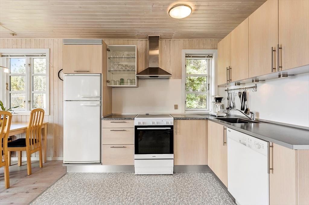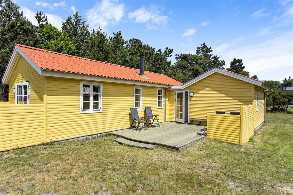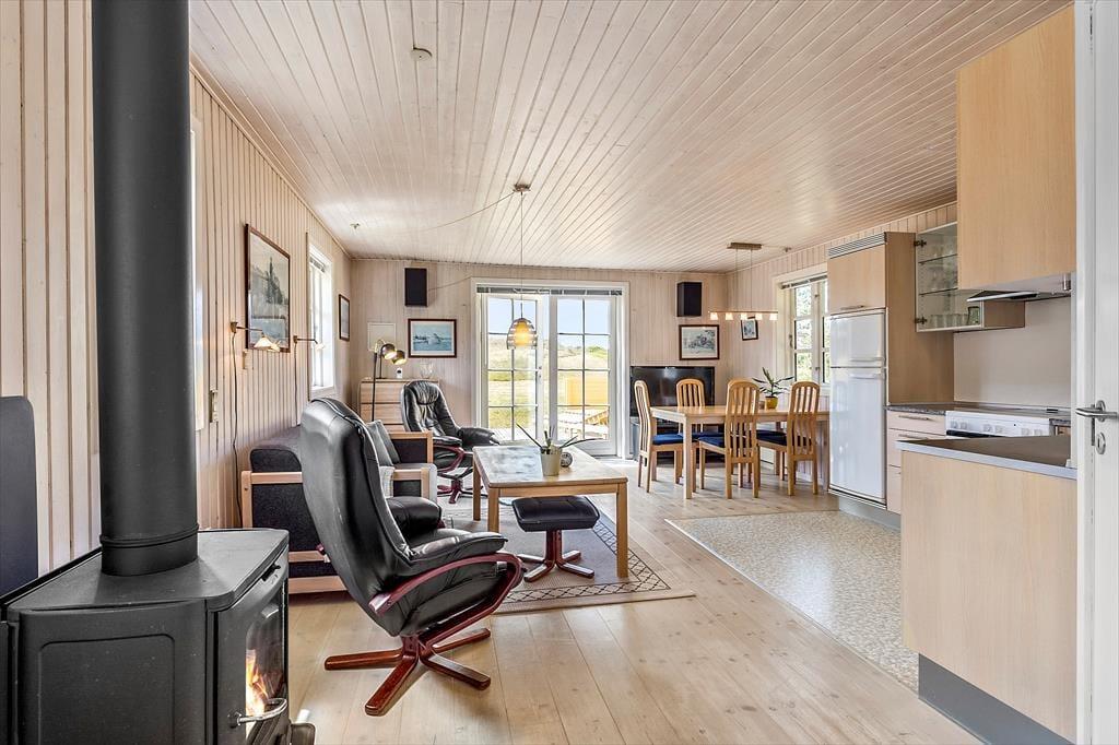 Når du træder ind i dette charmerende sommerhus, mødes du af en lys og indbydende atmosfære, der emmer af klassisk sommerhusstemning. Huset er indrettet med tre soveværelser, som giver rigeligt med plads til både familie og venner. Det åbne opholdsrum med store vinduer mod klitterne fylder rummet med naturligt lys og inviterer til hyggelige stunder. Her kan I samles om bordet til måltider eller spille et spil efter en dag på stranden. Brændeovnen sørger for varme og hygge på kølige aftener, mens den omhyggeligt udvalgte indretning skaber en behagelig og hjemlig følelse.