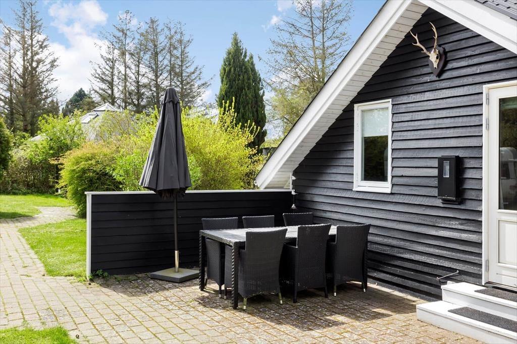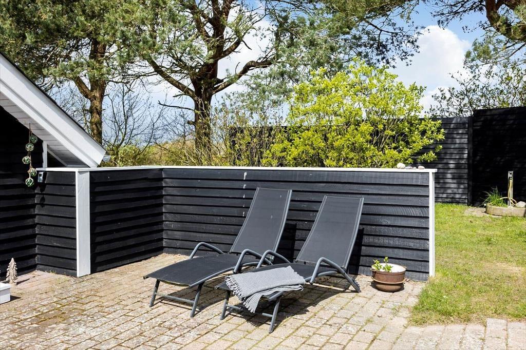 På begge sider af sommerhus er der dejlige terrasser, så når solen lokker dig udenfor, skal du vælge, om du vil sidde mod øst eller vest. På østterrassen kan du sidde under åben himmel, men dog lidt skærmet af et læhegn, mens terrassen mod vest er overdækket og har et fint kig ud over den grønne have. Ved shelteret er der også en hyggelig opholdsplads – endda med et lille bålsted – og takket være udebruseren kan selv morgenbadet foregå her i havens grønne omgivelser. Til børnene står der en trampolin, og græsplænen passer perfekt til vikingespil og andre sjove havelege.