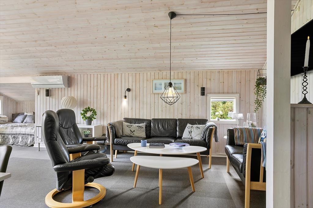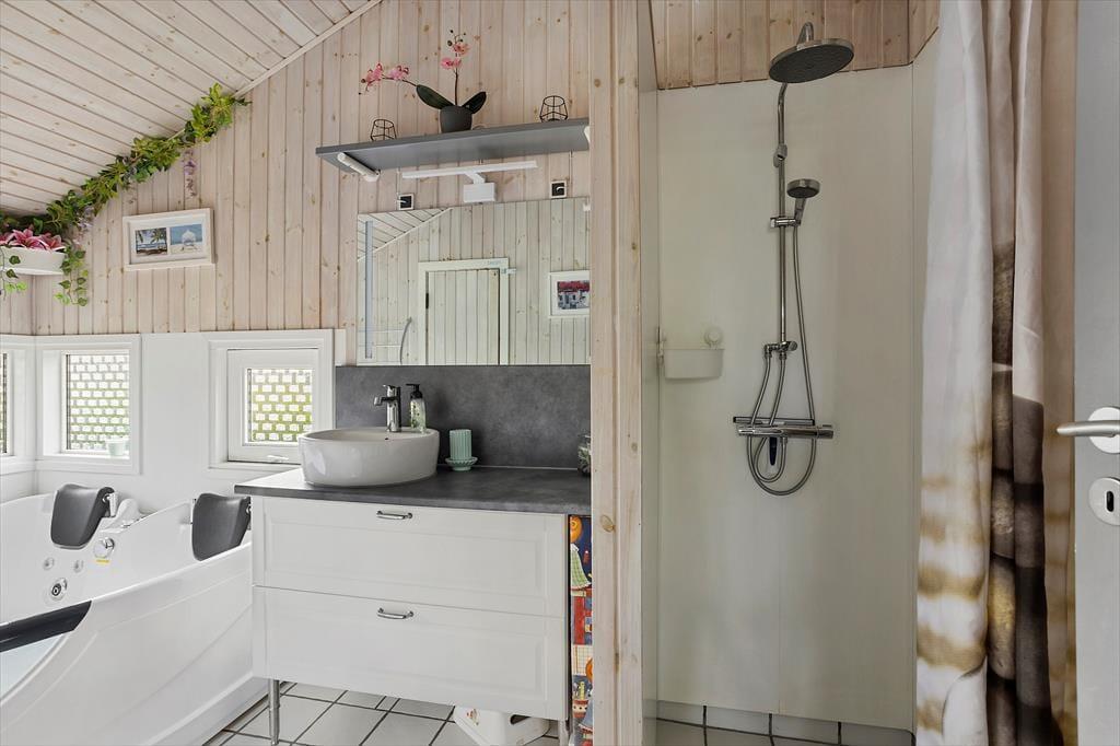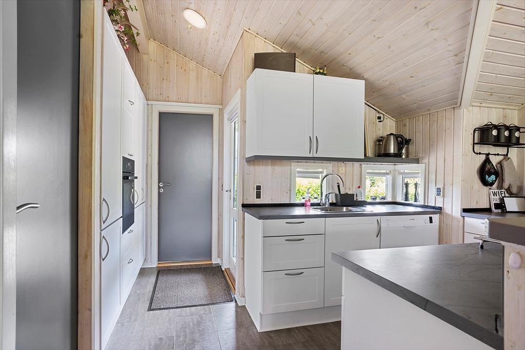 Når du træder ind i dette velholdte sommerhus, vil du straks føle dig hjemme i de lyse og indbydende rum. Huset har et stilfuldt køkken-alrum med brændeovn og varmepumpe, hvilket sikrer en behagelig temperatur året rundt. Køkkenet er moderne og veludstyret, perfekt til at tilberede lækre måltider til familien. Efter en dejlig middag kan I samles i stuen omkring brændeovnen, hvor varmen og de dansende flammer skaber en hyggelig atmosfære. Sommerhuset har to badeværelser, hvoraf det ene er udstyret med et spabad – ideelt til afslapning efter en dag fuld af oplevelser.