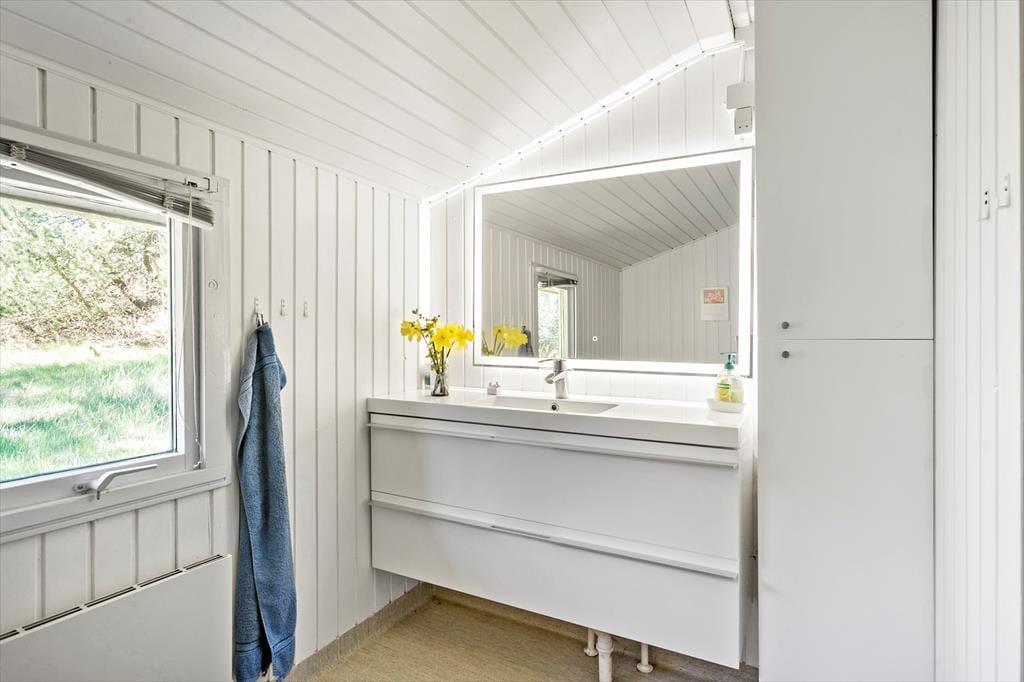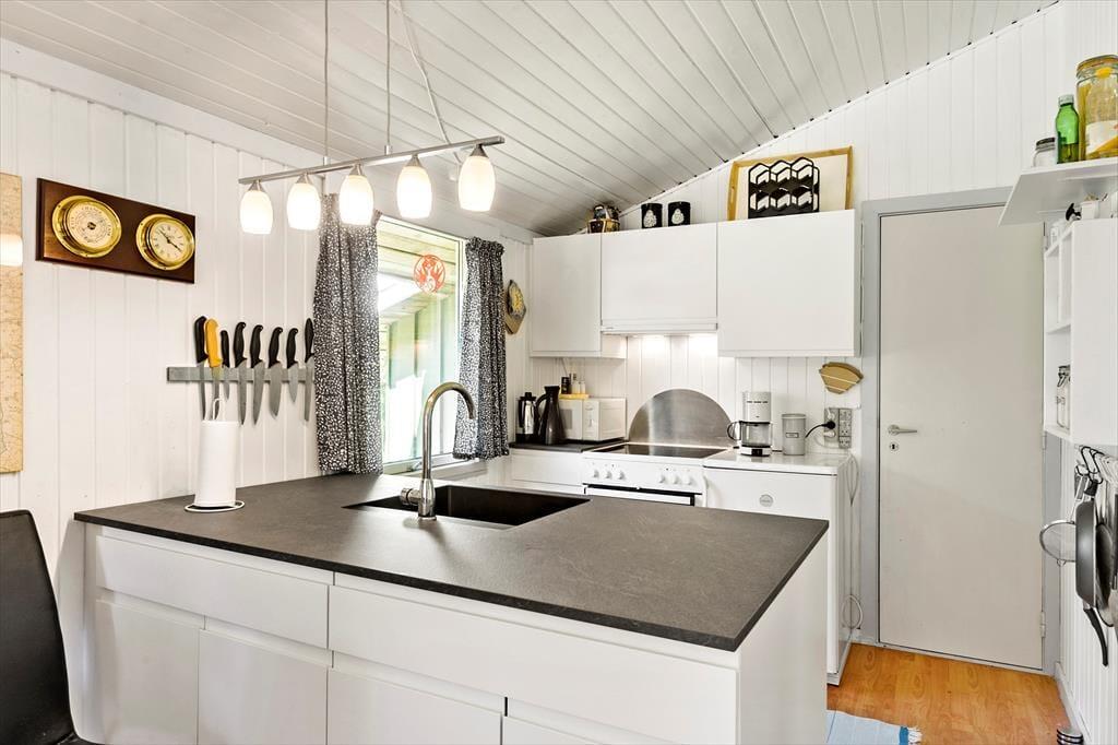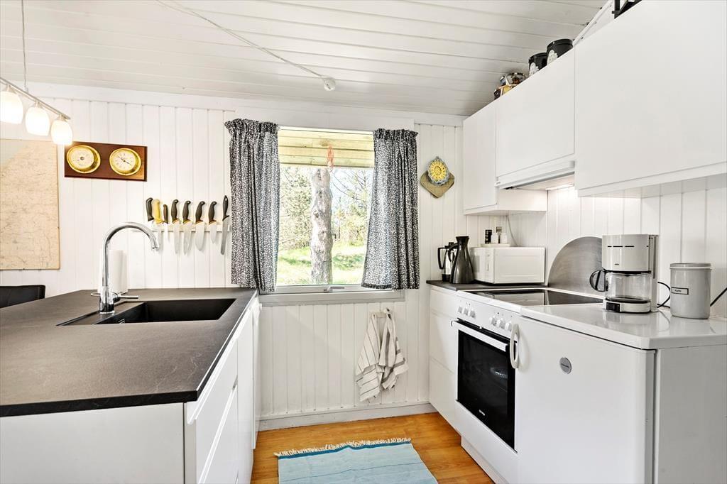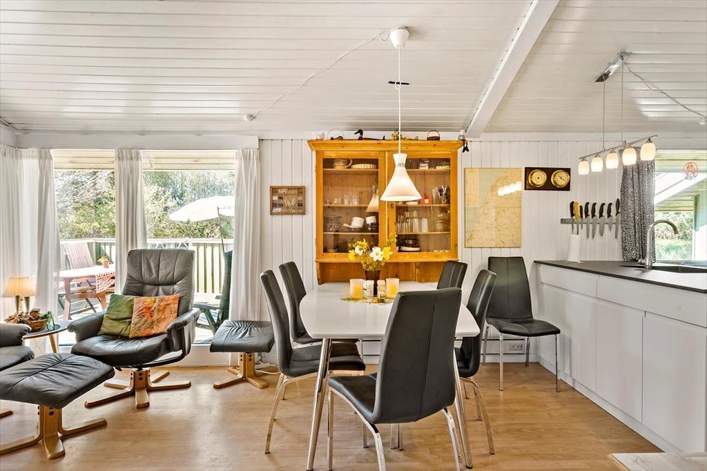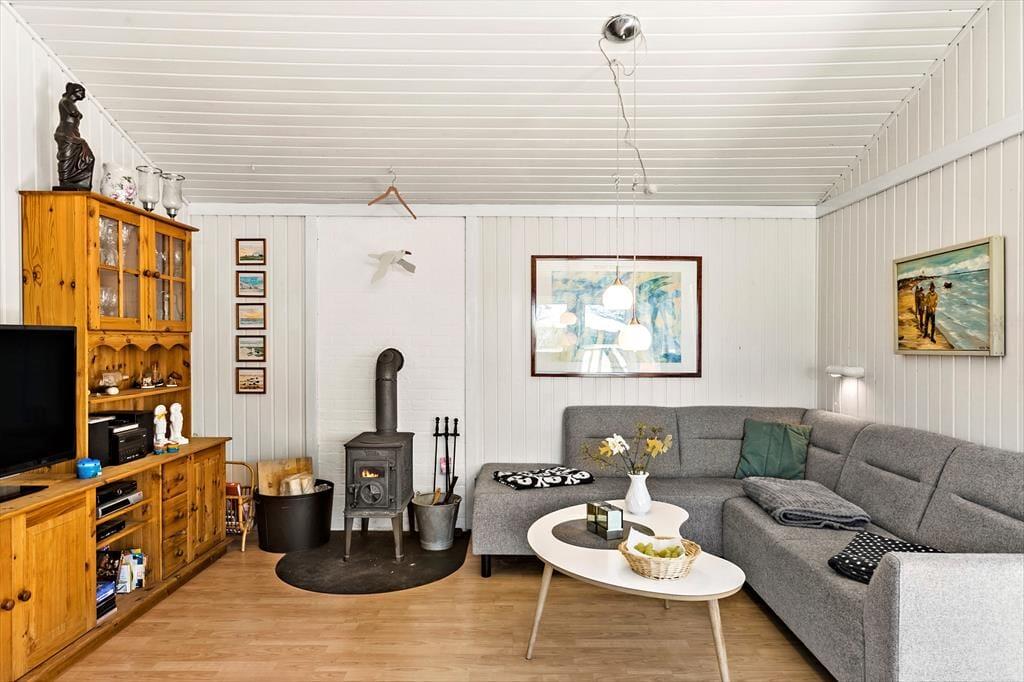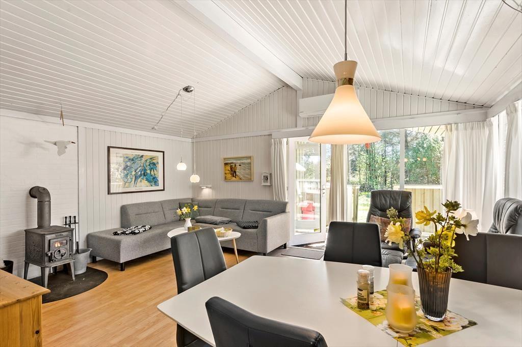 Dette velindrettede sommerhus byder på en åben og indbydende atmosfære, hvor det lyse og moderne køkken/alrum er centrum for samværet. De store vinduer i stuen giver et fantastisk lysindfald og en dejlig udsigt til den store naturgrund, som omkranser huset. I stuen kan du slappe af foran brændeovnen og nyde varme og hygge, mens du ser ud på den frodige have. Huset har tre gode soveværelser, så der er rigeligt med plads til hele familien, og det funktionelle køkken indbyder til madlavning med gode råvarer fra området.