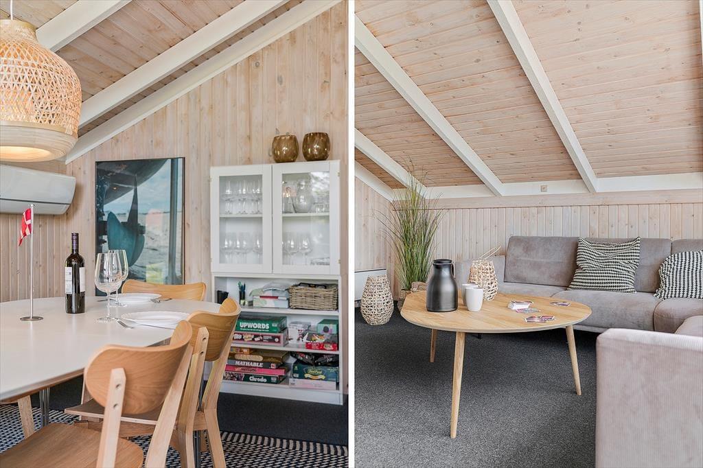 Indenfor mødes du af en velholdt og hyggelig indretning, hvor charmerende detaljer og en god atmosfære skaber de perfekte rammer for et afslappet ophold. Sommerhuset er niveauopdelt, hvilket giver en spændende og funktionel indretning. Køkkenet og spiseafdelingen ligger først i huset og giver adgang til den hyggelige stue, hvor du kan træde ned og finde dig til rette i de komfortable møbler. Her er der alle muligheder for at slappe af efter en lang dag, enten foran den knitrende brændeovn eller mens du ser ud på den smukke natur gennem de store vinduespartier. De gode soveværelser giver plads til hvile og ro, og badeværelserne er både pæne og praktiske. Husets velindrettede rum og det gode lysindfald gør, at du hurtigt føler dig hjemme.