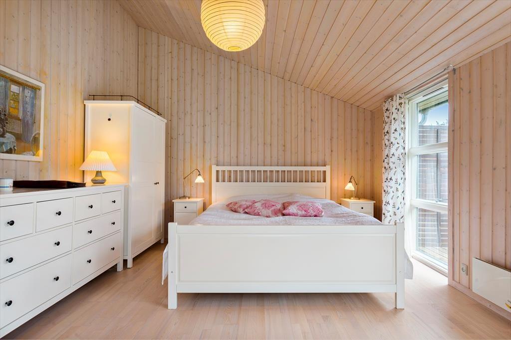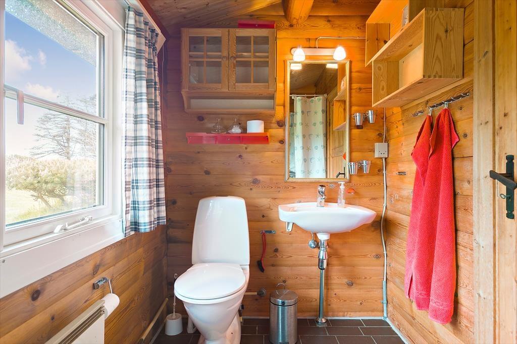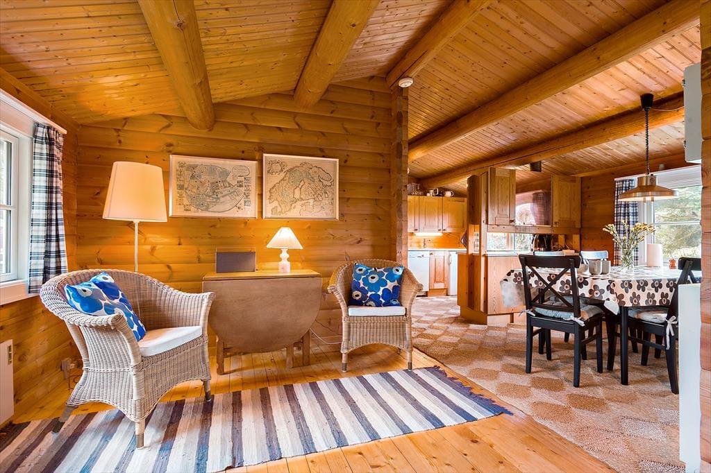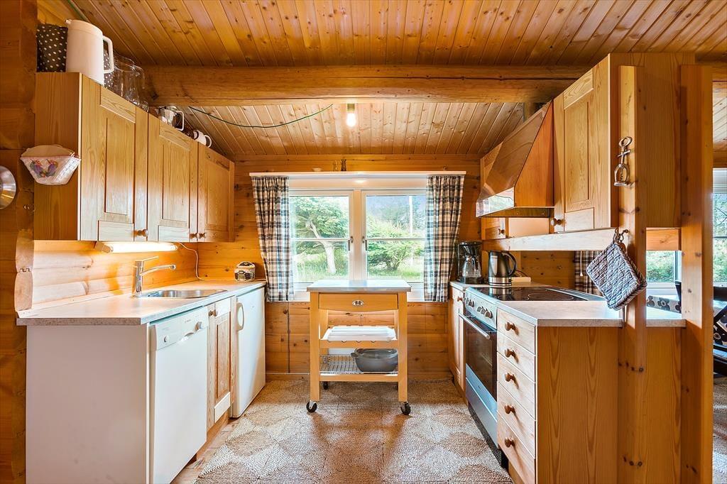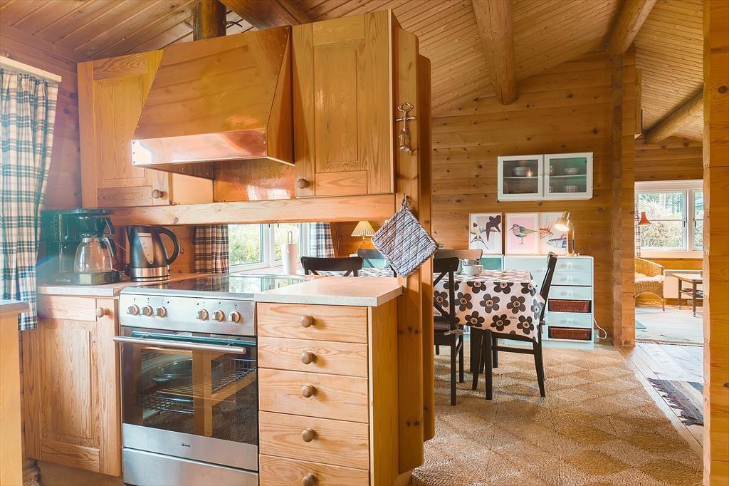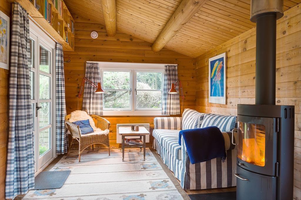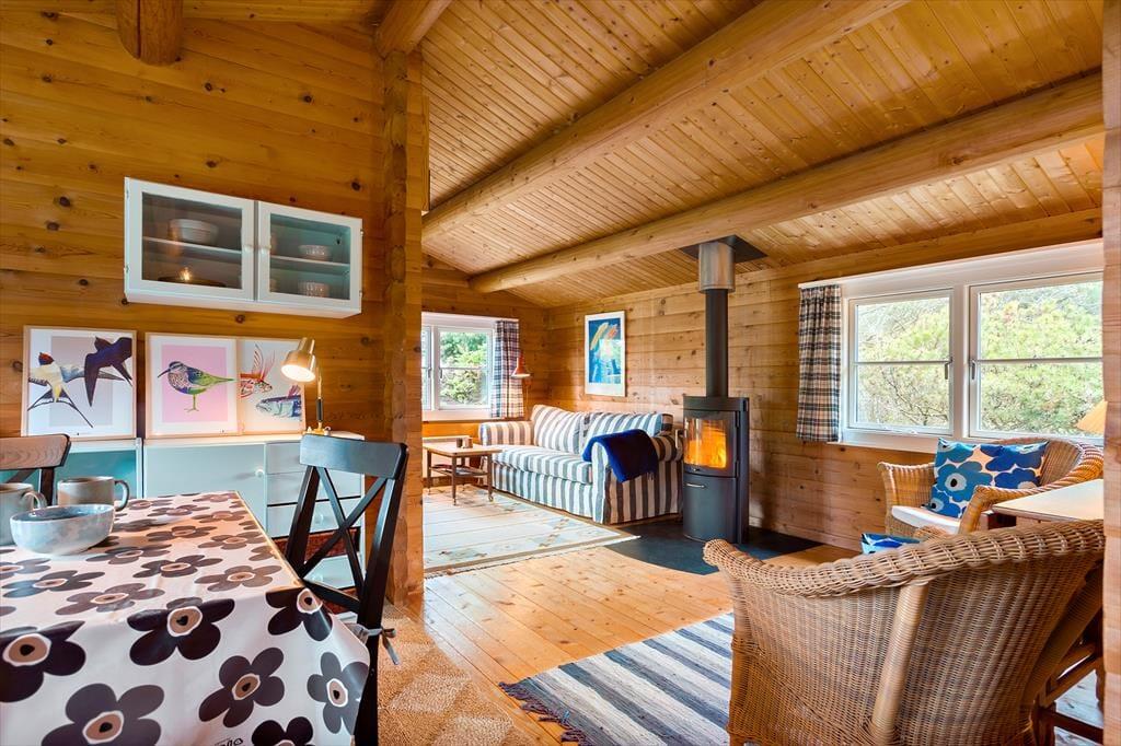 Sommerhuset er indrettet i en skøn kombination af det traditionelle sommerhus i trækonstruktion og det moderne sommerhus med lyse vægge, dette skaber en ekstrem hyggelig og varm stil med et godt lys fra de store vinduer i den ene ende af huset mens der i den anden del er mindre vinduer og mere hygge. Huset har 2 stuer; i den første stue er der en dejlig sofa, tv og dette betegnes som aktivitetsrummet hvor der er plads til at samles og spille spil. I den nye del af huset er endvidere et nyt og moderne badeværelse og et skønt soveværelse. Træder man ind i den anden del af huset, som er den originale del, kommer man ind i husets hjerte - Det lille køkken kombineret med den anden spisestue og sofastue med brændeovn. Her kan man sidde i de hyggelige møbler og drømme sig tilbage i tiden. I den originale del af huset, er her også badeværelse samt 2 værelser. Virkelig et charmerende hus på alle områder.