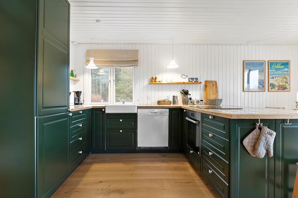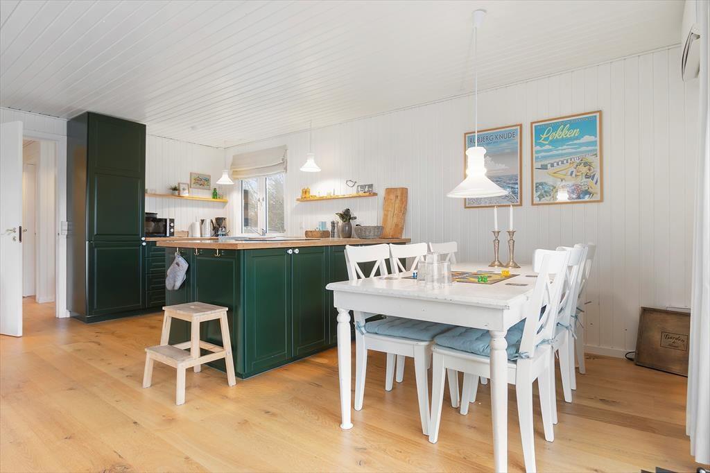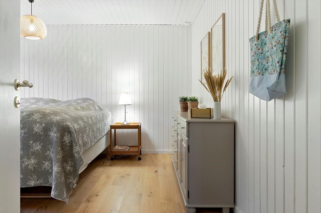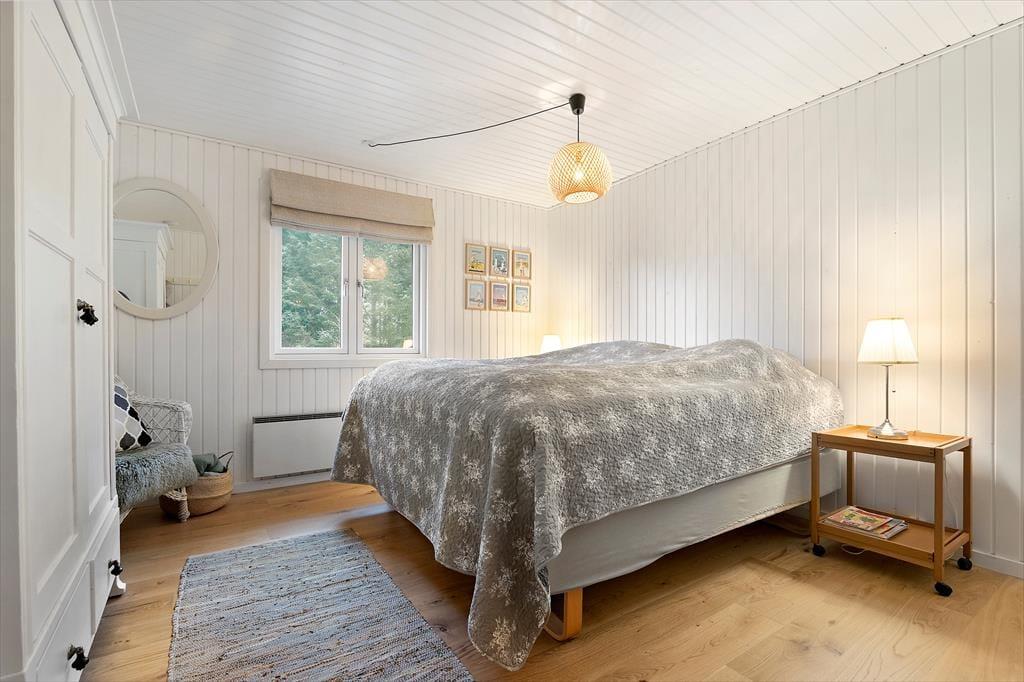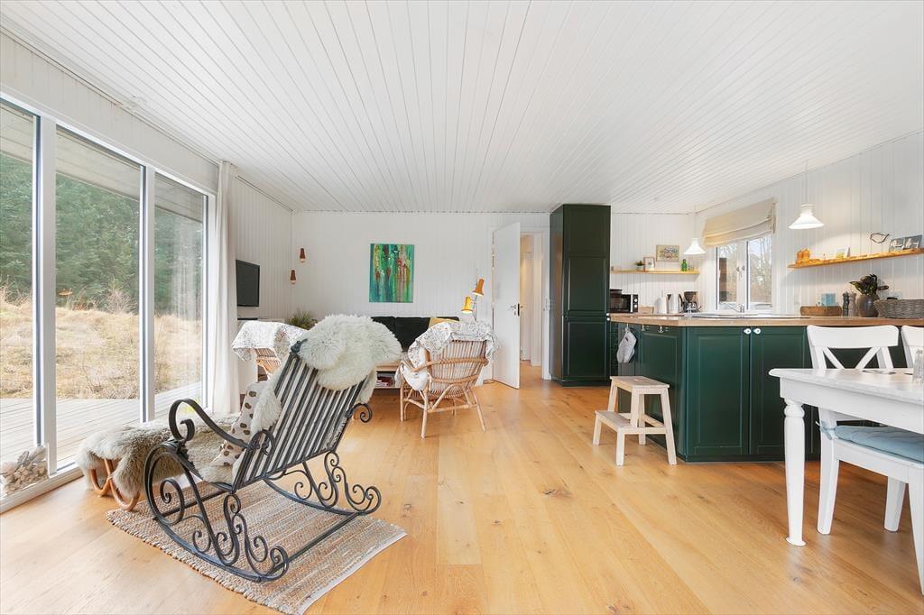 En grundig renovering er fundet sted i 2020, så sommerhuset fremstår særdeles flot både inde og ude. Inden døre er husets 86 m2 fornuftigt fordelt på tre soveværelser, et badeværelse og en dejlig stue med åbent køkken, og overalt er de hvidmalede trævægge og det charmerende interiør med til at sikre en særligt god sommerhusstemning. Selvom alle rum er indbydende, er det nu nok stuen, I kommer til at spendere flest af døgnets vågne timer i. Her kan I hygge jer med madlavningen, sidde længe omkring spisebordet eller slænge jer i sofaafdelingen, mens I streamer serier på fladskærmen eller bare nyder skæret fra brændeovnen.