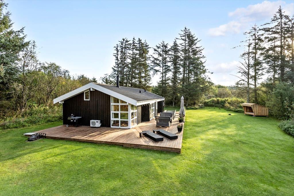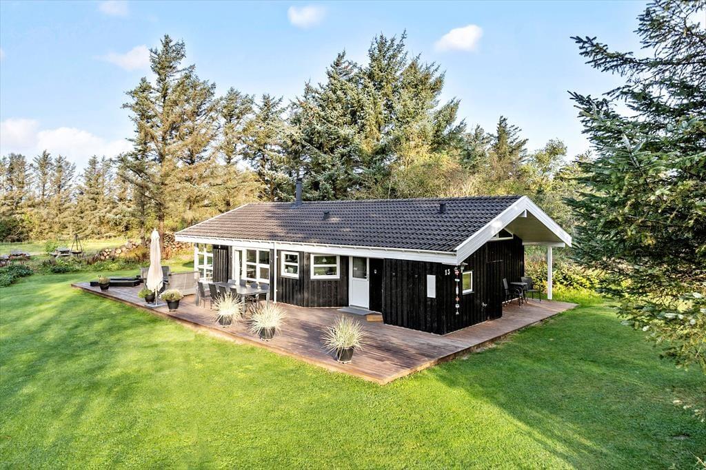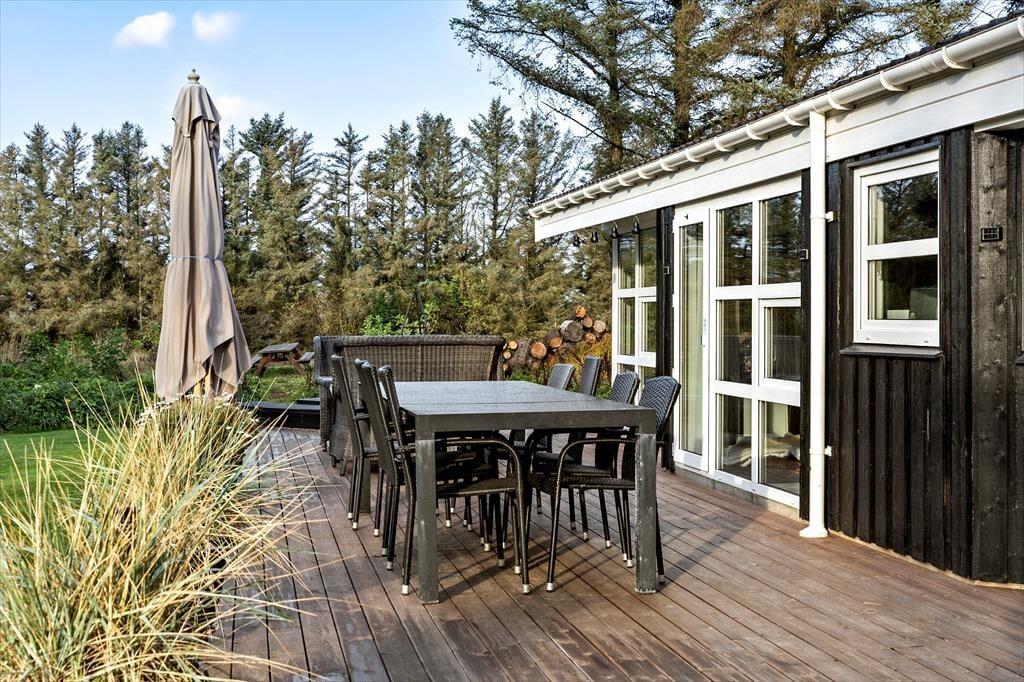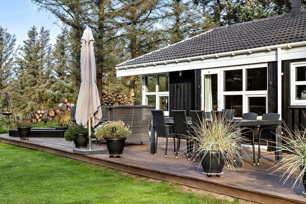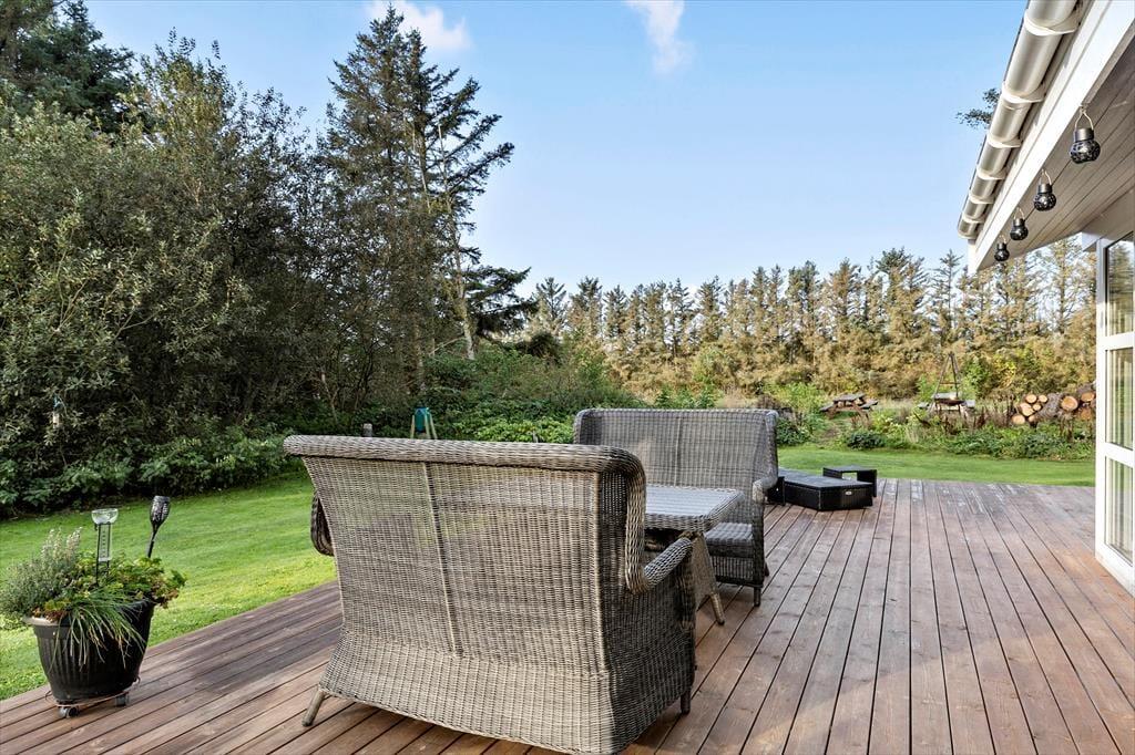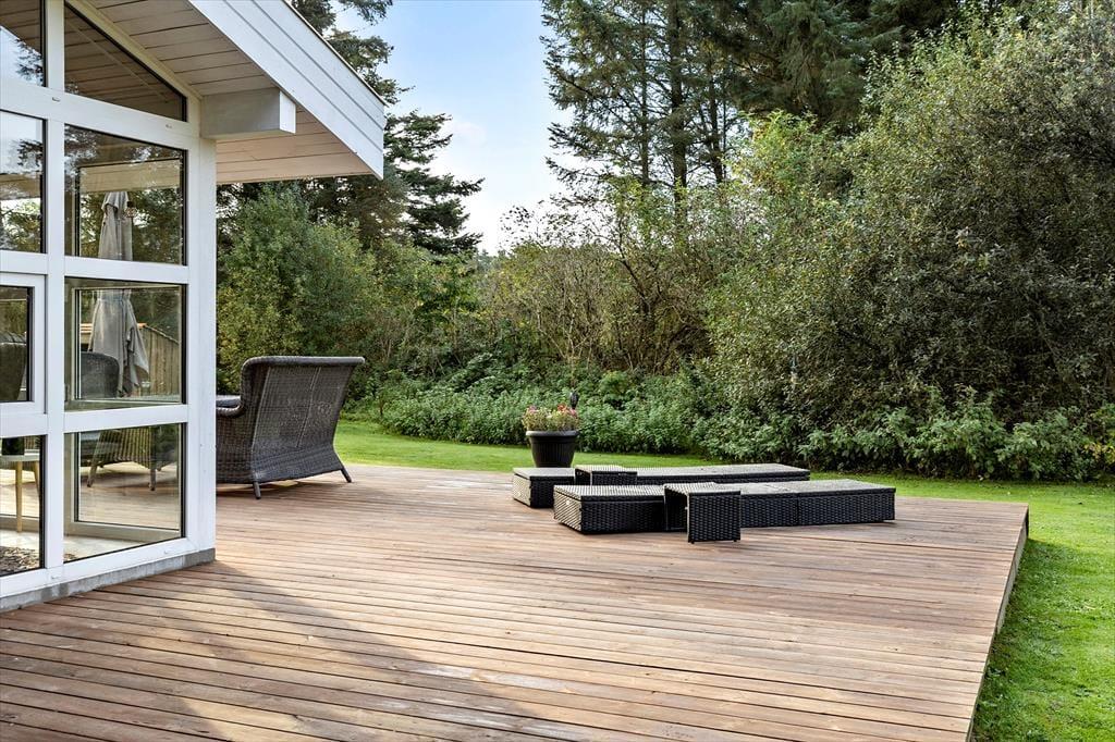 Fra stuen har I direkte adgang til en stor træterrasse, så driverlivet kan nemt flyttes ud i det fri, når vejret er til det. Solforholdene er gode, og der er havemøbler, liggestole, parasol og en grill til rådighed, så I har et glimrende udgangspunkt for at slappe af og nyde ferien under åben himmel. På grunden er der for øvrigt en god græsplæne at lege på, og randbeplantningen skærmer hele herligheden godt af.