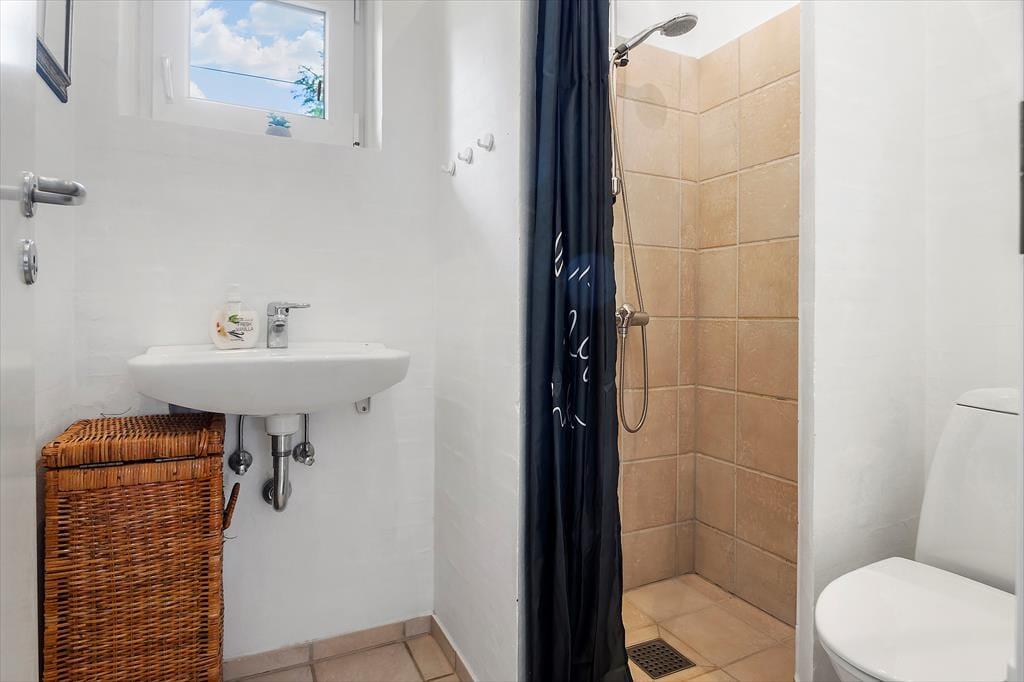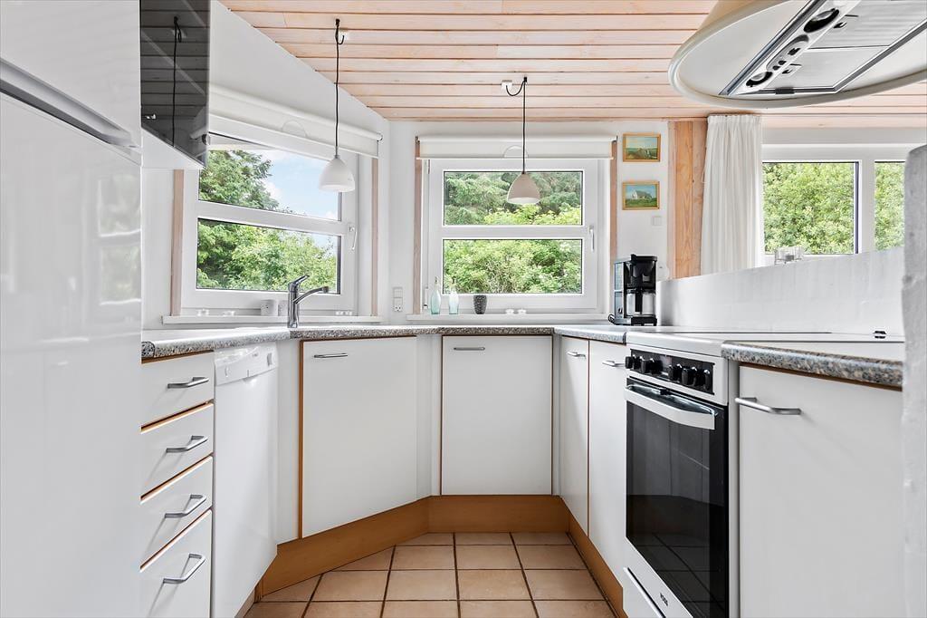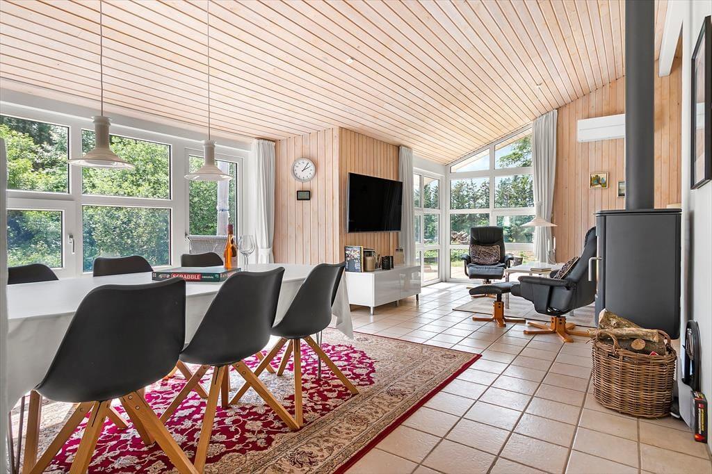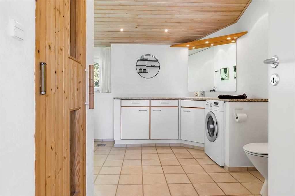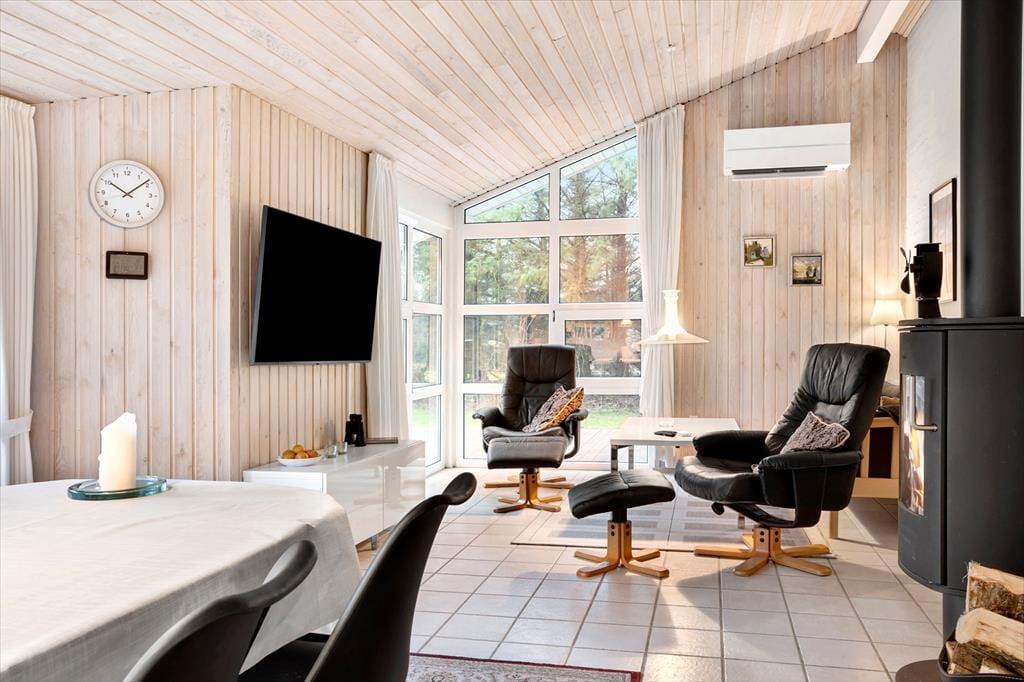 Det 95 m2 store sommerhus har en glimrende planløsning til seks personer. Stue og køkken er forbundne, så I kan nyde samværet hen over halvmuren, mens en del af selskabet laver mad og resten hygger sig med kortspil eller krydsogtværser ved spisebordet. Måske kravler de yngste op for at lege på hemsen, og der er også rig mulighed for at slænge sig med en god bog i stuens sofaafdeling. Der er tre gode soveværelser, og på det største af de to badeværelser er der ikke bare bruser, men også spabad og sauna til livsnyderne.
