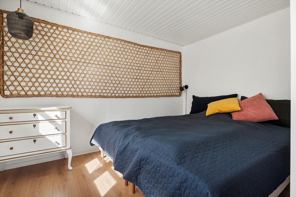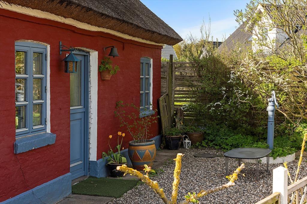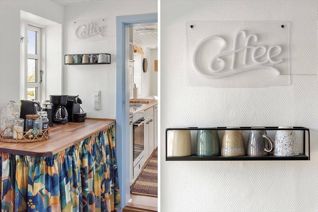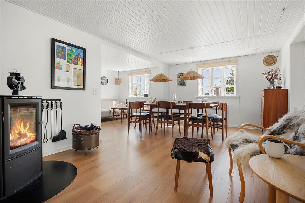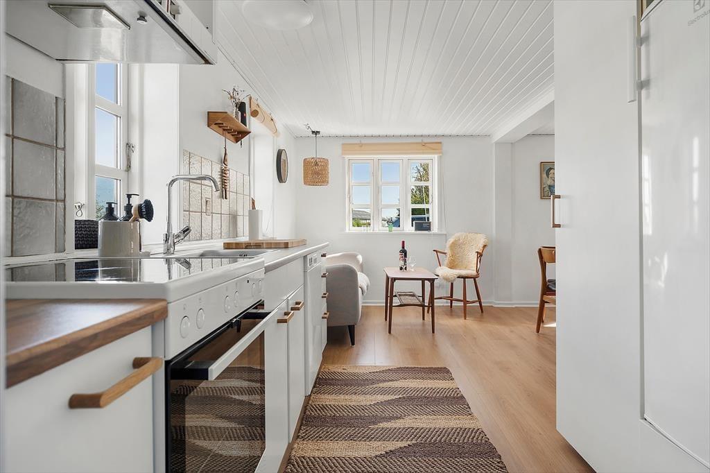 Det hyggelige stråtækte hus, der er opført helt tilbage i år 1900 og nænsomt renoveret i 2025, byder velkommen med en lys og hjemlig atmosfære. Huset kombinerer sin originale charme med moderne komfort – og det mærkes, allerede når du træder ind. Indretningen er skandinavisk og varm med lyse overflader, rustikke detaljer og møbler, der indbyder til afslapning. Det åbne opholdsrum skaber en naturlig ramme for fællesskabet, hvor køkken og stue smelter sammen, så samtalerne kan fortsætte fra madlavning til sofahygge. Det store lysindfald og udsigten til de grønne omgivelser gør rummet til et naturligt samlingspunkt, og her kan du virkelig mærke, at ferien er i gang.
