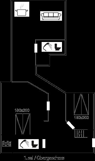 Der er i alt 2 soveværelser. Sovepladserne fordeler sig på: 4 sovepladser i dobbeltsenge. 2 sovepladser i enkeltsenge. 2 af disse sovepladser befinder sig på husets hems. Derudover er der 1 stk. barneseng.