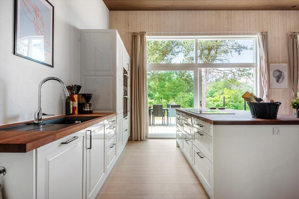 Indenfor mødes du af en varm og lys atmosfære, hvor alt indbyder til afslapning. Det store opholdsrum bliver hurtigt centrum for ferielivet – her er højt til loftet, masser af dagslys og et naturligt flow mellem madlavning, samvær og stille stunder. I det moderne køkken kan du nemt trylle måltider frem, og med både stort køleskab og stor fryser er der god plads til alt fra kolde drikkevarer til hjemmelavede ferieretter og is til de varme dage.