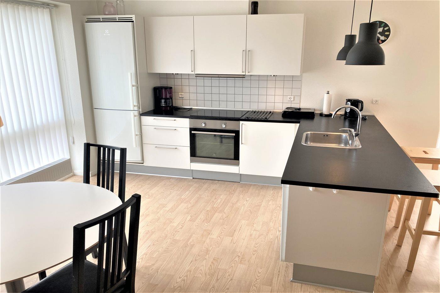 Køkkenet er udstyret med 1 køleskab. Der er 4 induktionskogeplader, varmluftovn samt opvaskemaskine.