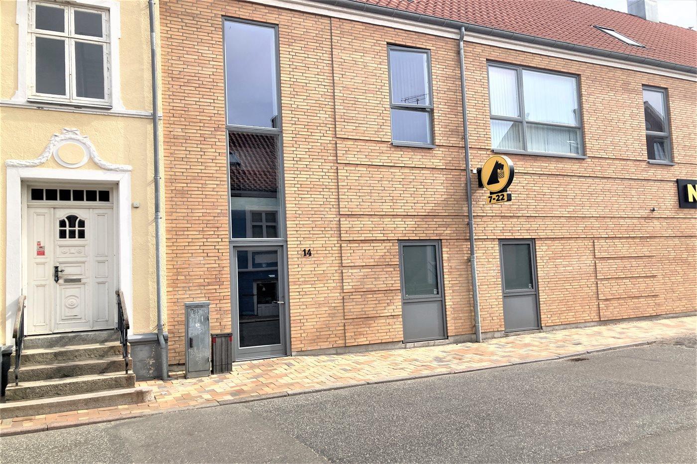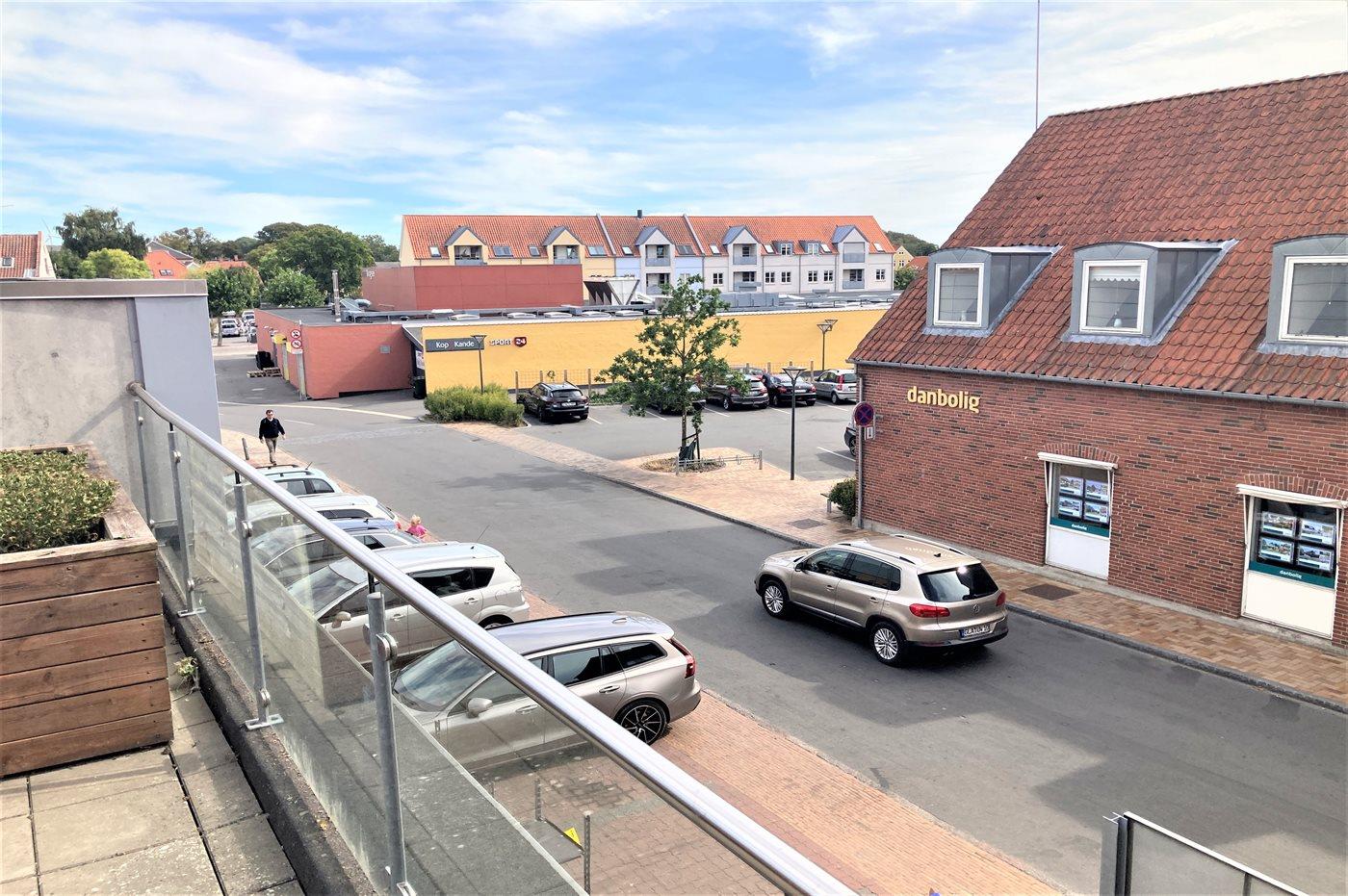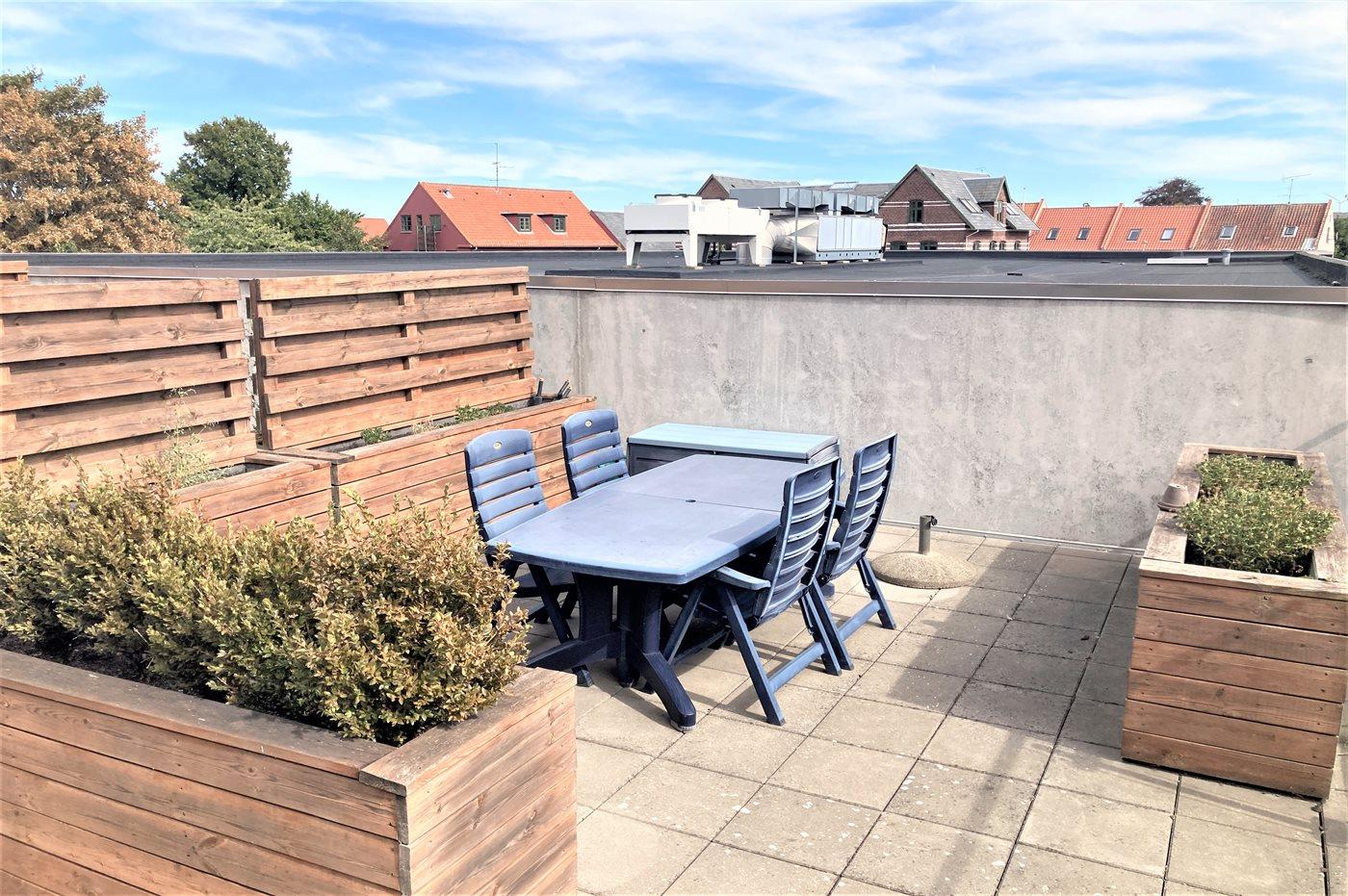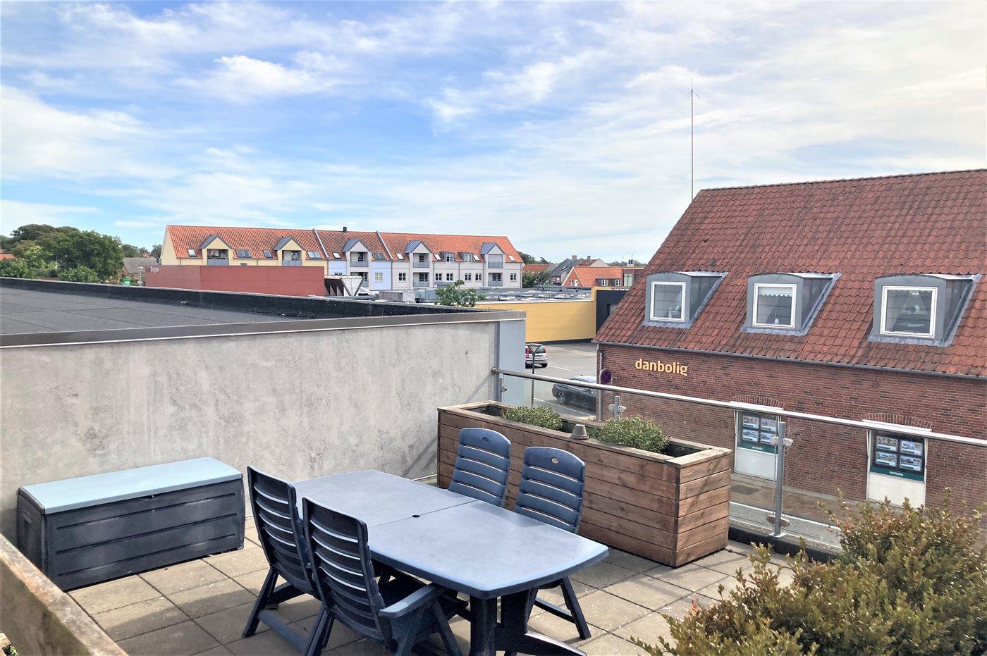 Lys og moderne ferielejlighed i hjertet af historiske Rudkøbing med terrasse nær havet og butik.