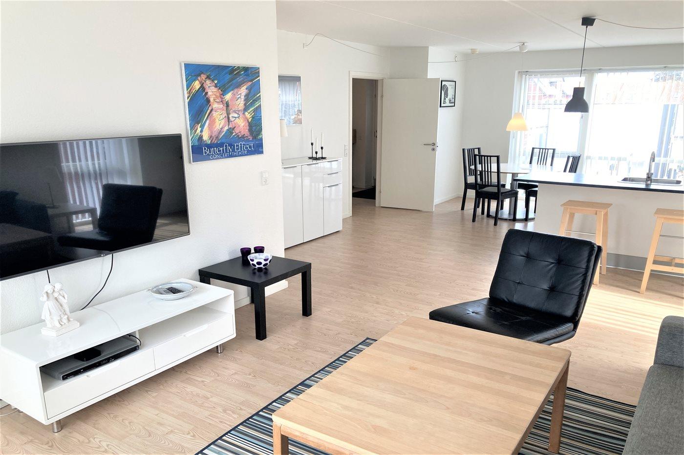 1 Smart-TV. 1 Apple-TV. DVD-afspiller. Radio. Der er mindst 4 danske kanaler. Der er trådløst internet til rådighed.