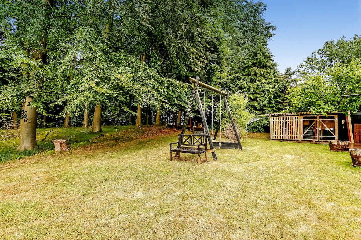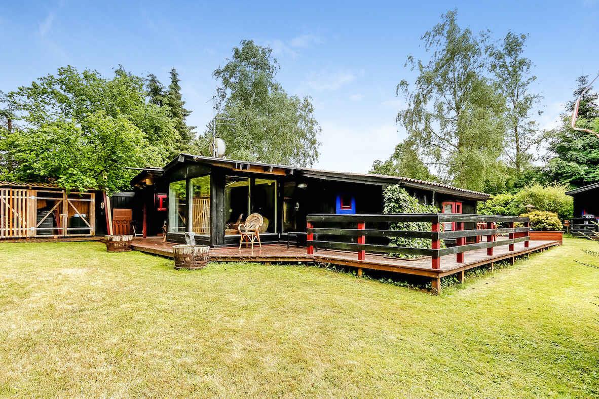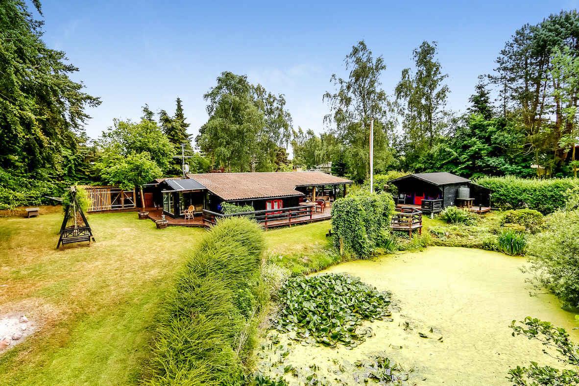 Feriehus på stor grund med en lille dam i haven.