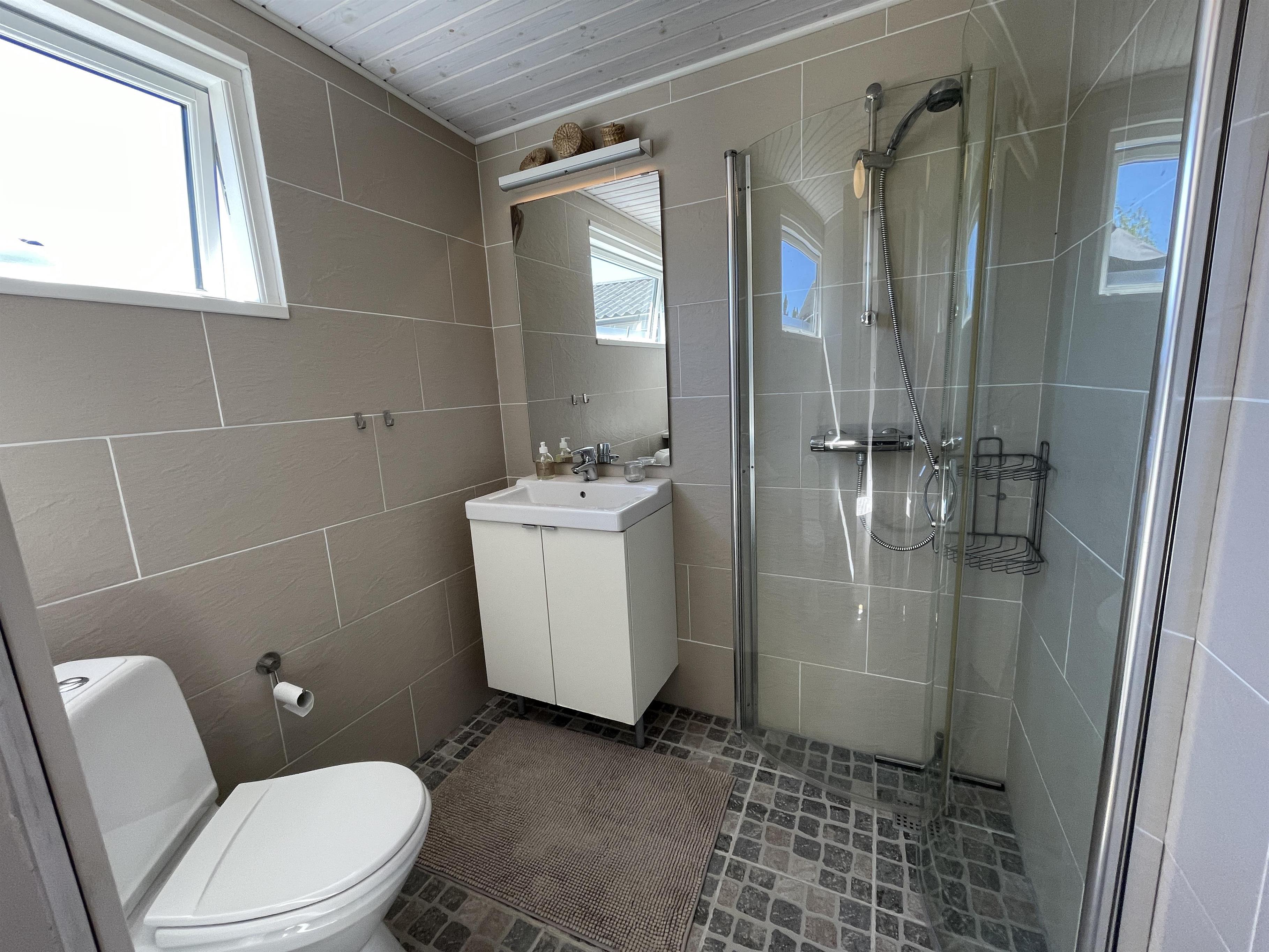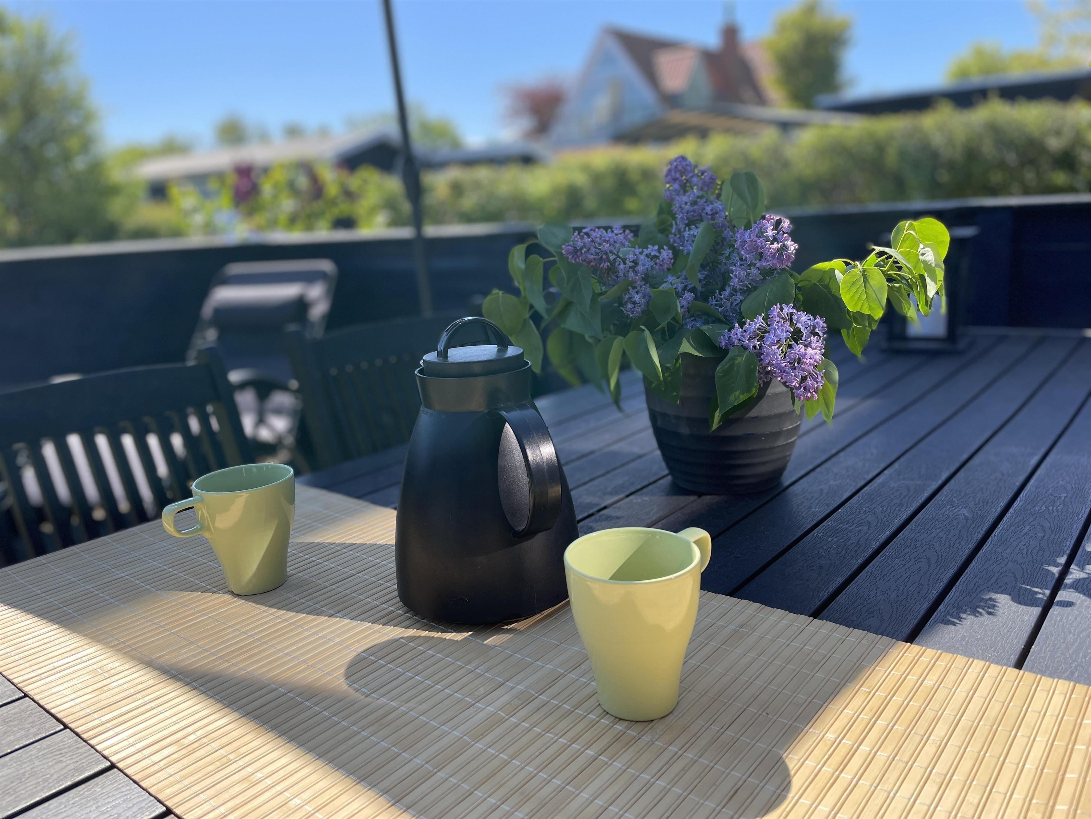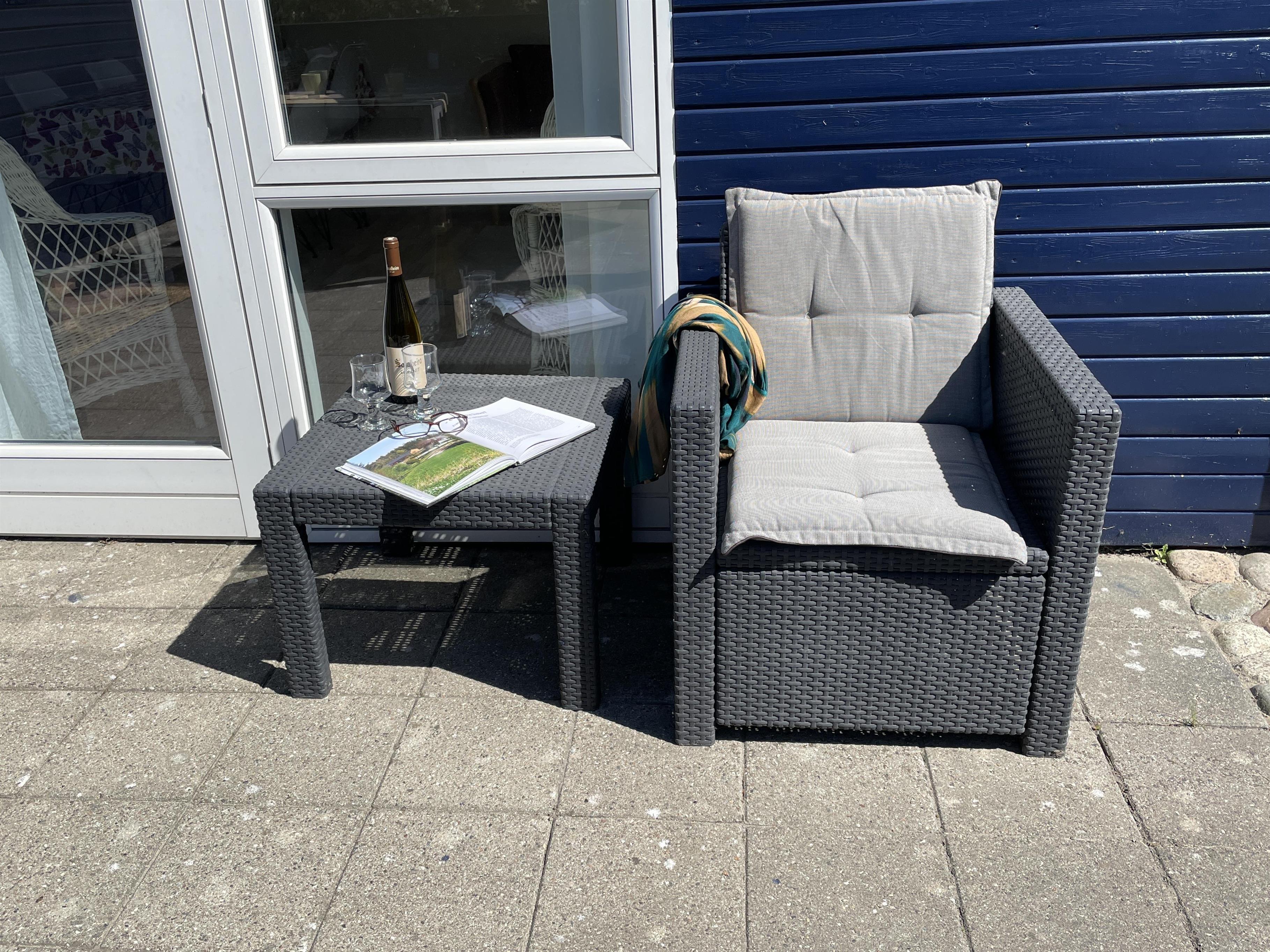 På en lille hyggelig afskærmet terrasse, kan du nyde solen og feriens dejlige måltider. Her er også gynger og sandkasse til mange timers leg med børnene.