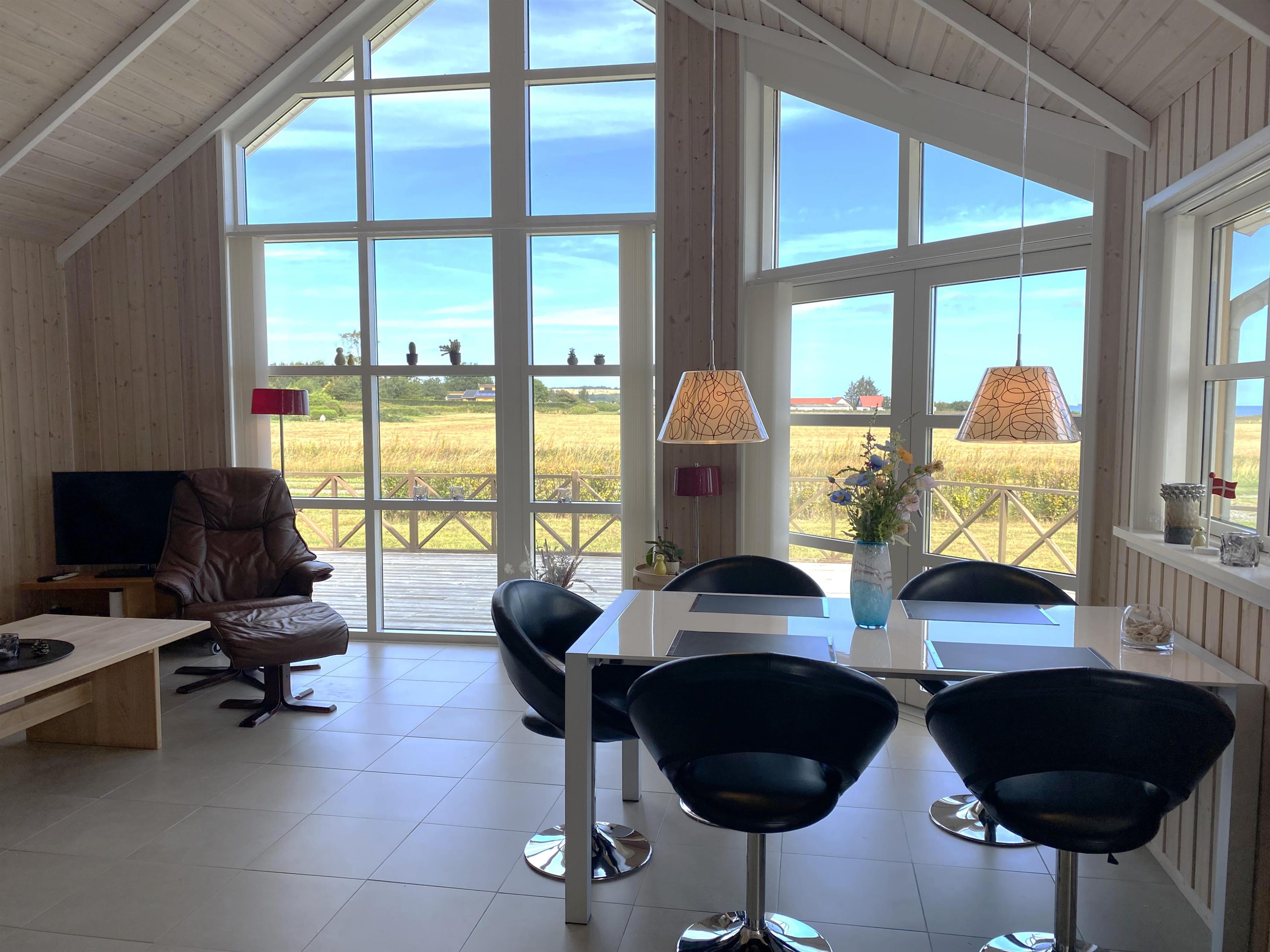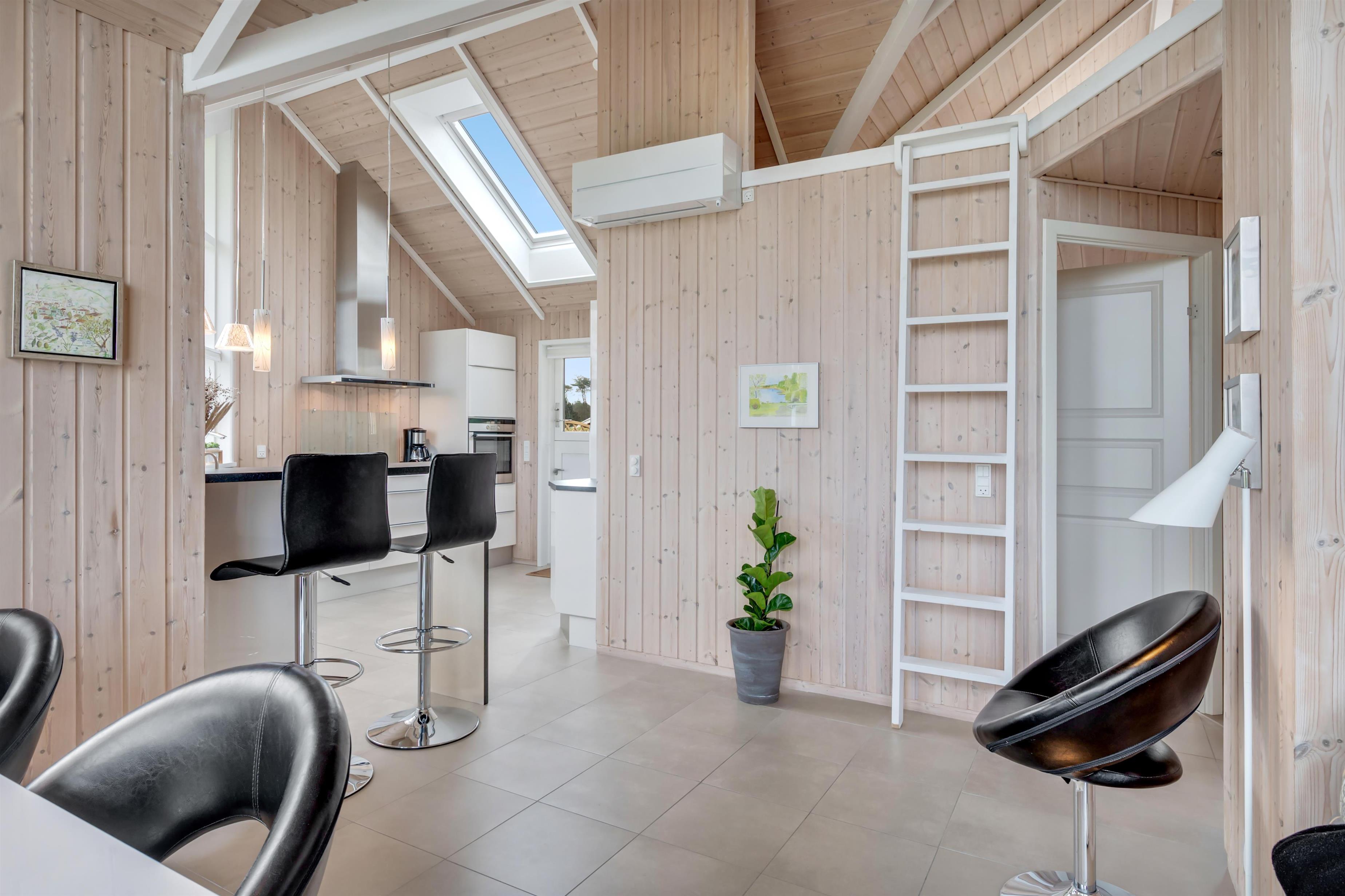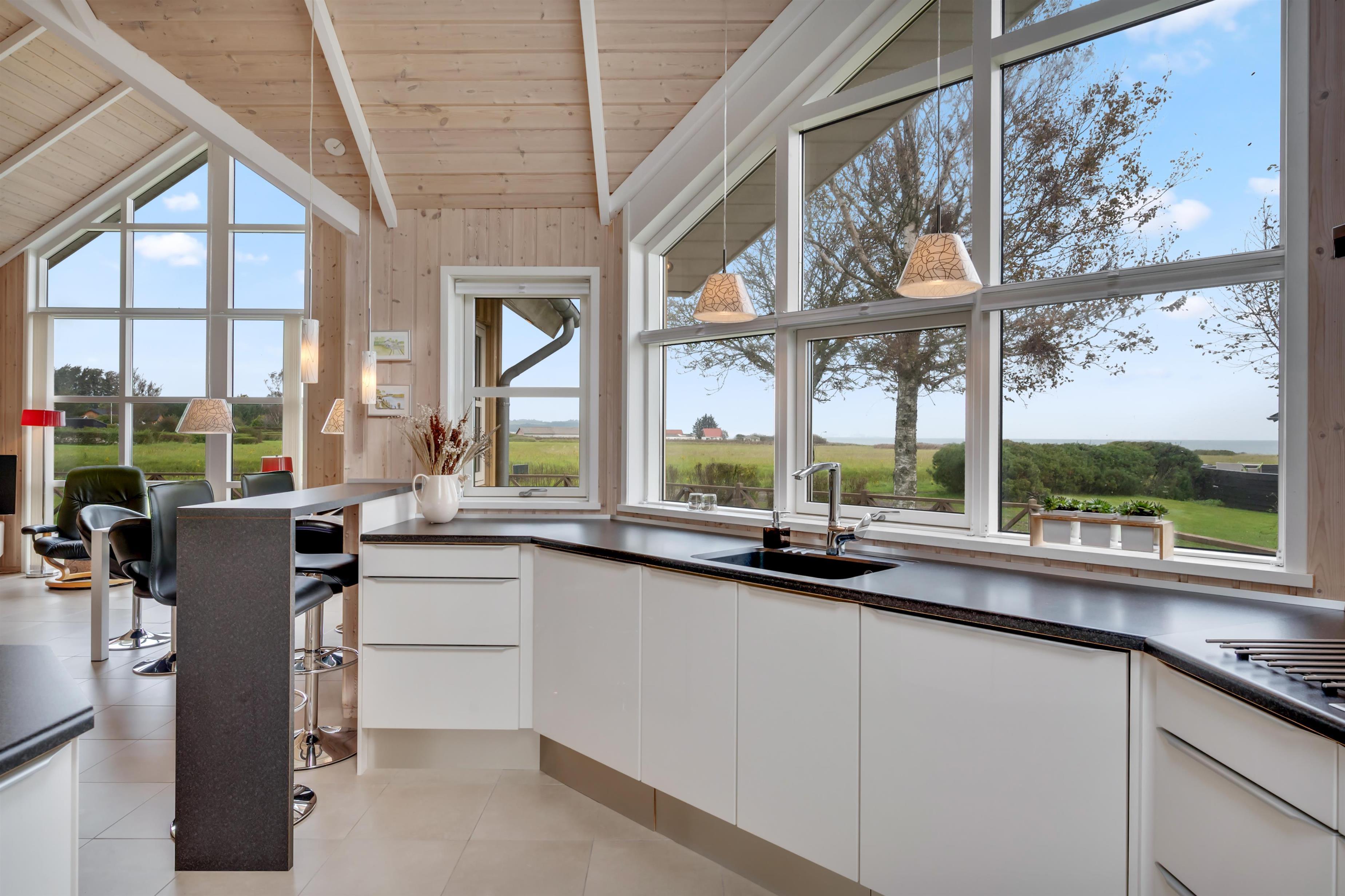 Alrummet er rummelig og lyst indrettet, med sofagruppe og spisebord vendt mod de store vinduer, der giver en dejlig udsigt til havet og naturen, samt i god forbindelse med køkkenet. I køkkenet finder man alt hvad man skal bruge til madlavning på induktionskomfuret eller grillen på terrassen. Derudover rummet køkkenet også indbygningsovn, køleskab, fryser og vaskemaskine/tørretumbler i et.