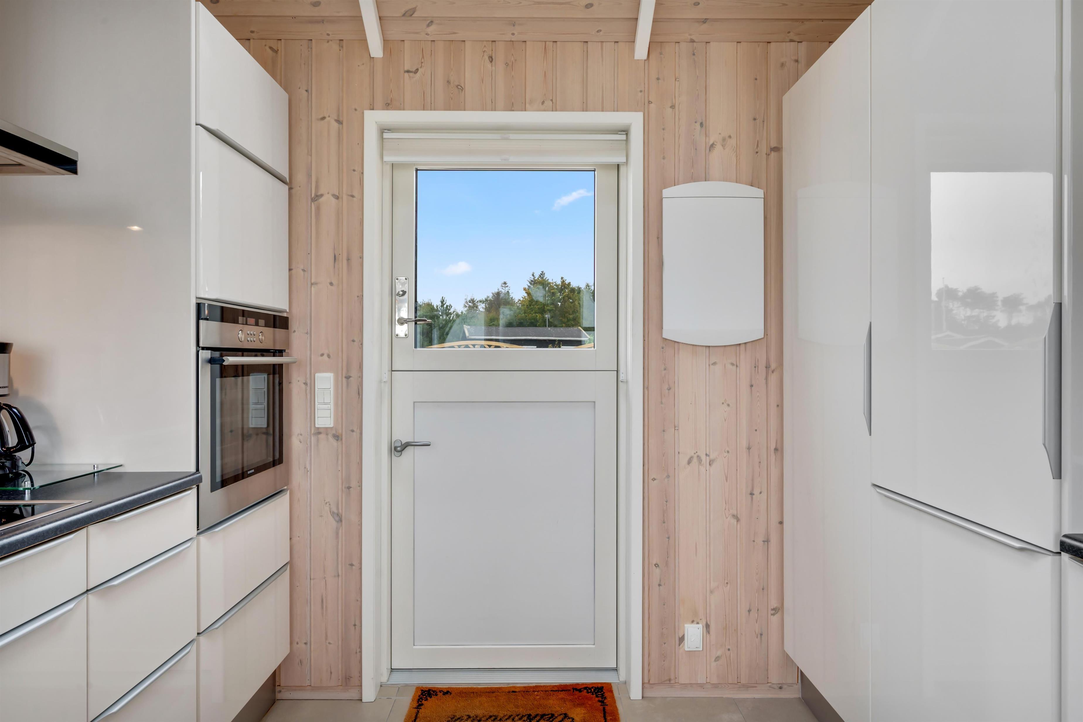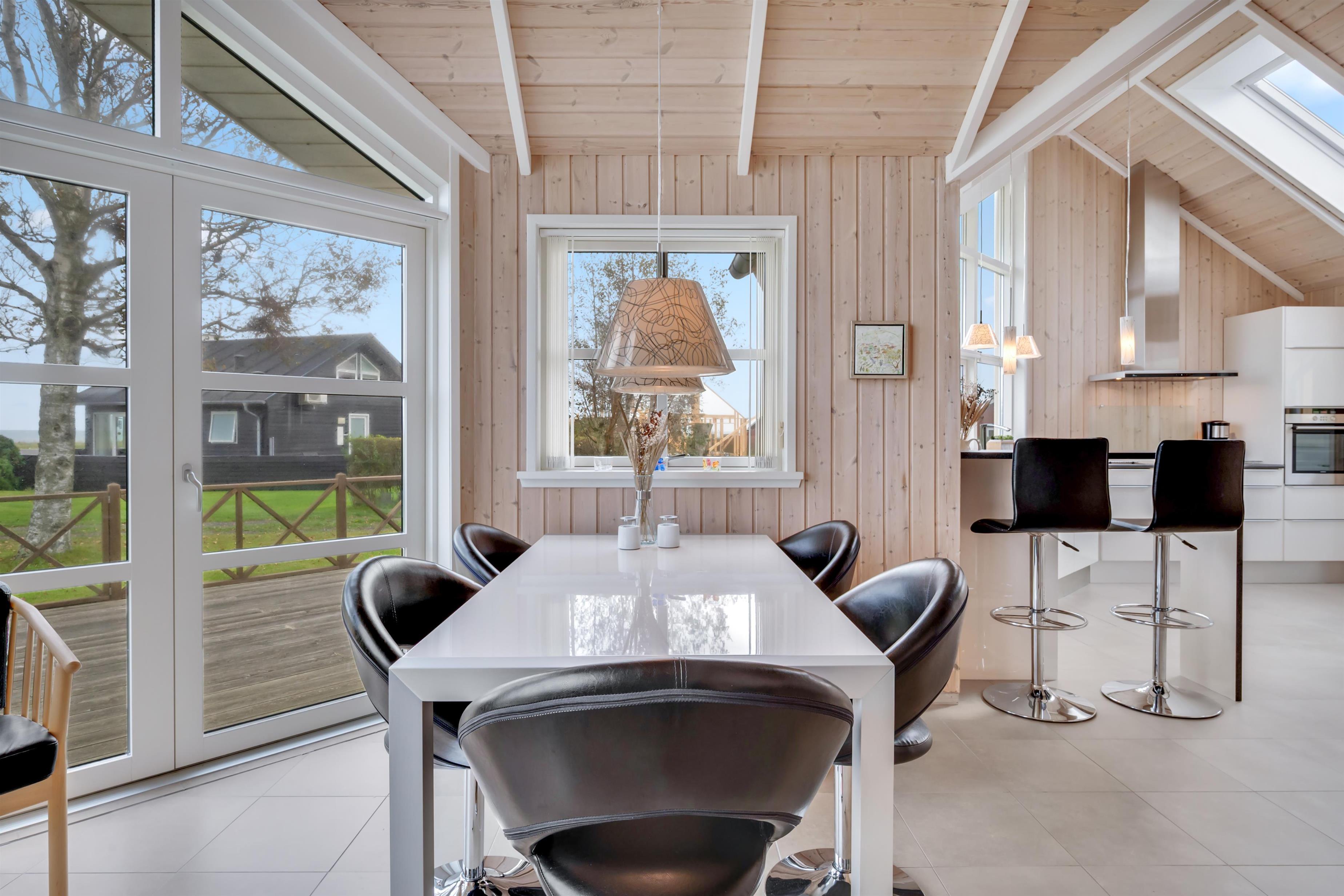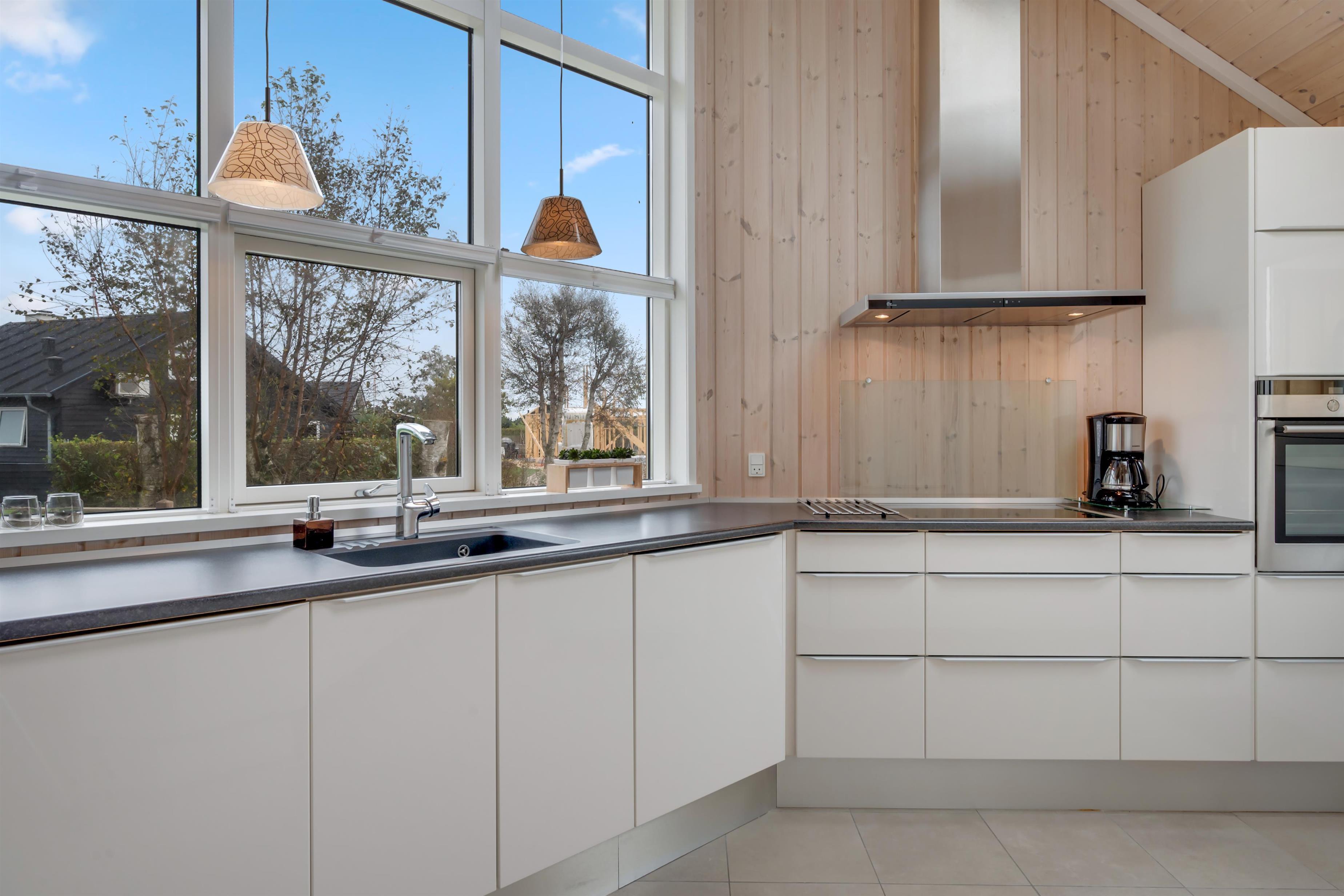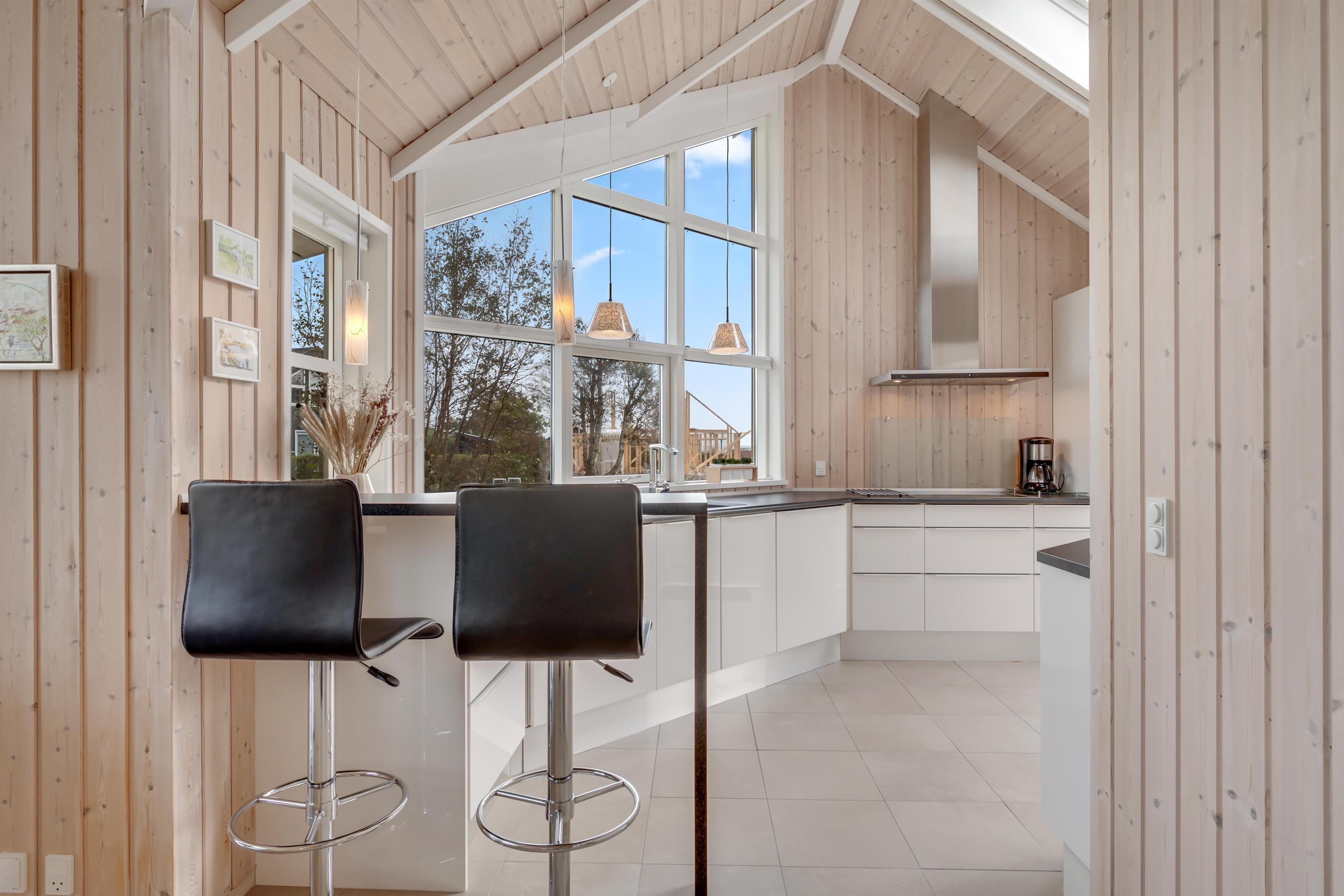 Alrummet er rummelig og lyst indrettet, med sofagruppe og spisebord vendt mod de store vinduer, der giver en dejlig udsigt til havet og naturen, samt i god forbindelse med køkkenet. I køkkenet finder man alt hvad man skal bruge til madlavning på induktionskomfuret eller grillen på terrassen. Derudover rummet køkkenet også indbygningsovn, køleskab, fryser og vaskemaskine/tørretumbler i et.