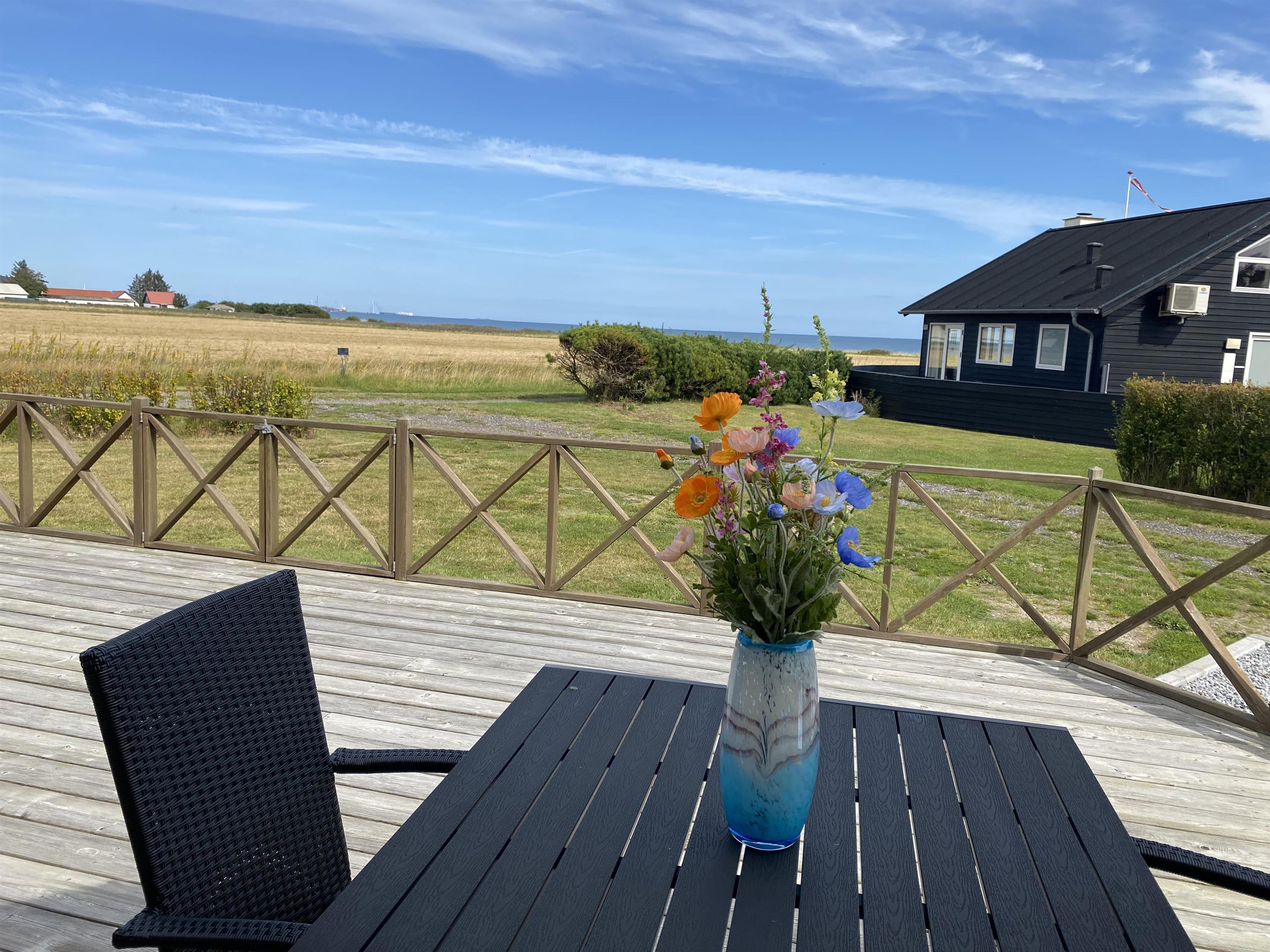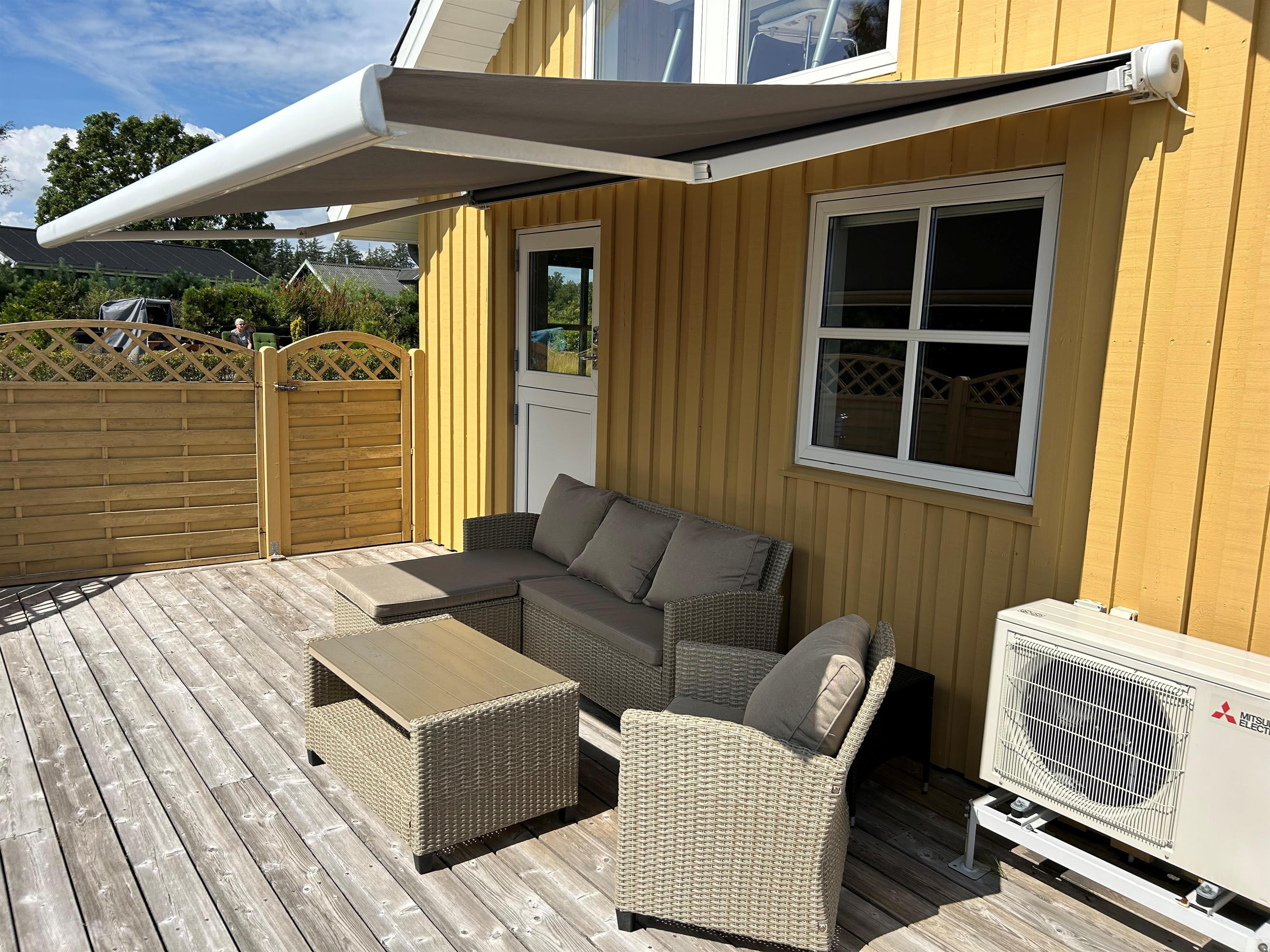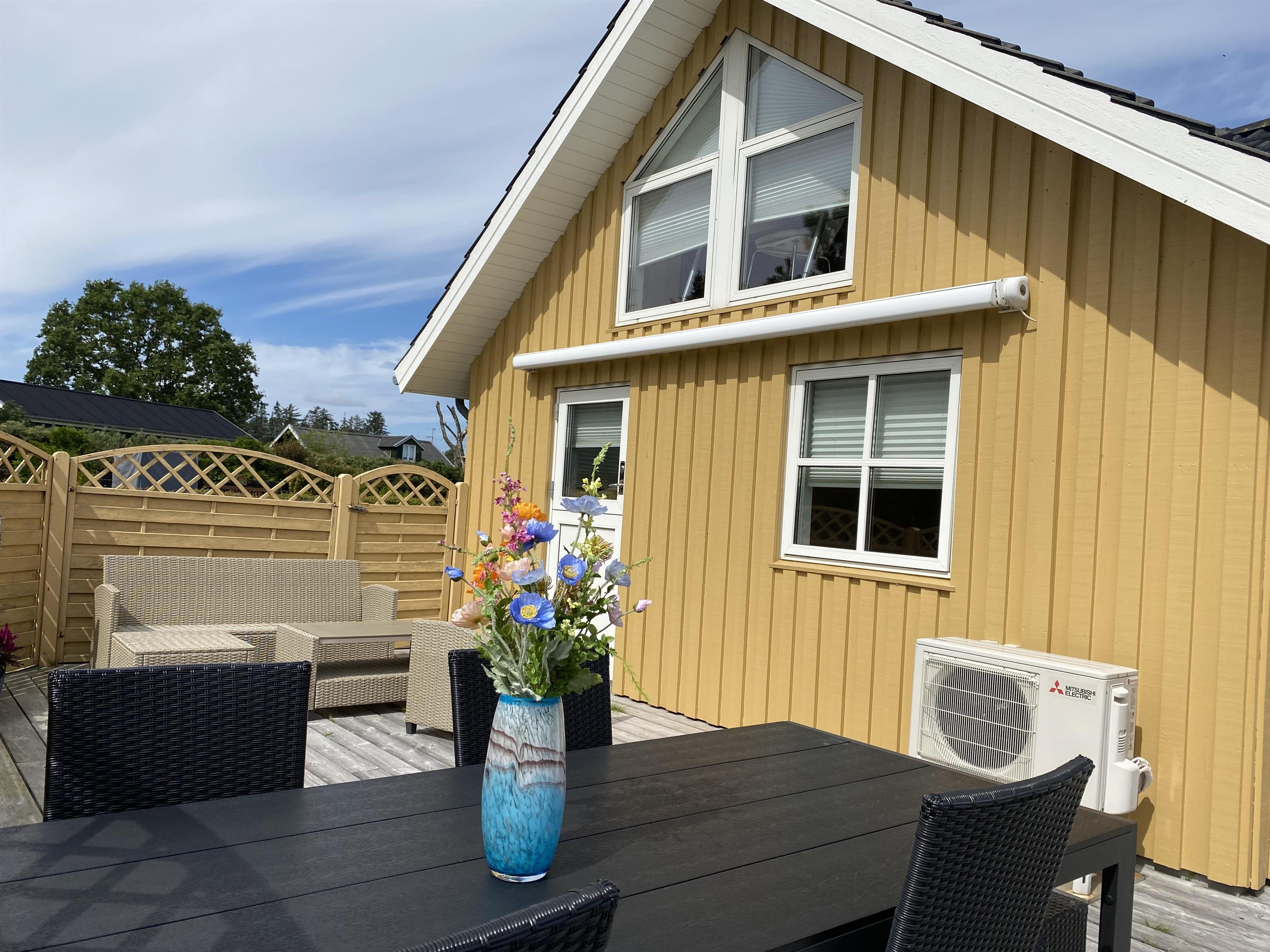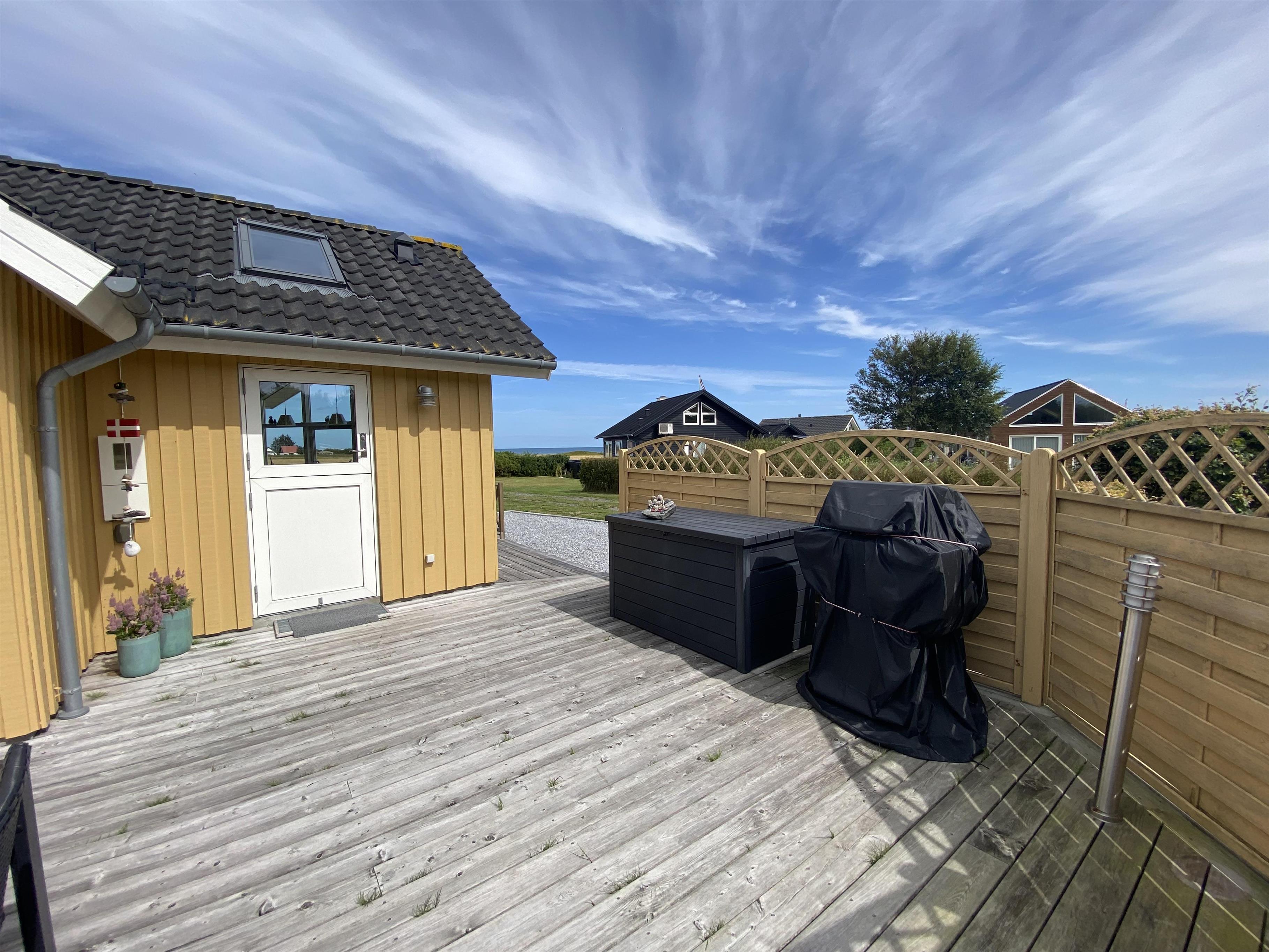 Dette hyggelige træsommerhus indbyder til samvær ude som inde, med den store græsplæne, de store terrasser og det store åbne køkken alrum. Den store træterrasse der næsten går hele vejen rundt huset, er mod syd afgrænset med et let hegn. Dette gør at man her kan side ugeneret ved terrasseborder eller i sofagruppe. Denne side af terrassen har også en stor makise (el-drevet), der giver god skygge på de varme dage. Fra huset går der en sti direkte til vandet, der ikke er mere end 175 meter væk.