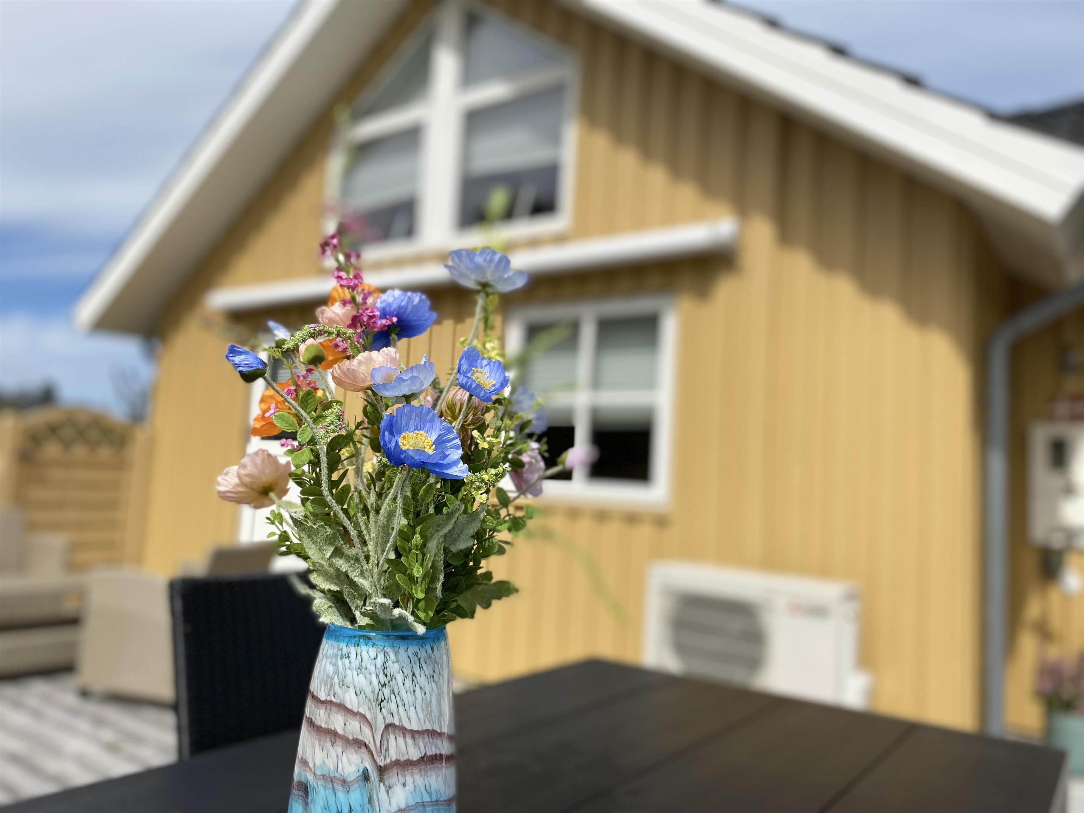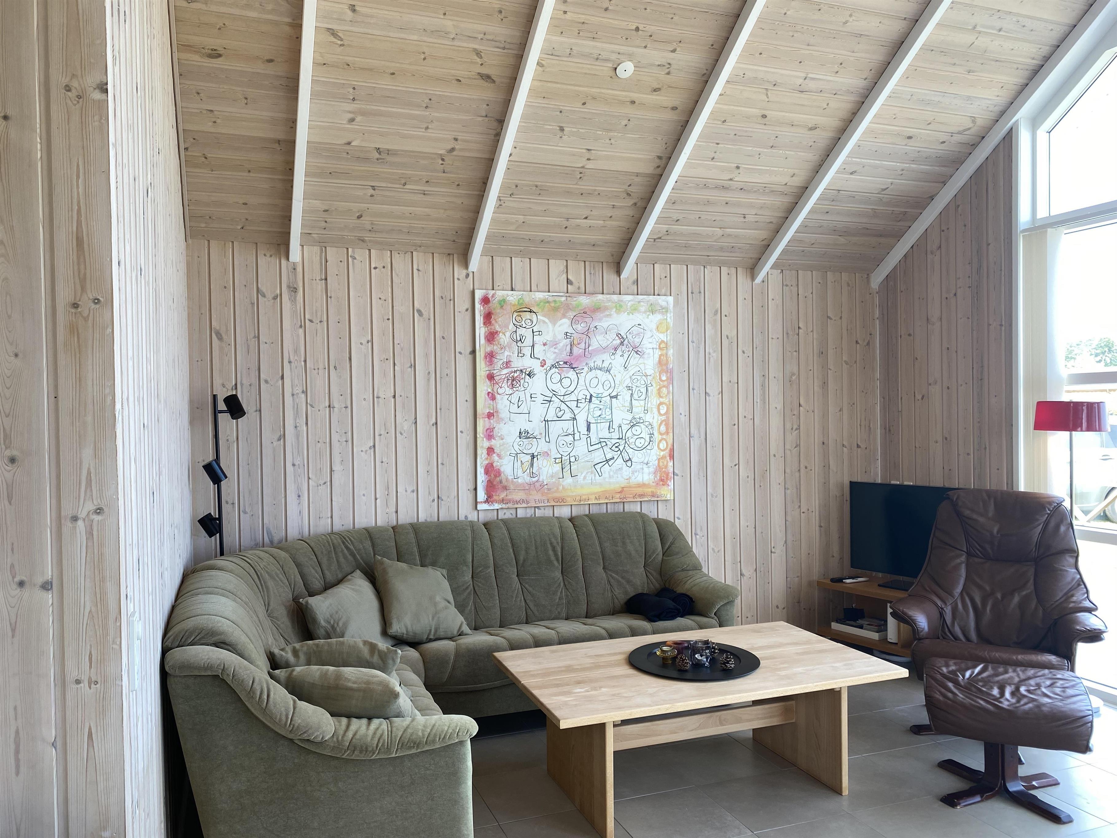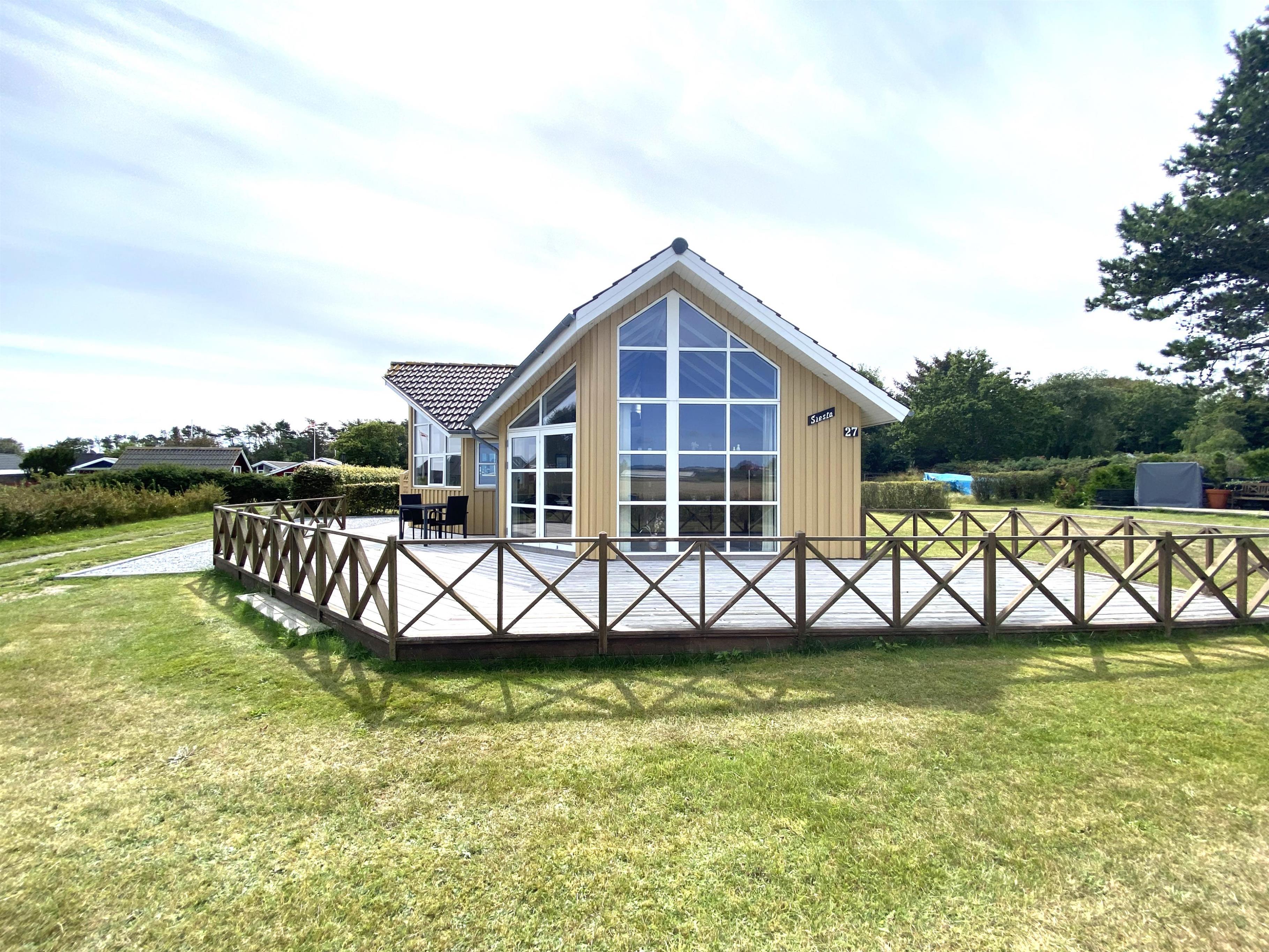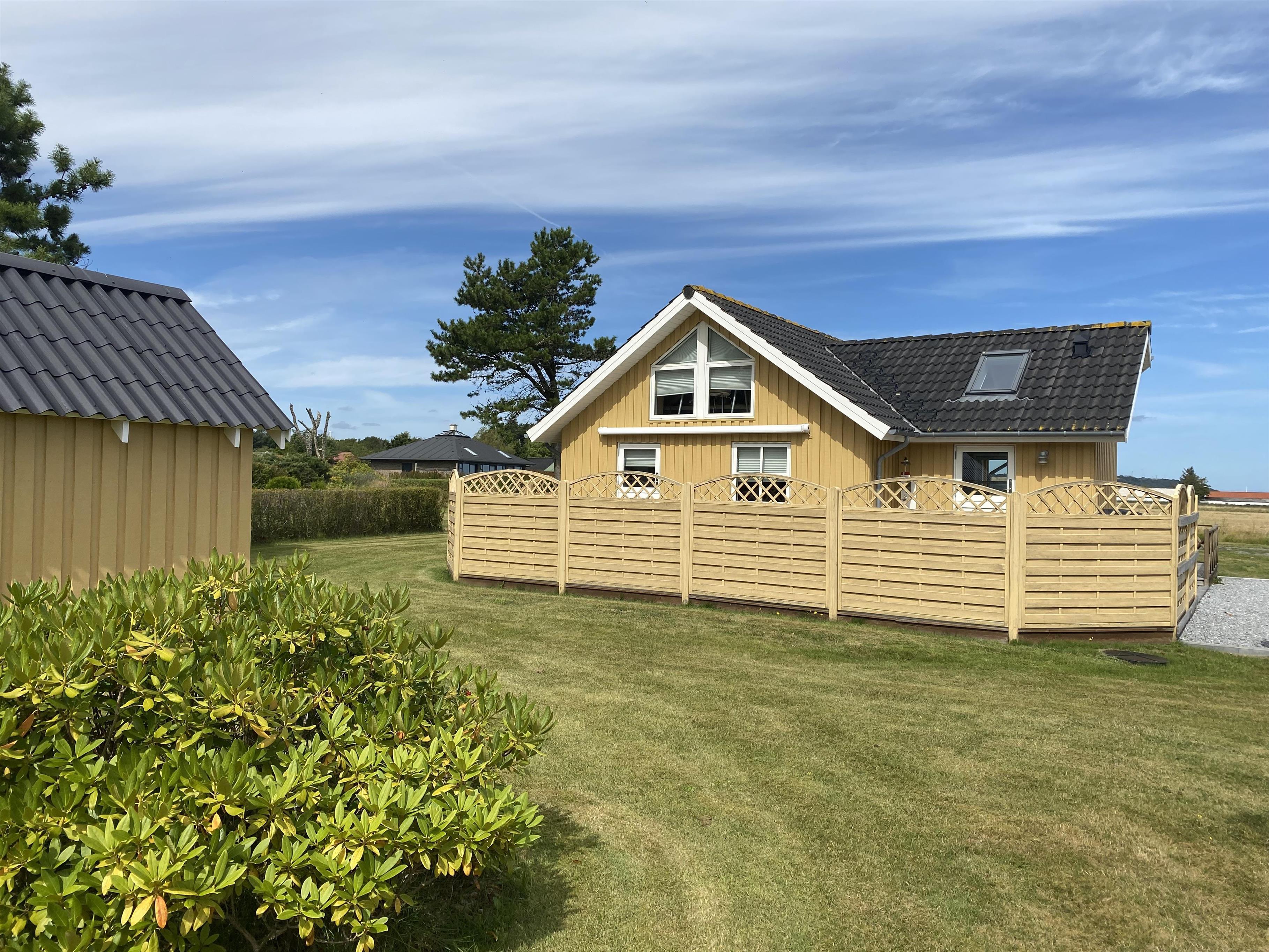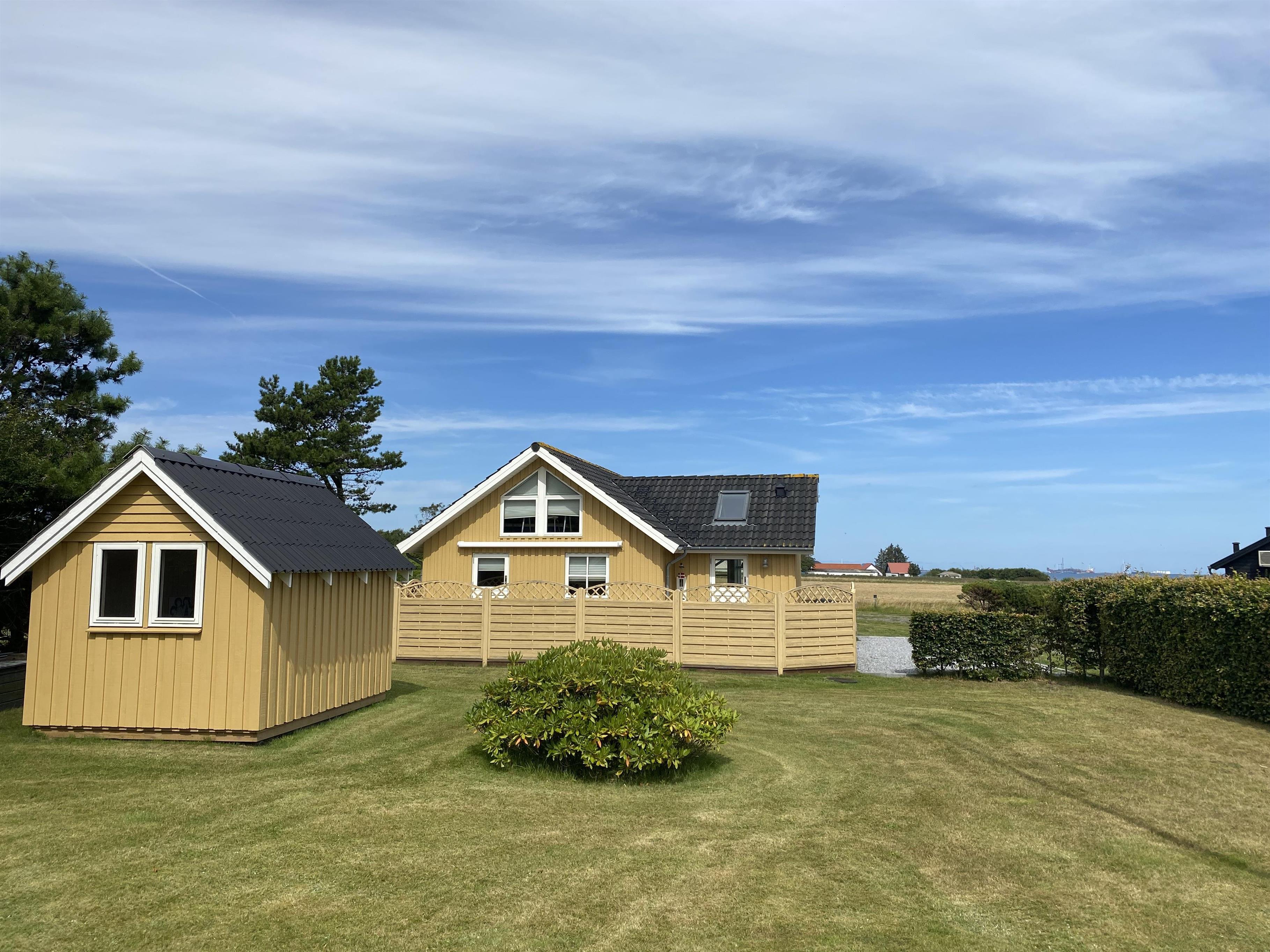 Dette hyggelige træsommerhus indbyder til samvær ude som inde, med den store græsplæne, de store terrasser og det store åbne køkken alrum. Den store træterrasse der næsten går hele vejen rundt huset, er mod syd afgrænset med et let hegn. Dette gør at man her kan side ugeneret ved terrasseborder eller i sofagruppe. Denne side af terrassen har også en stor makise (el-drevet), der giver god skygge på de varme dage. Fra huset går der en sti direkte til vandet, der ikke er mere end 175 meter væk.
