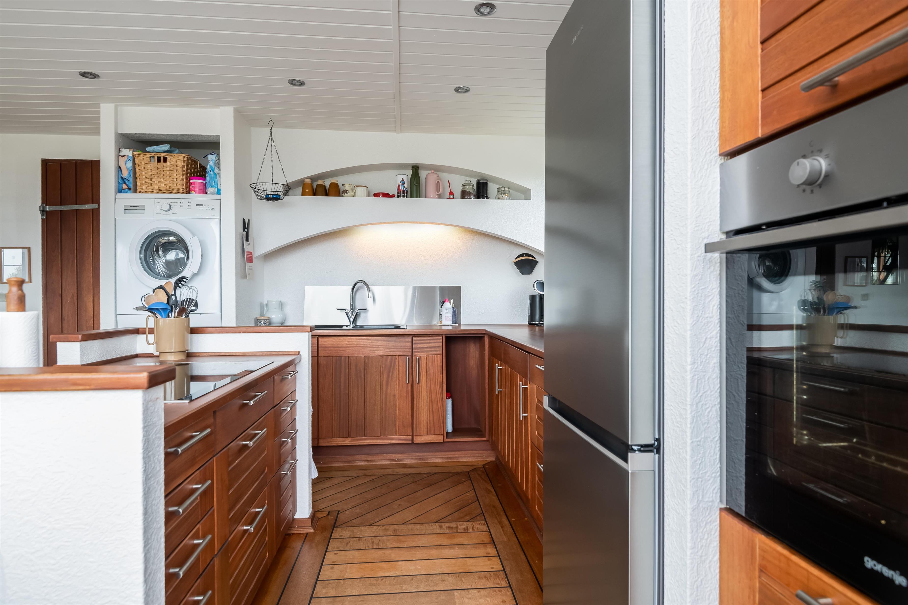 Huset har fået den store renovering i 2002, og er siden godt vedligeholdt, hvilket også ses og fornemmes. Køkkenet har opvasker, køle/frys, kaffemaskine, div. køkkenredskaber, godt med bordplads samt en køkken ø med induktionskomfur der vender mod stuedelen. Det vel derfor ikke være en ensom oplevelse at lave mad i dette hus. Badeværelset indeholder bruseniche, vaskemaskine. Desuden er der tørretumbler i udhuset.